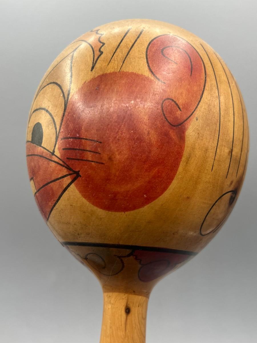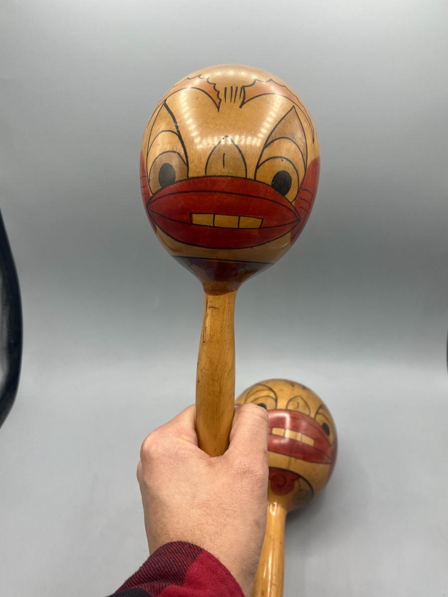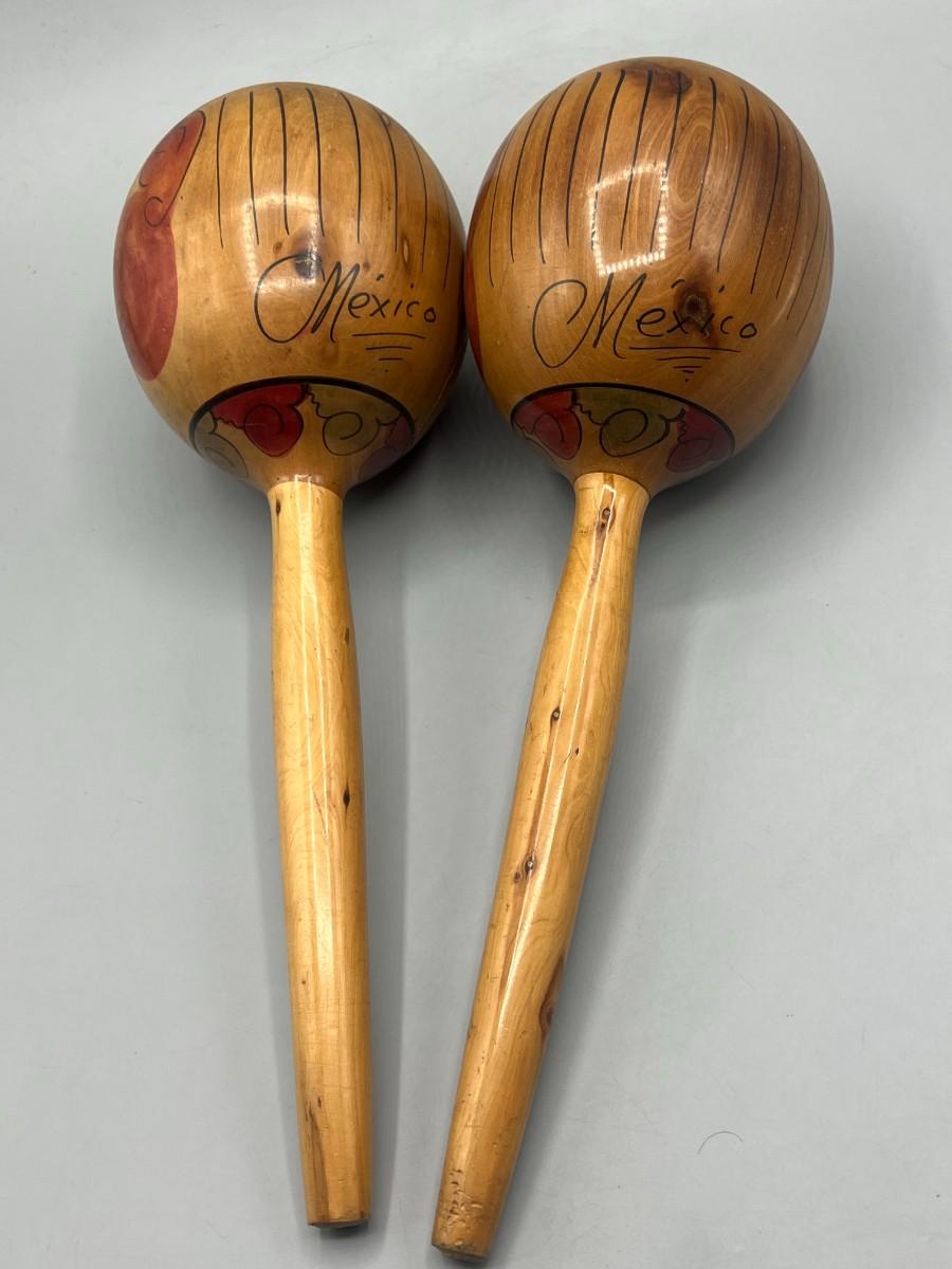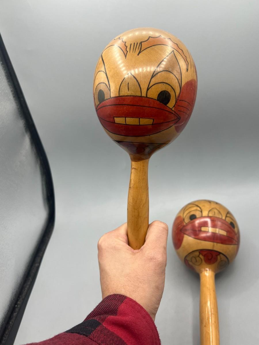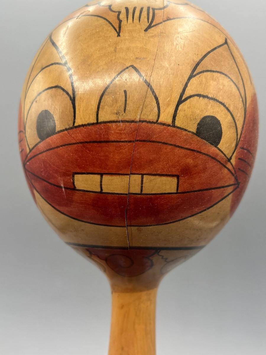 Pair of Retro Made in Mexico Ancient Face Motif Maraca Instrument Shakers