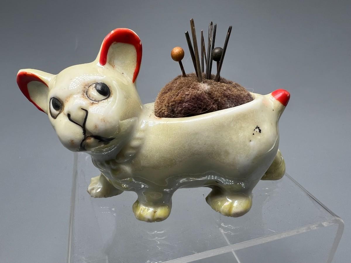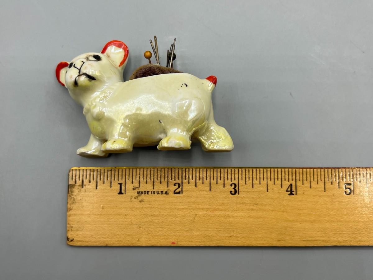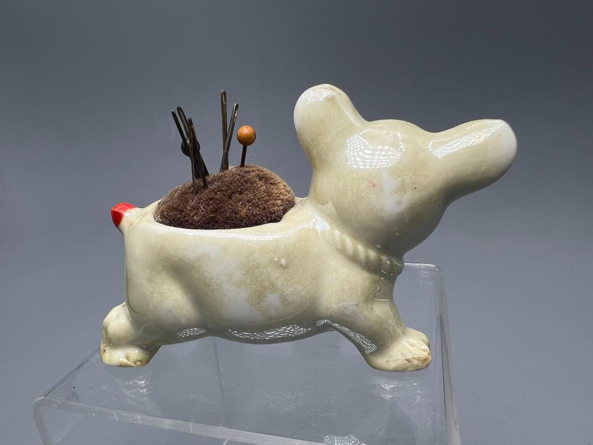 Small Vintage Ceramic Dog Figurine Sewing Needle Cushion Cottagecore Crafting Decor