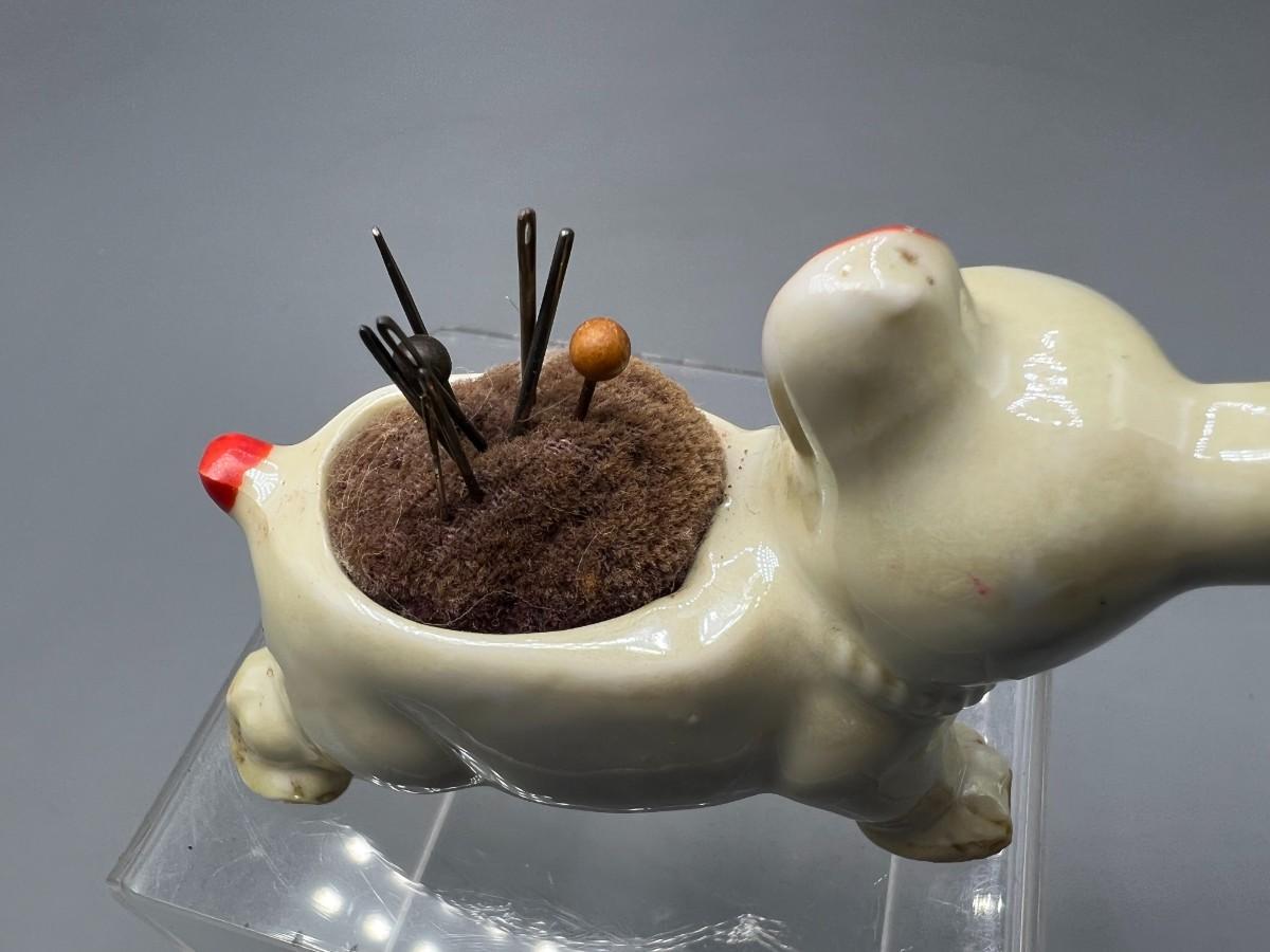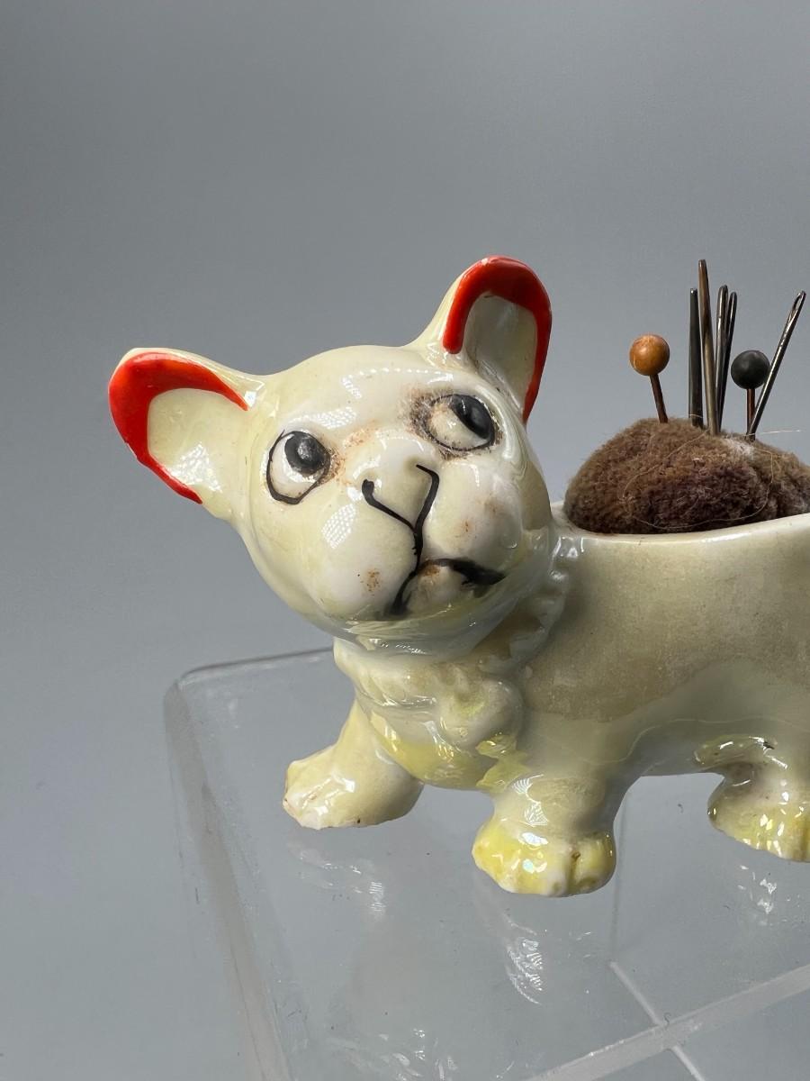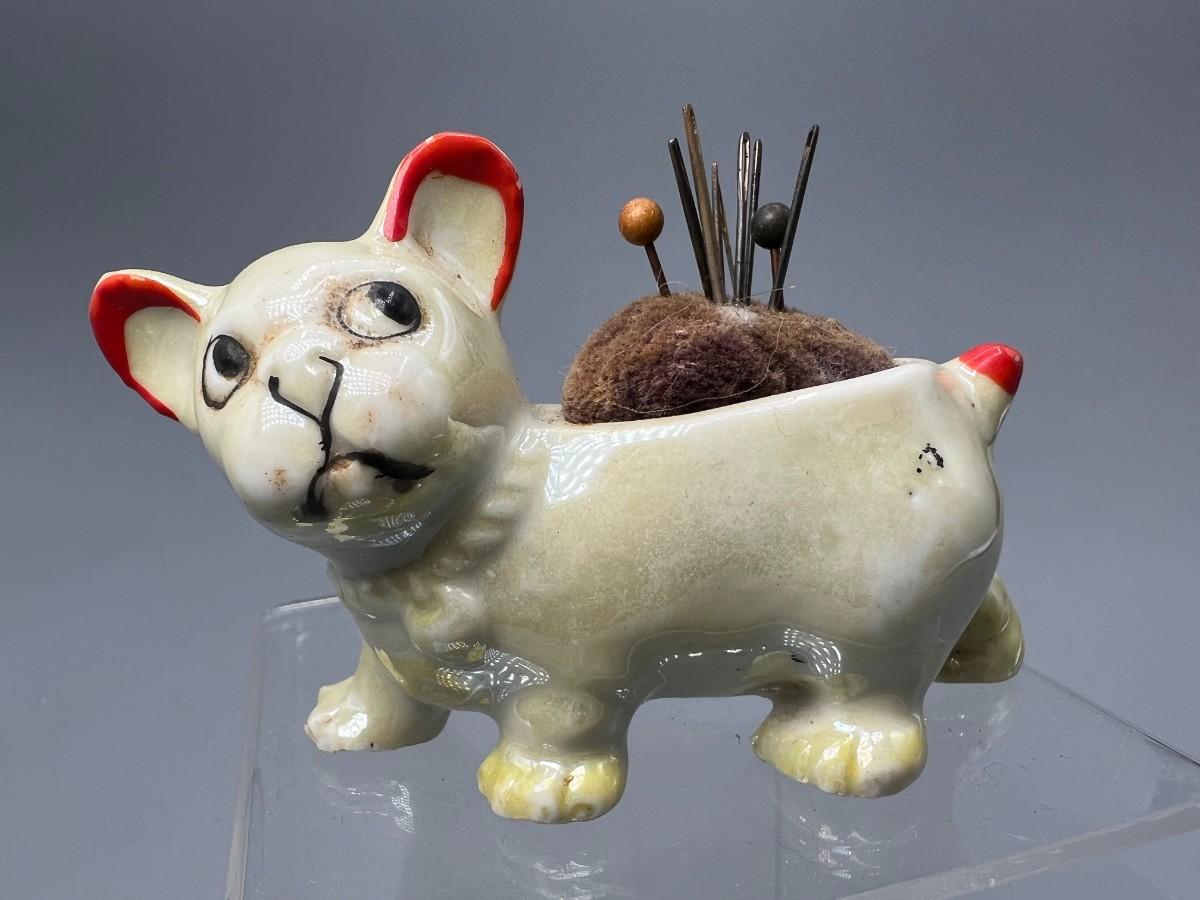 Small Vintage Ceramic Dog Figurine Sewing Needle Cushion Cottagecore Crafting Decor