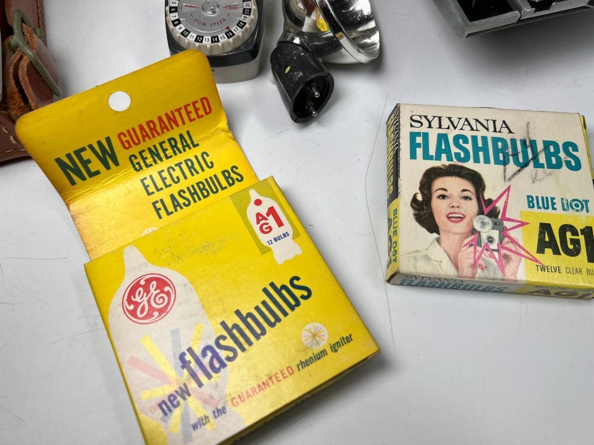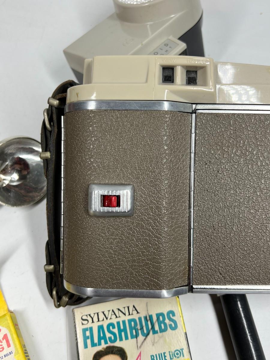 There is wear and ripping to the case, and there is some vintage wear to the camera. There is no significant damage and is in overall good collectible or useable condition. Has not been tested.