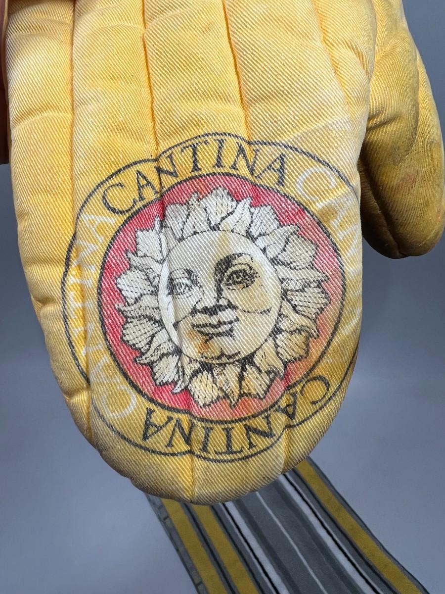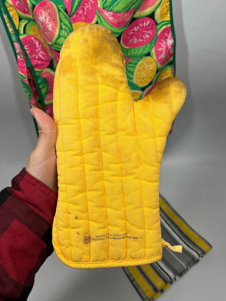 There is wear to the oven mitt and some light wear to the apron, but there is no significant damage and is in overall good useable condition. Check pictures for more details.