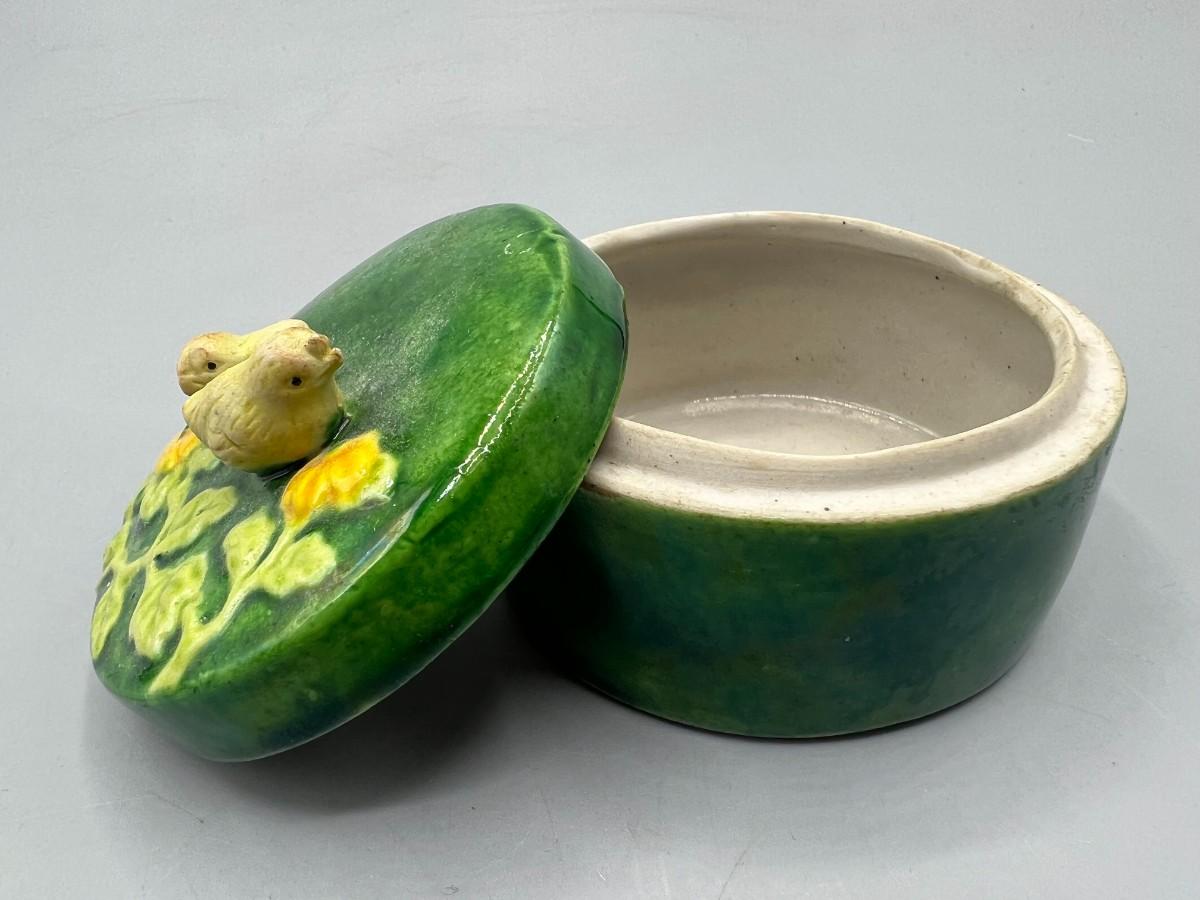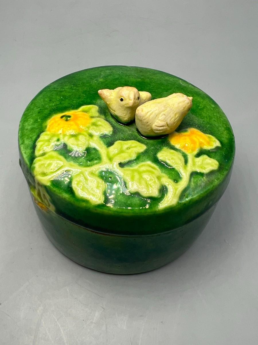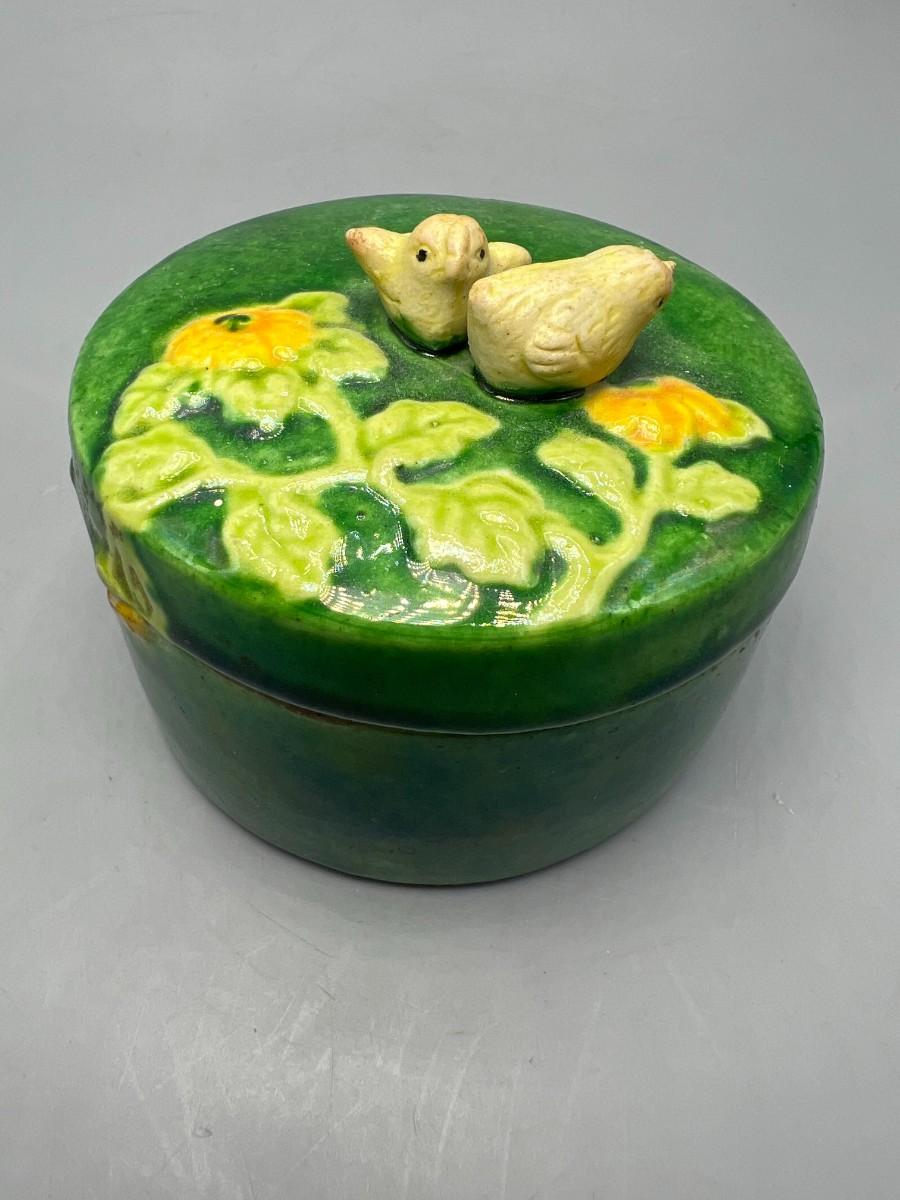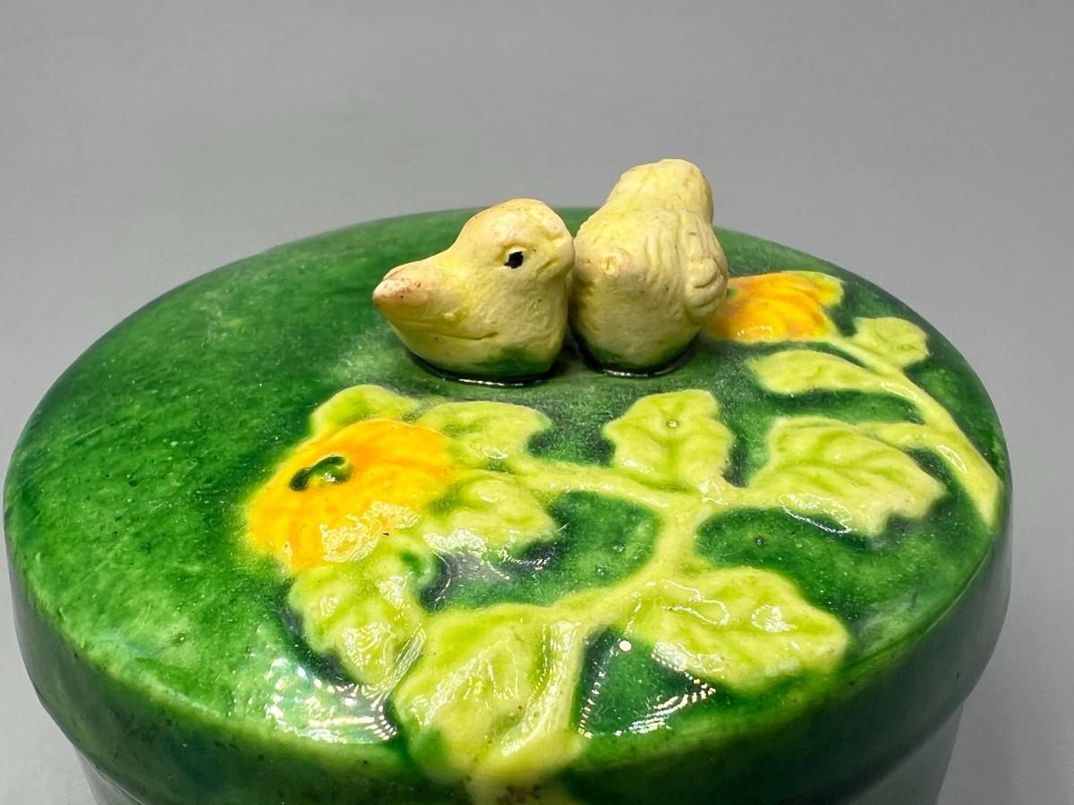 Vintage Clay Pottery Art Stamped Made in Japan Birds & Flowers Motif Lidded Trinket Dish