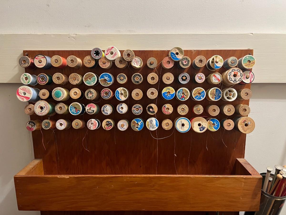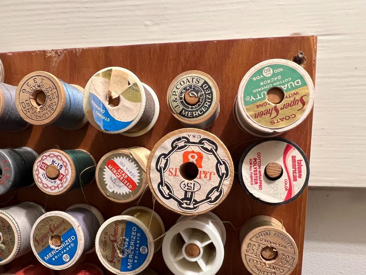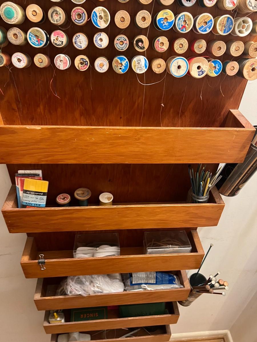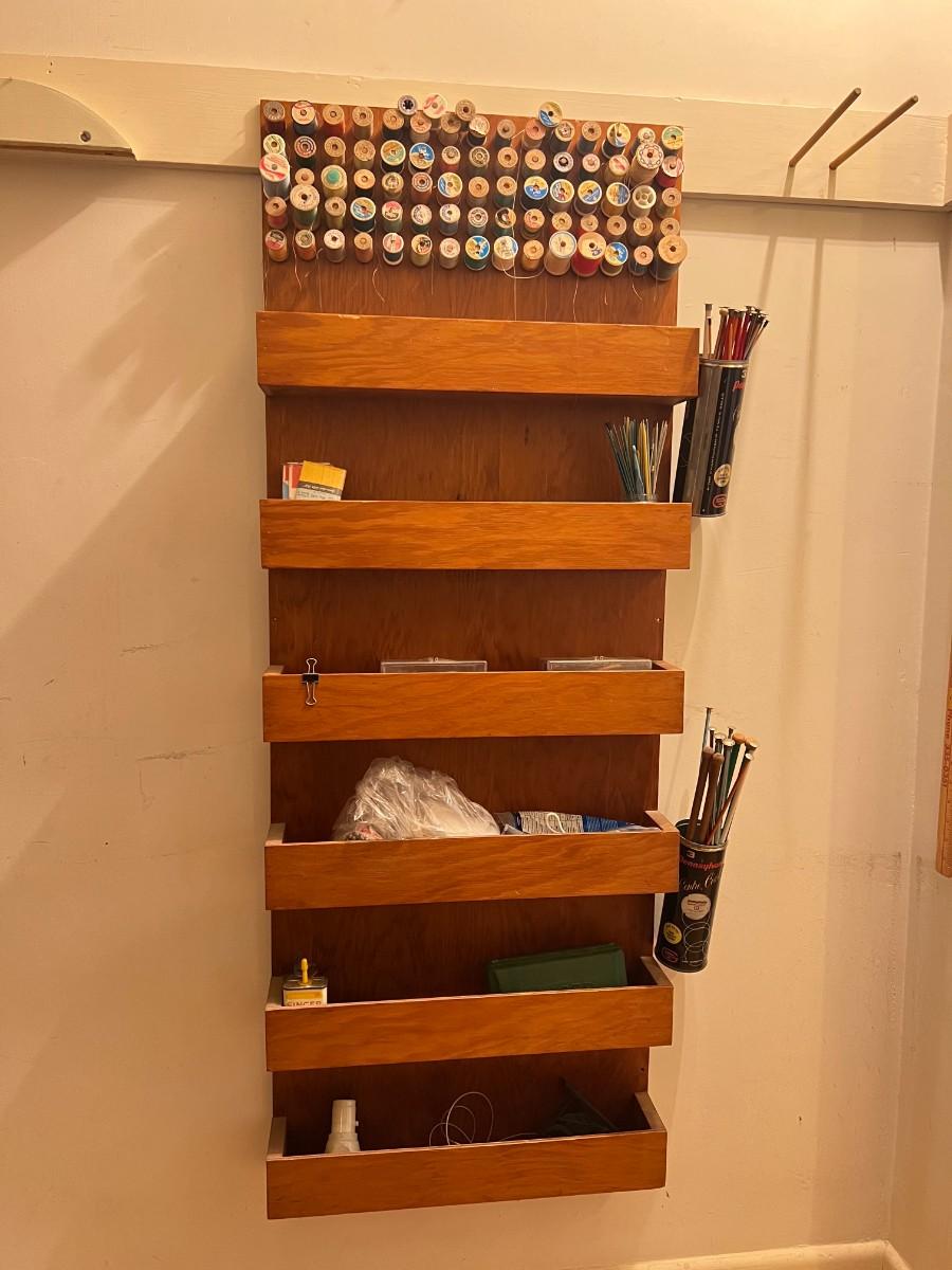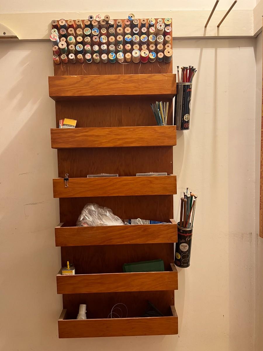 Vintage Wooden Wall Hanging Shelf Organizer with Crafting Supplies Sewing Threads, Knitting Needles, and More