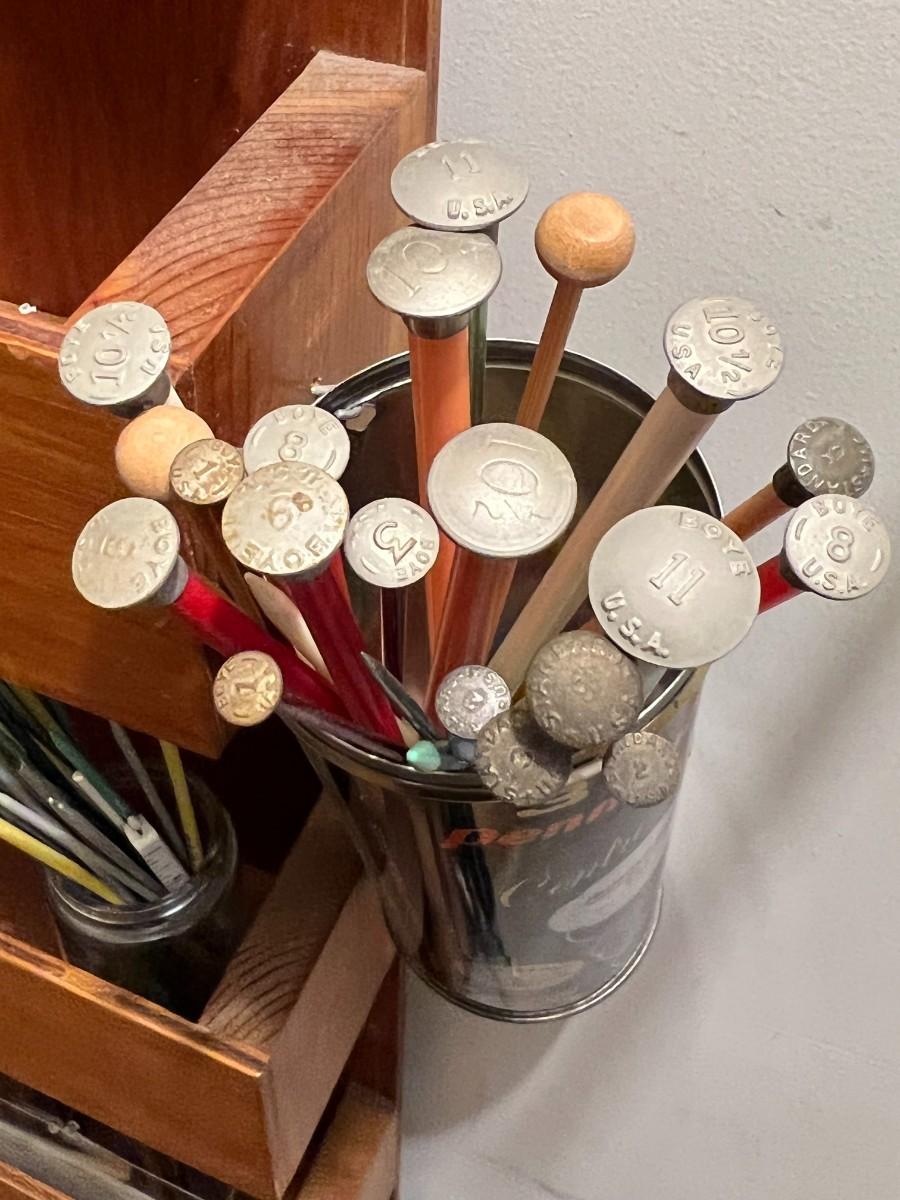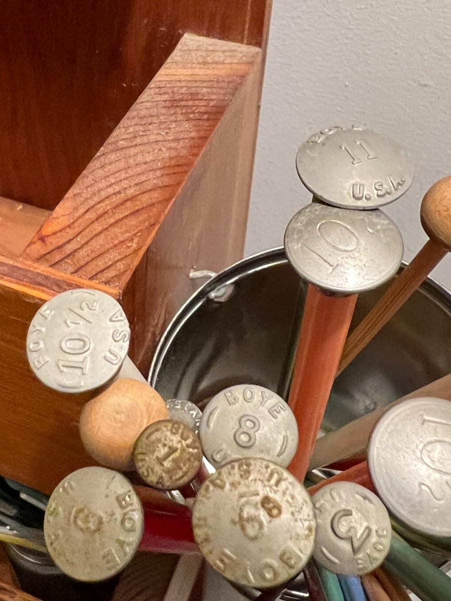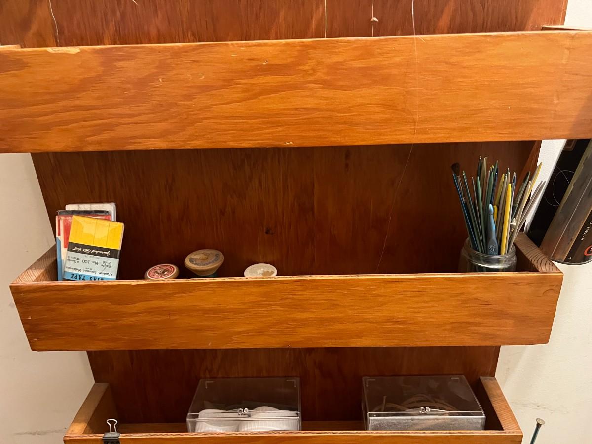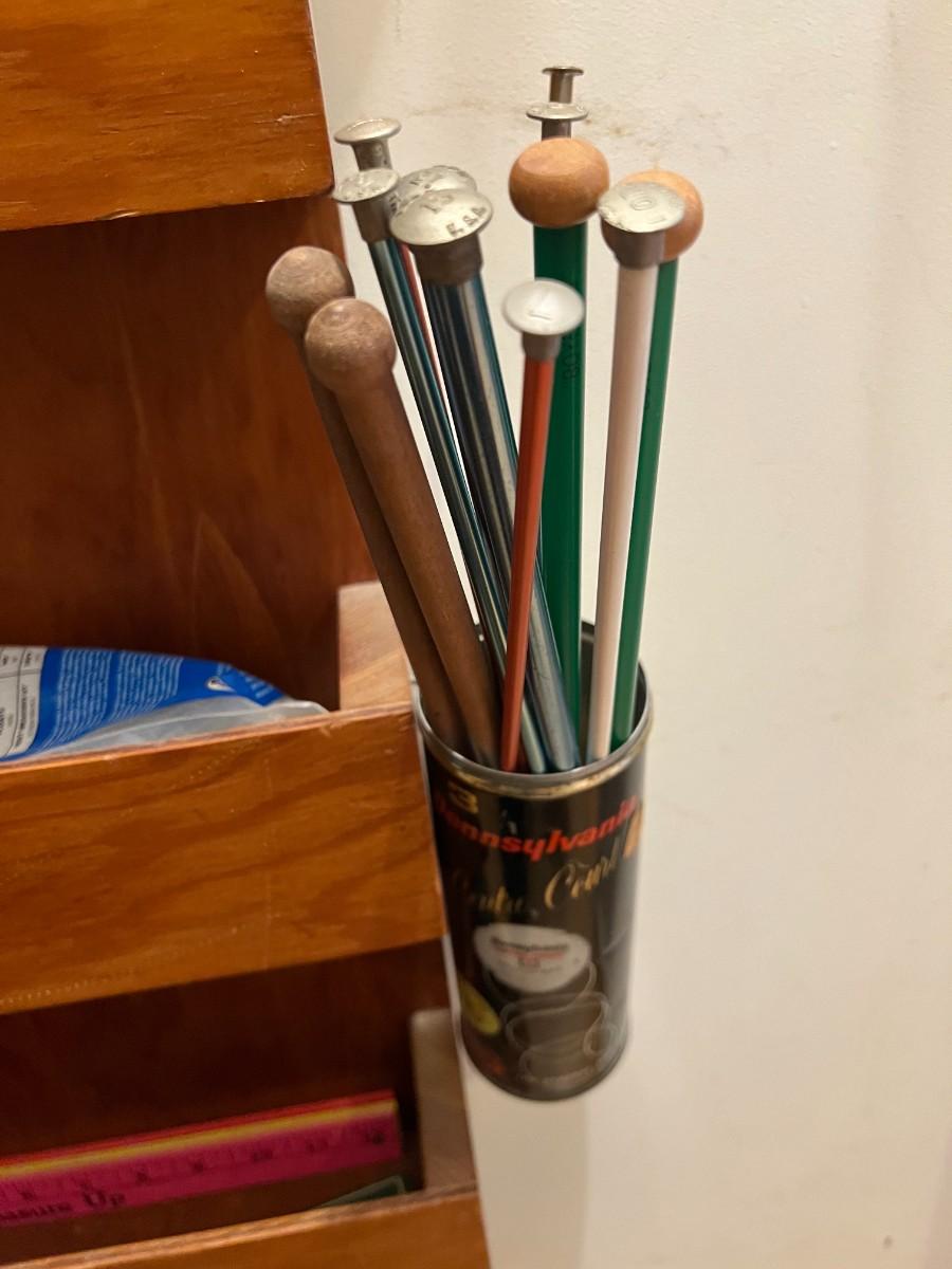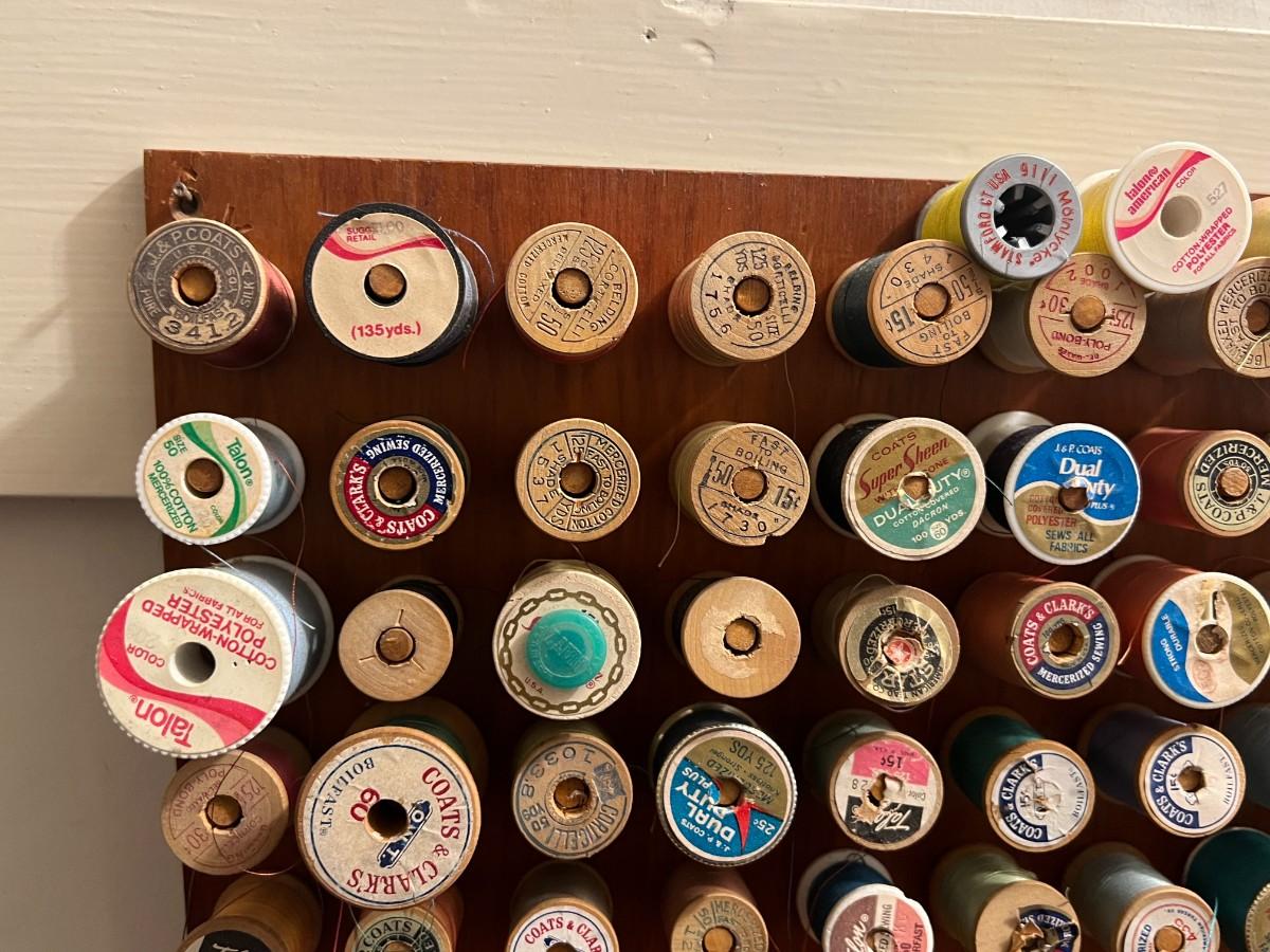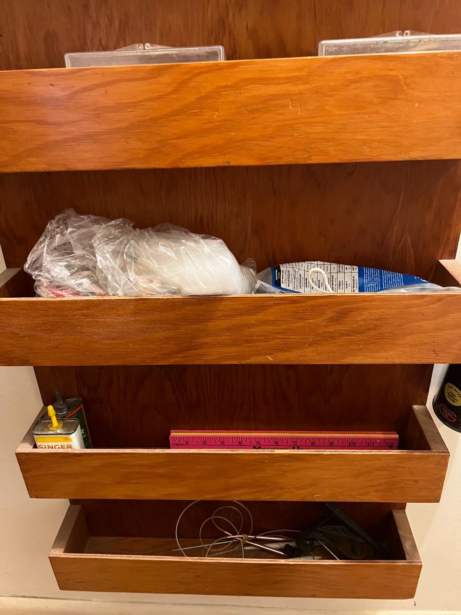 Vintage Wooden Wall Hanging Shelf Organizer with Crafting Supplies Sewing Threads, Knitting Needles, and More