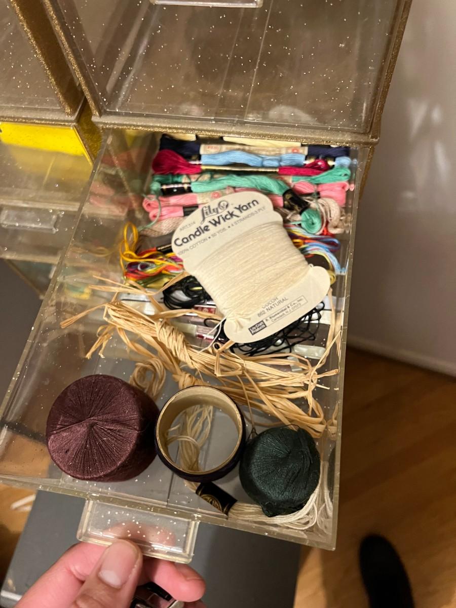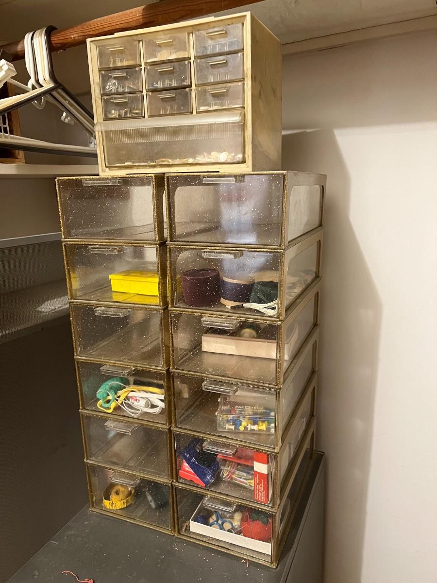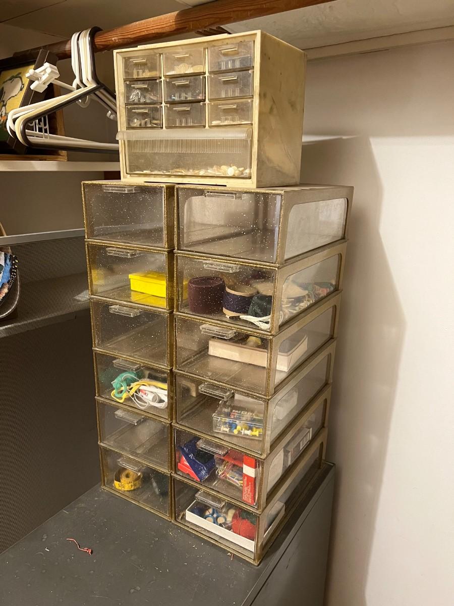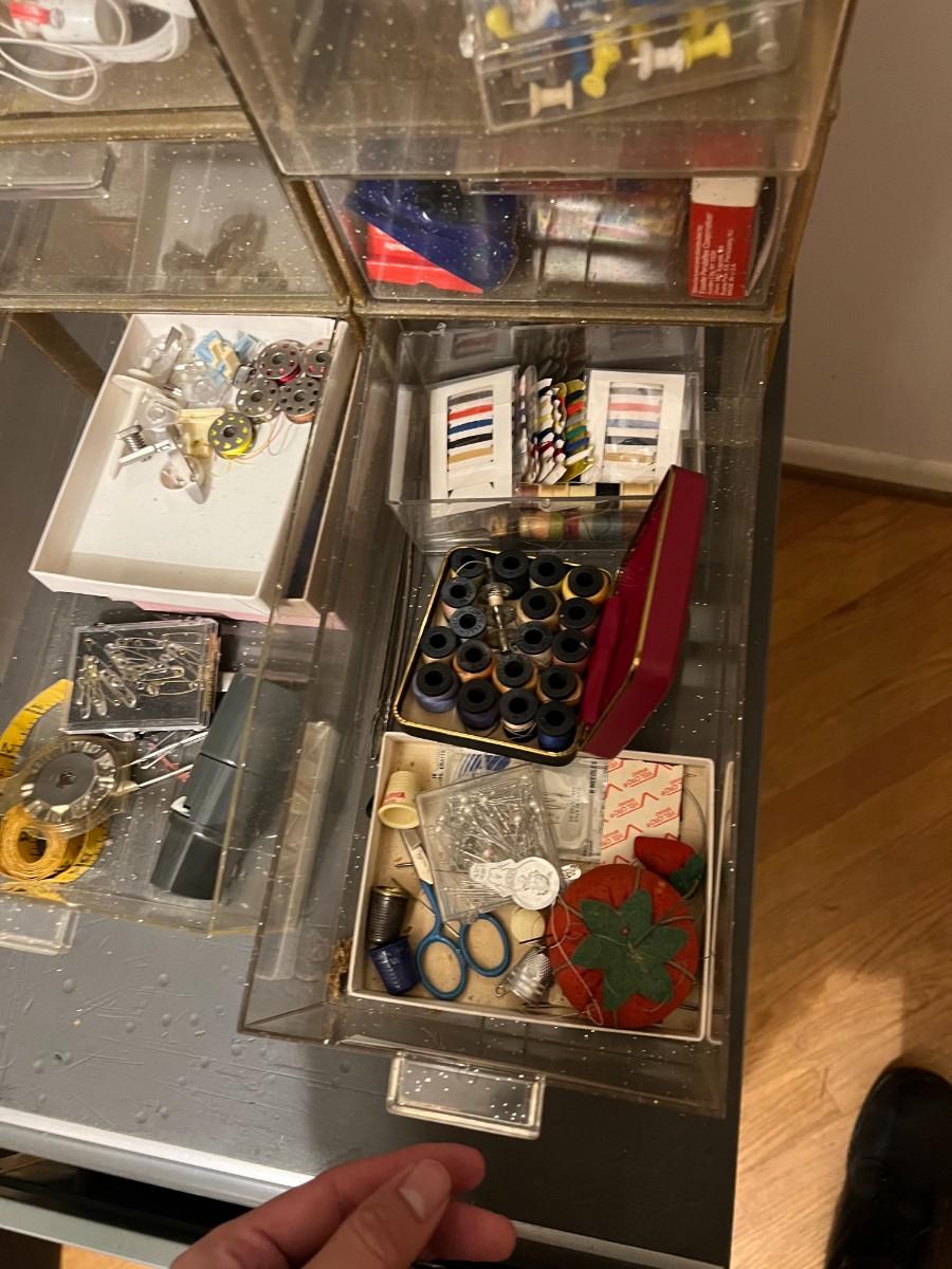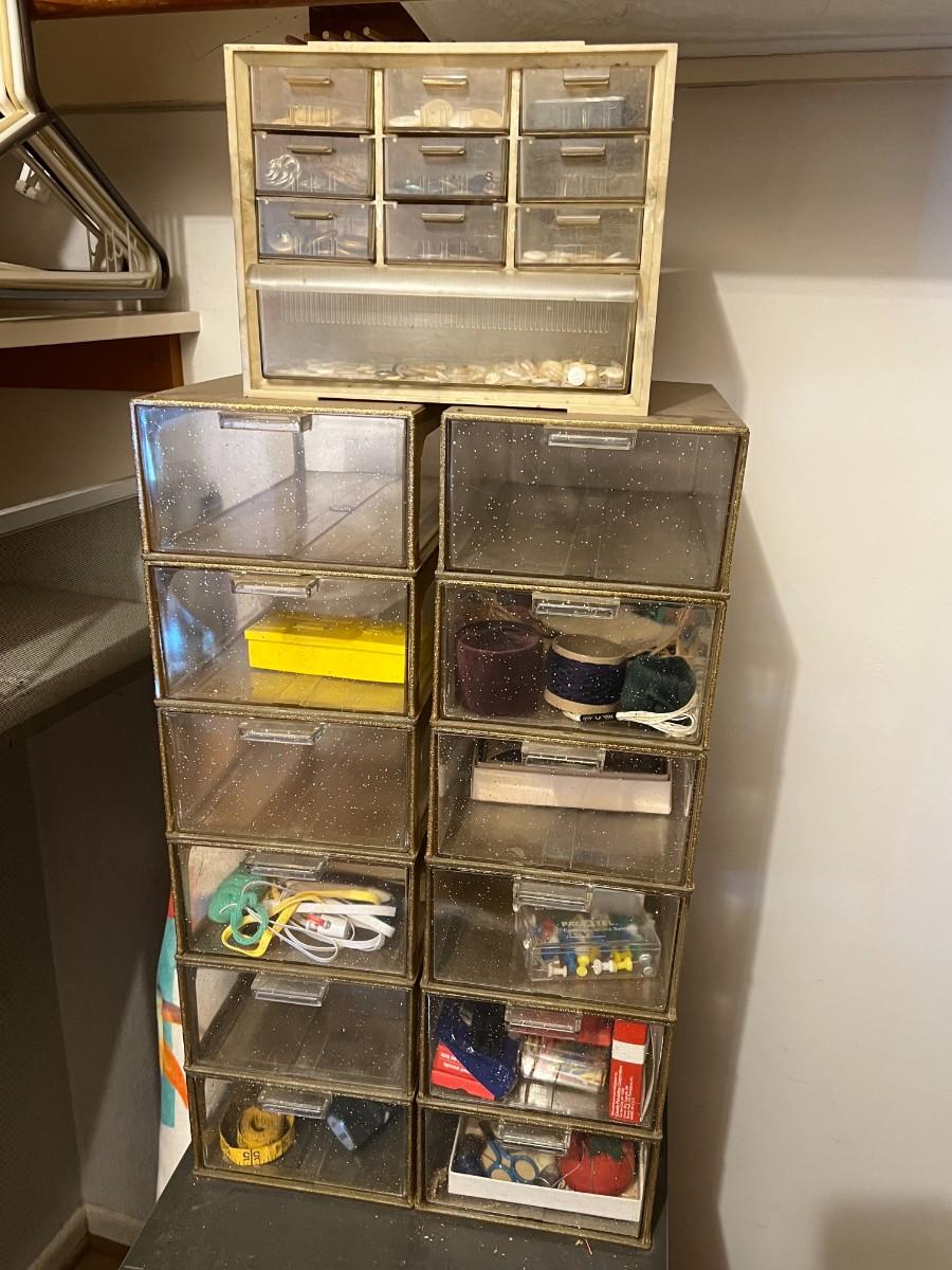Plastic Organizer Bins with Sewing and Craft Supplies Notions Accessories. Some drawers are empty. See photos of included items.