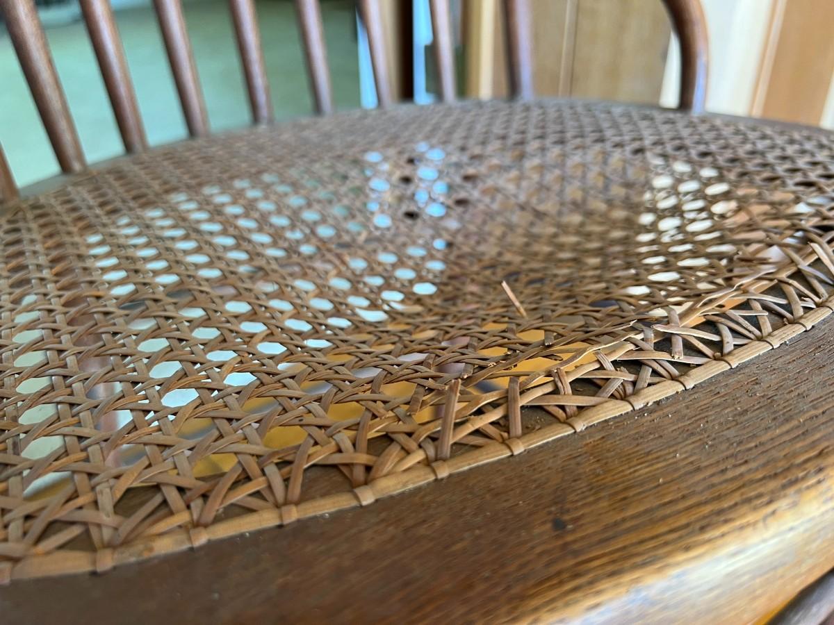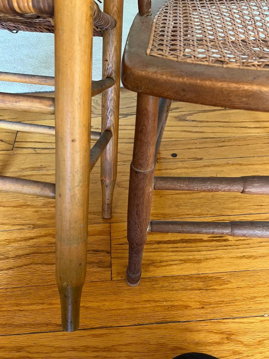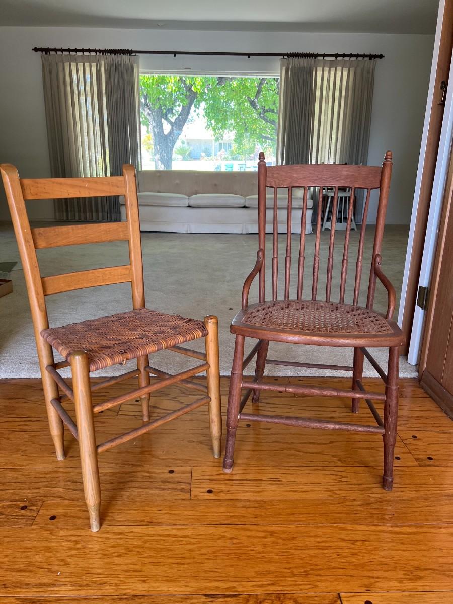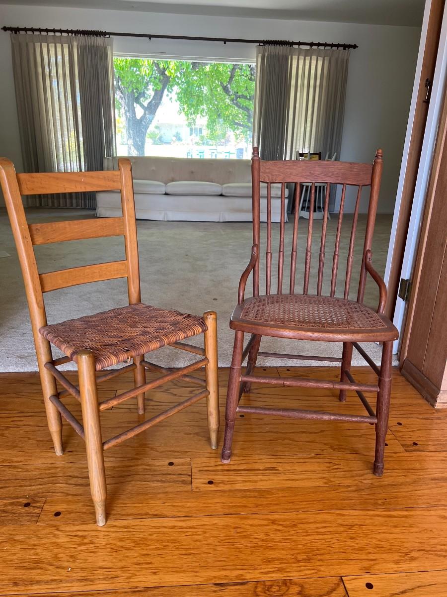 Pair of Vintage Cane Ratan Woven Seat Wood Side Dining Chairs. Mismatched set. In vintage condition.