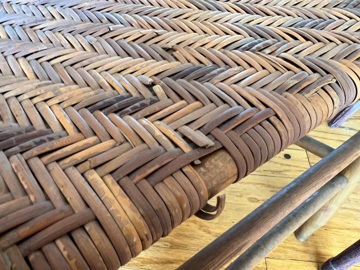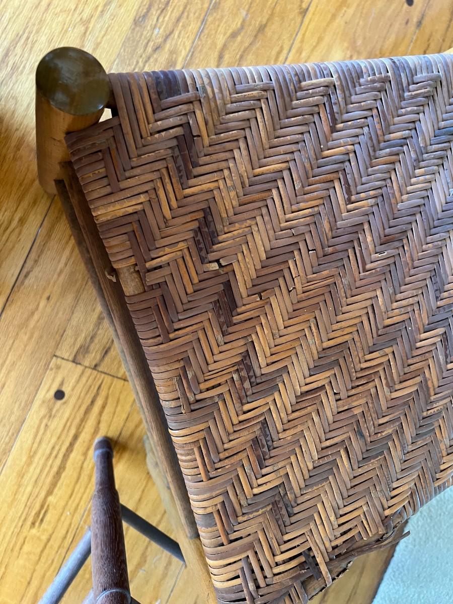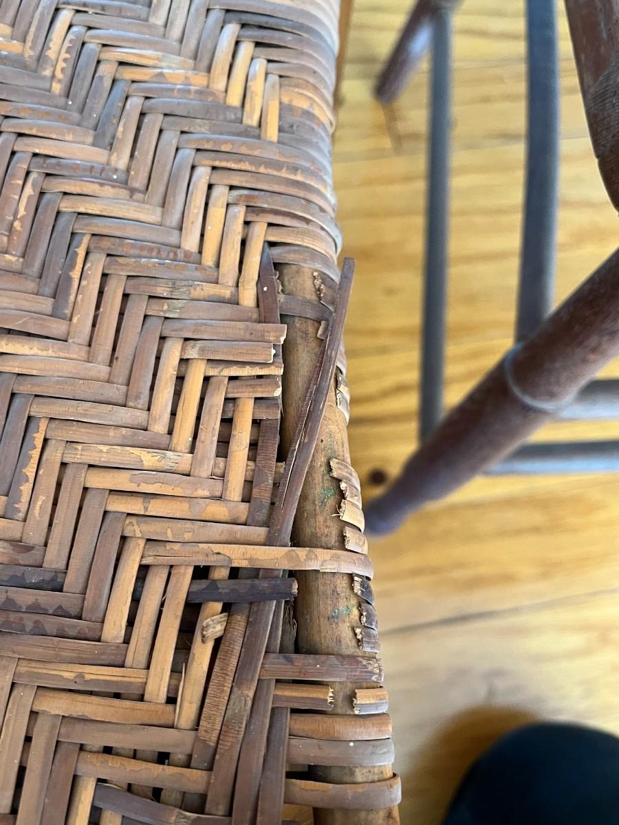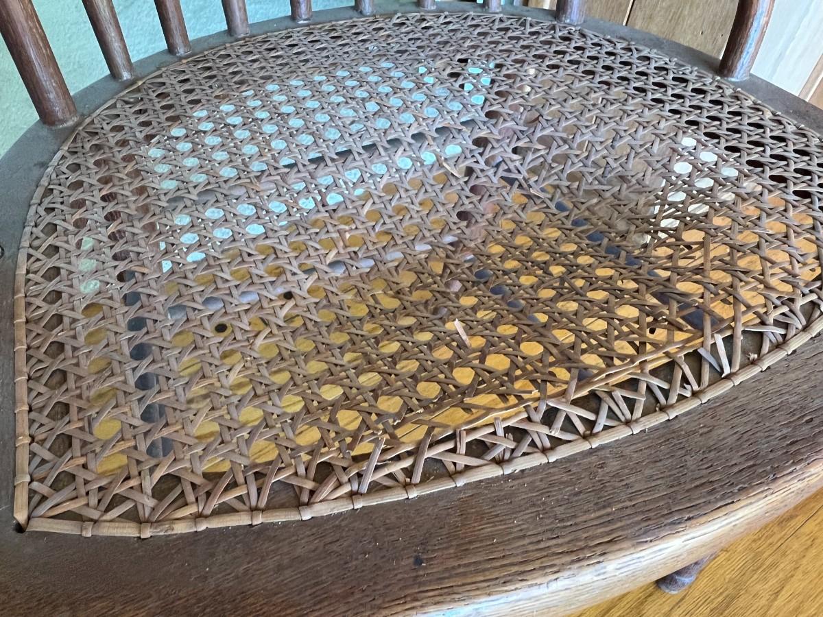 Pair of Vintage Cane Ratan Woven Seat Wood Side Dining Chairs. Mismatched set. In vintage condition.