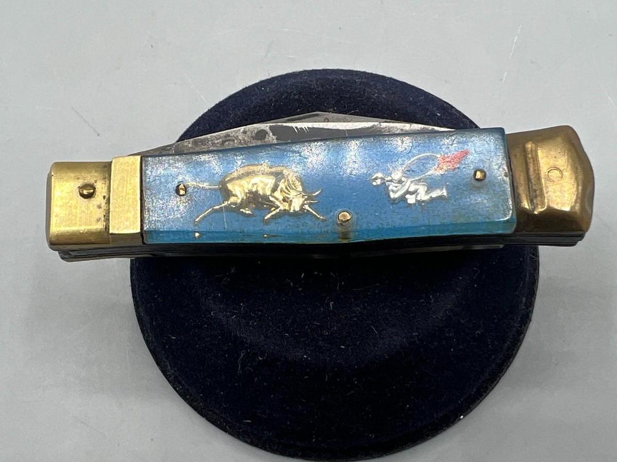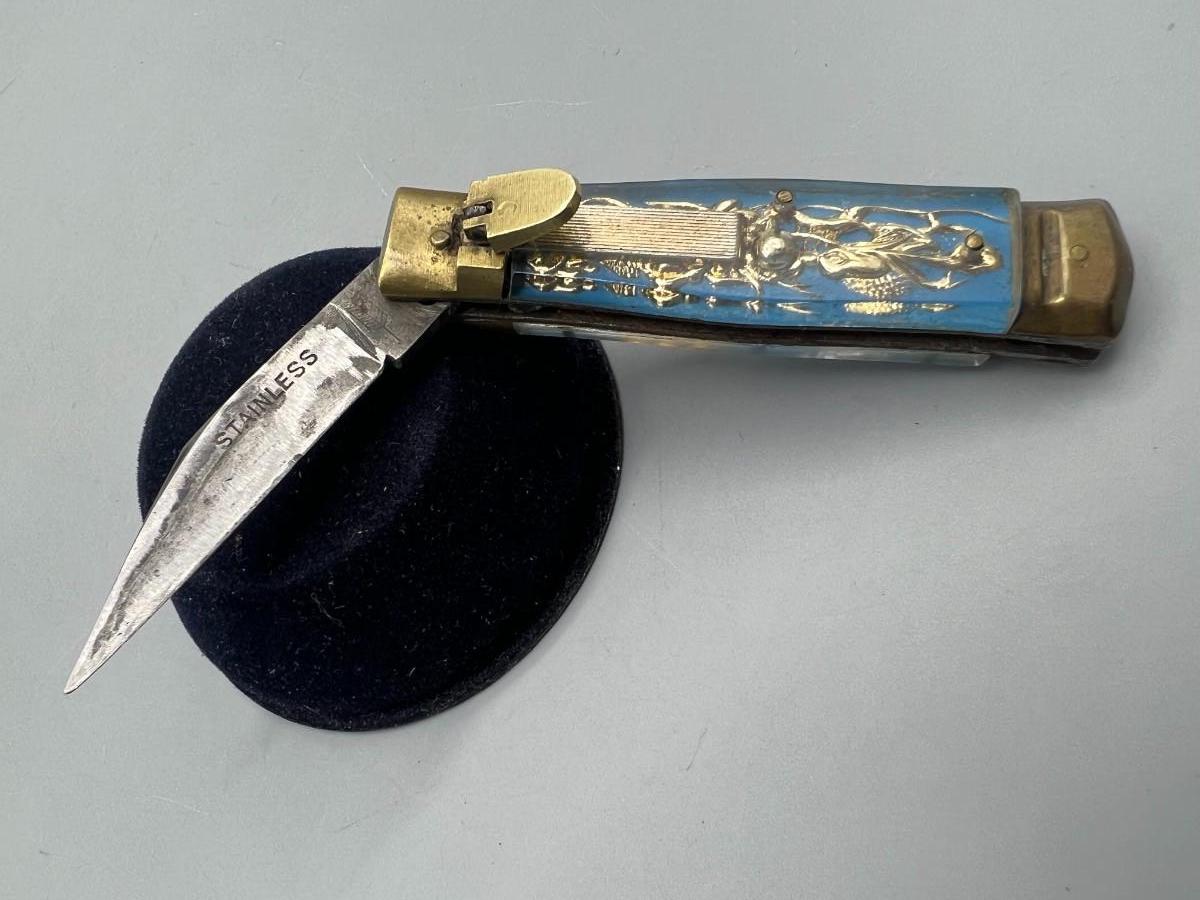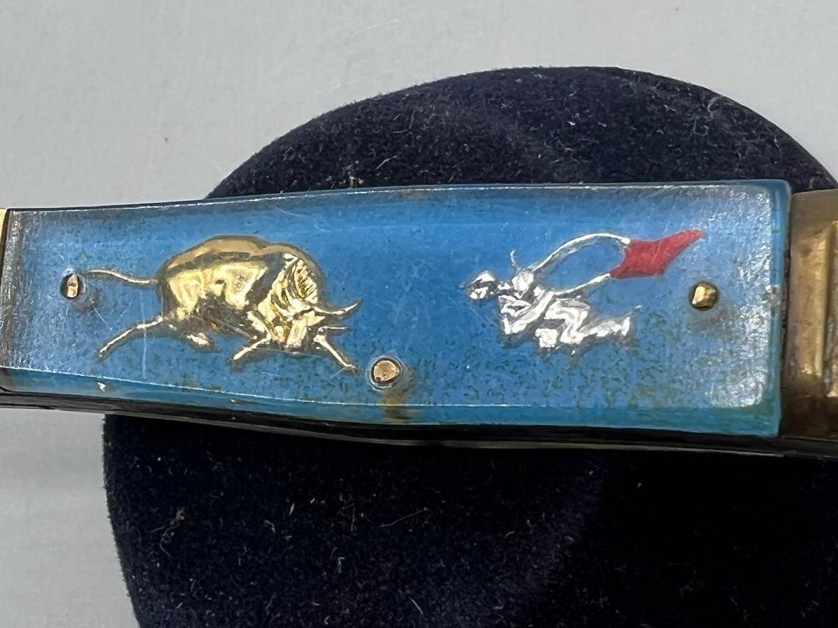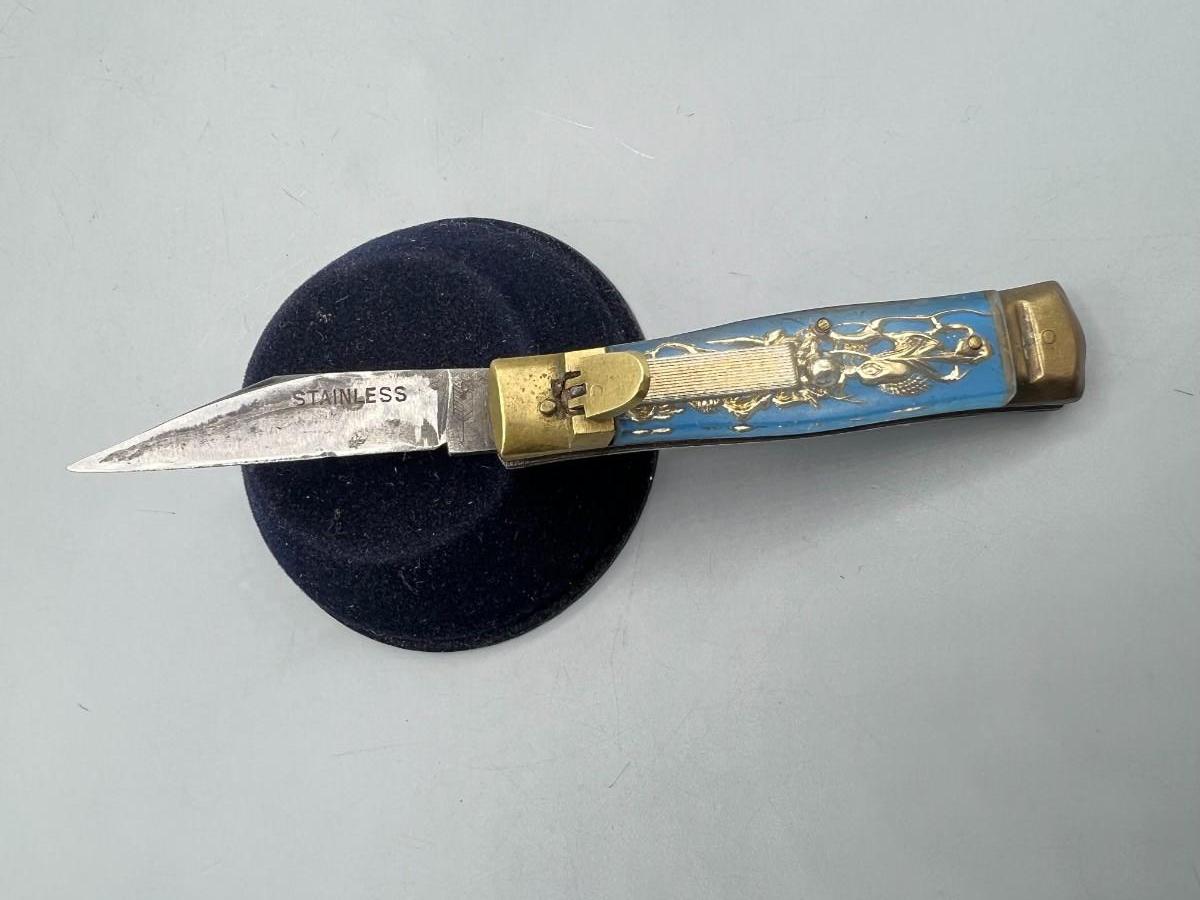 Vintage Stainless Steel Spring Spanish Style Bullfighting Motif Switch Knife Blade