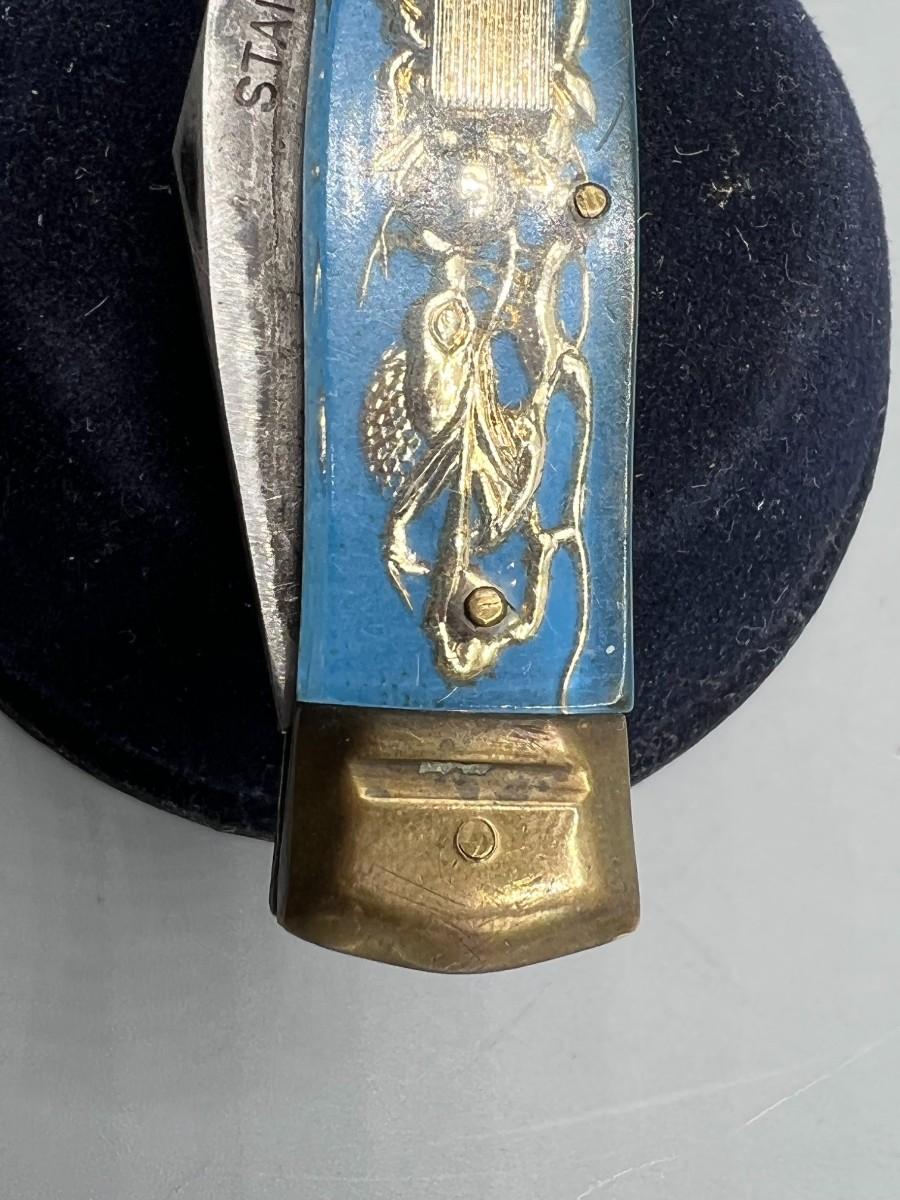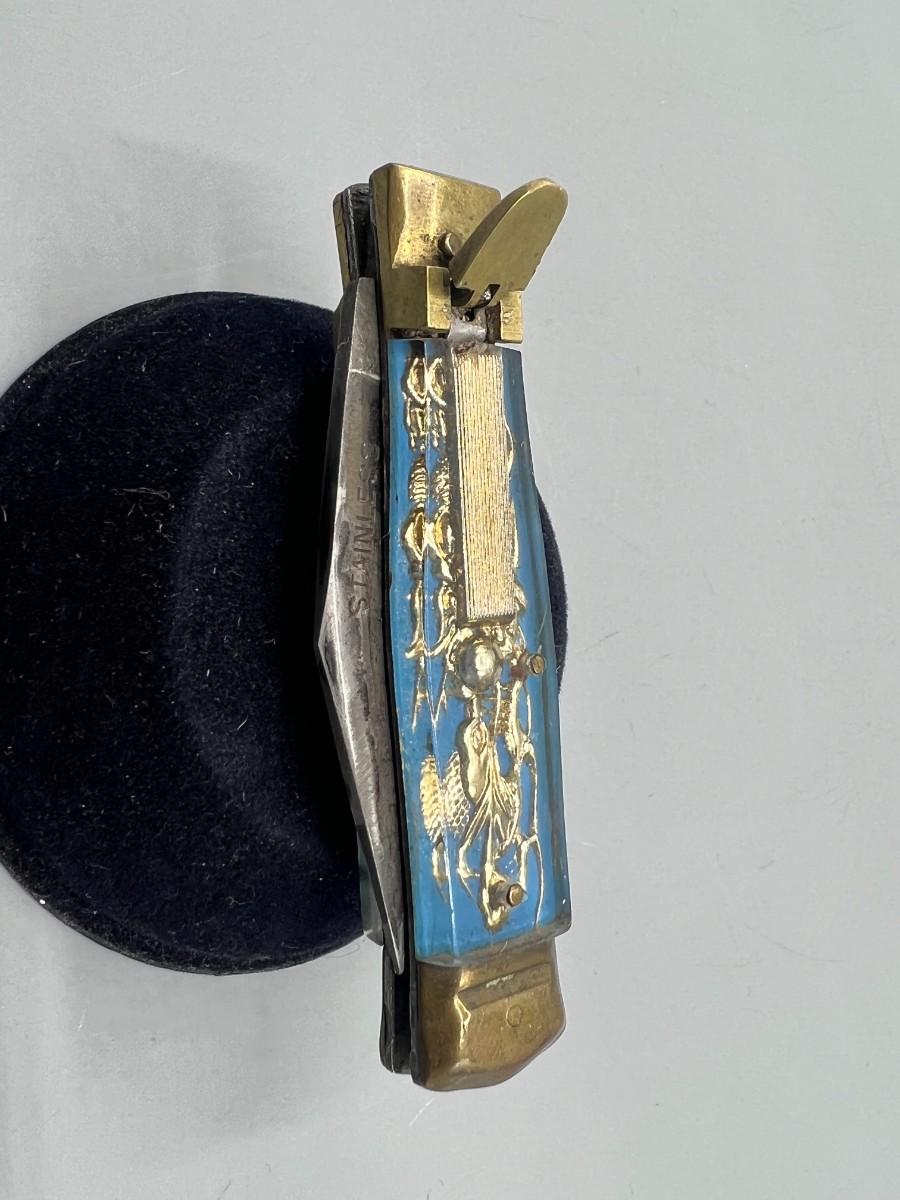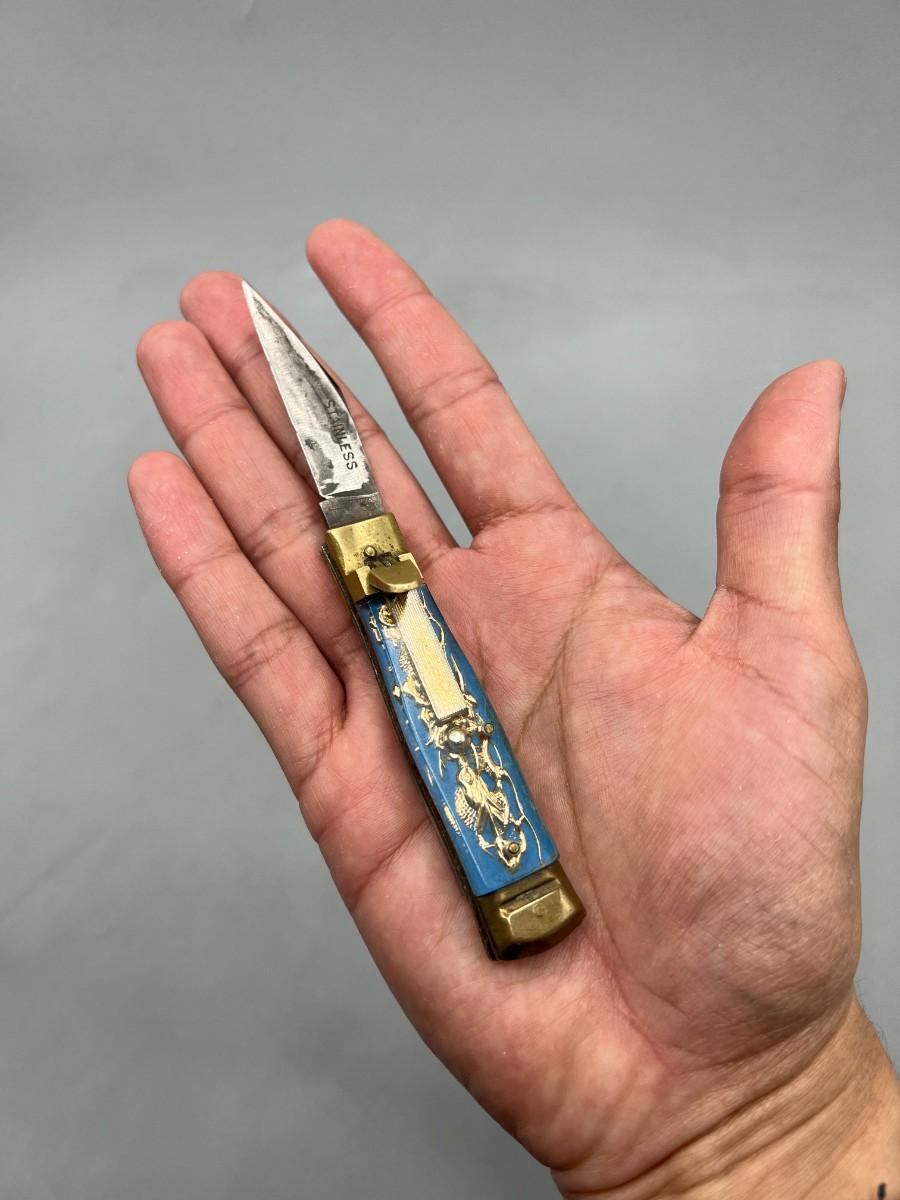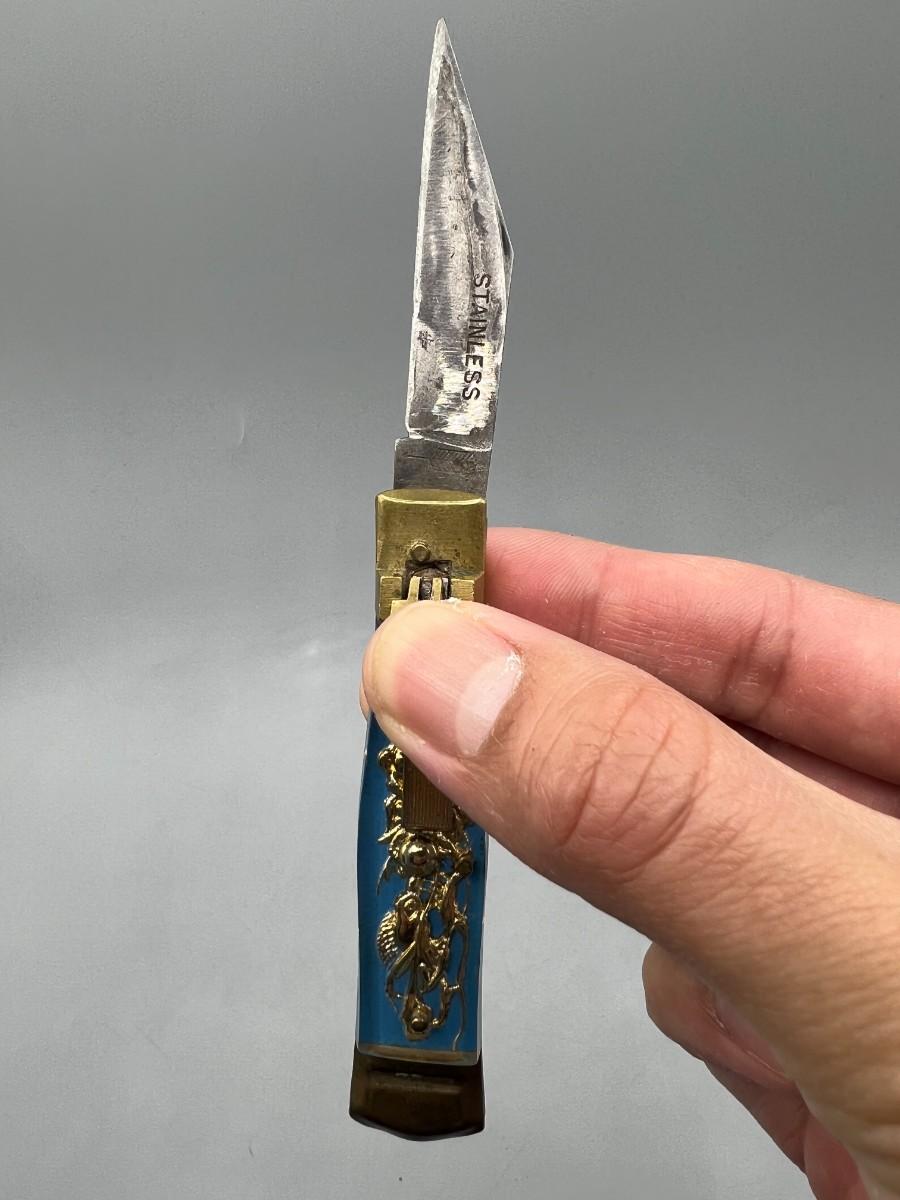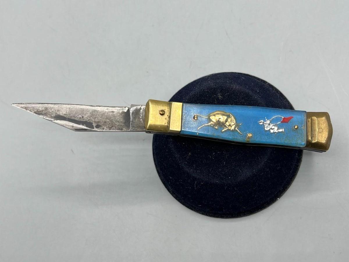 Vintage Stainless Steel Spring Spanish Style Bullfighting Motif Switch Knife Blade
