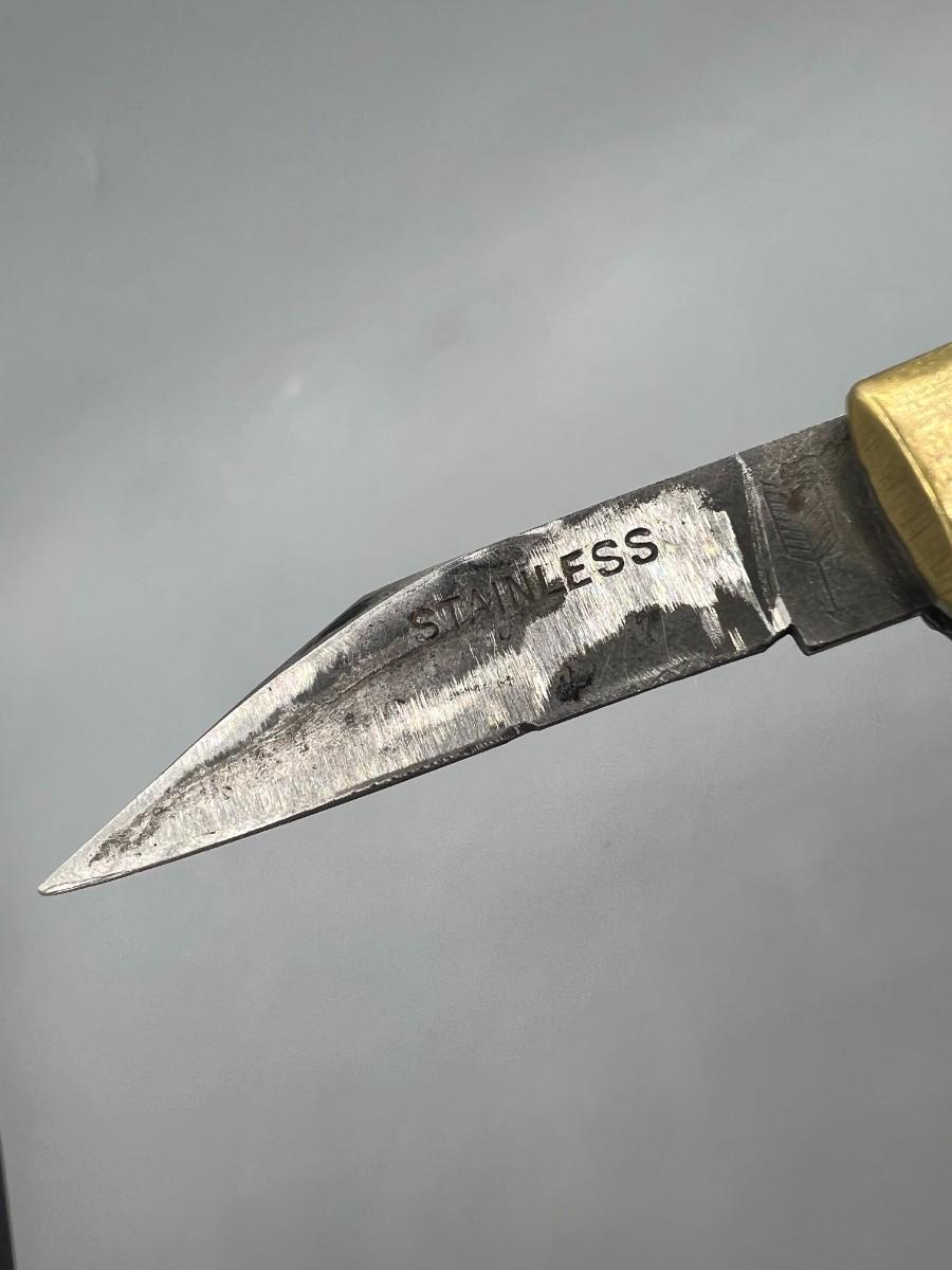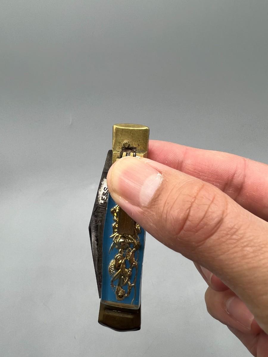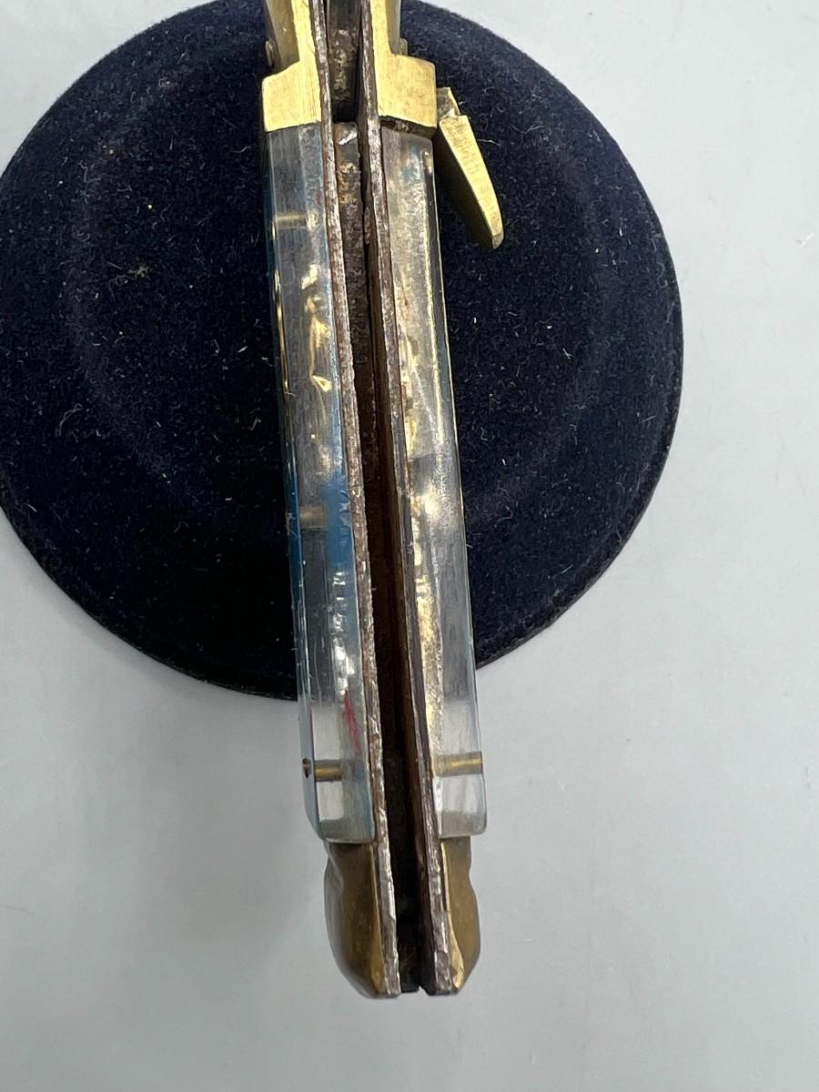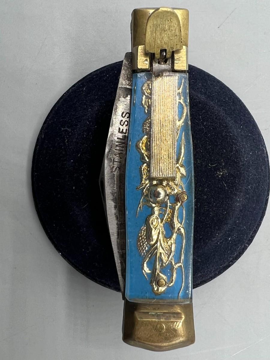 There is noticeable vintage wear to the knife, but there is no significant damage and is in overall good collectible condition. The blade flips out when the button is pressed and works perfectly. Check pictures for more details and for sizing.