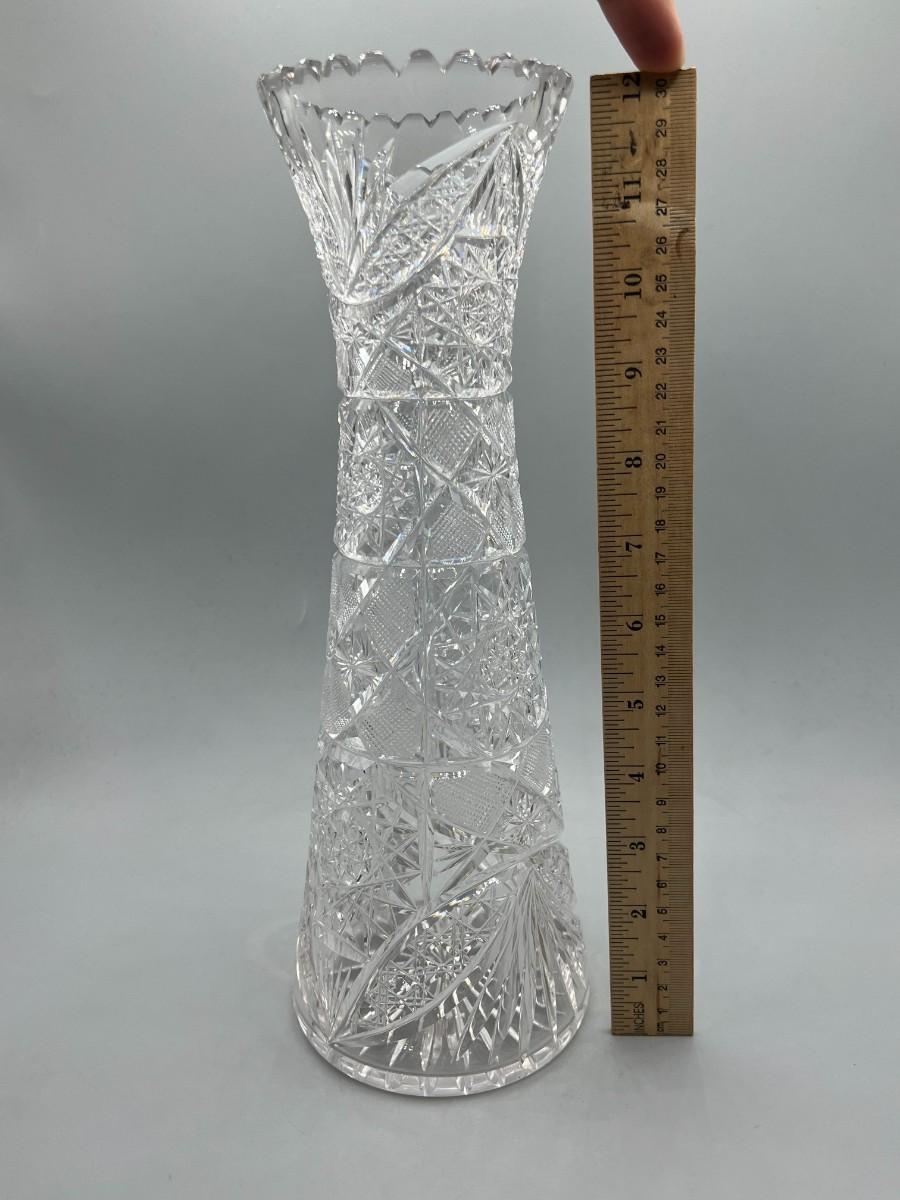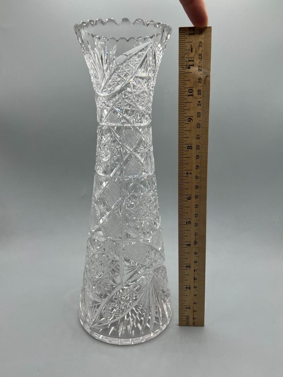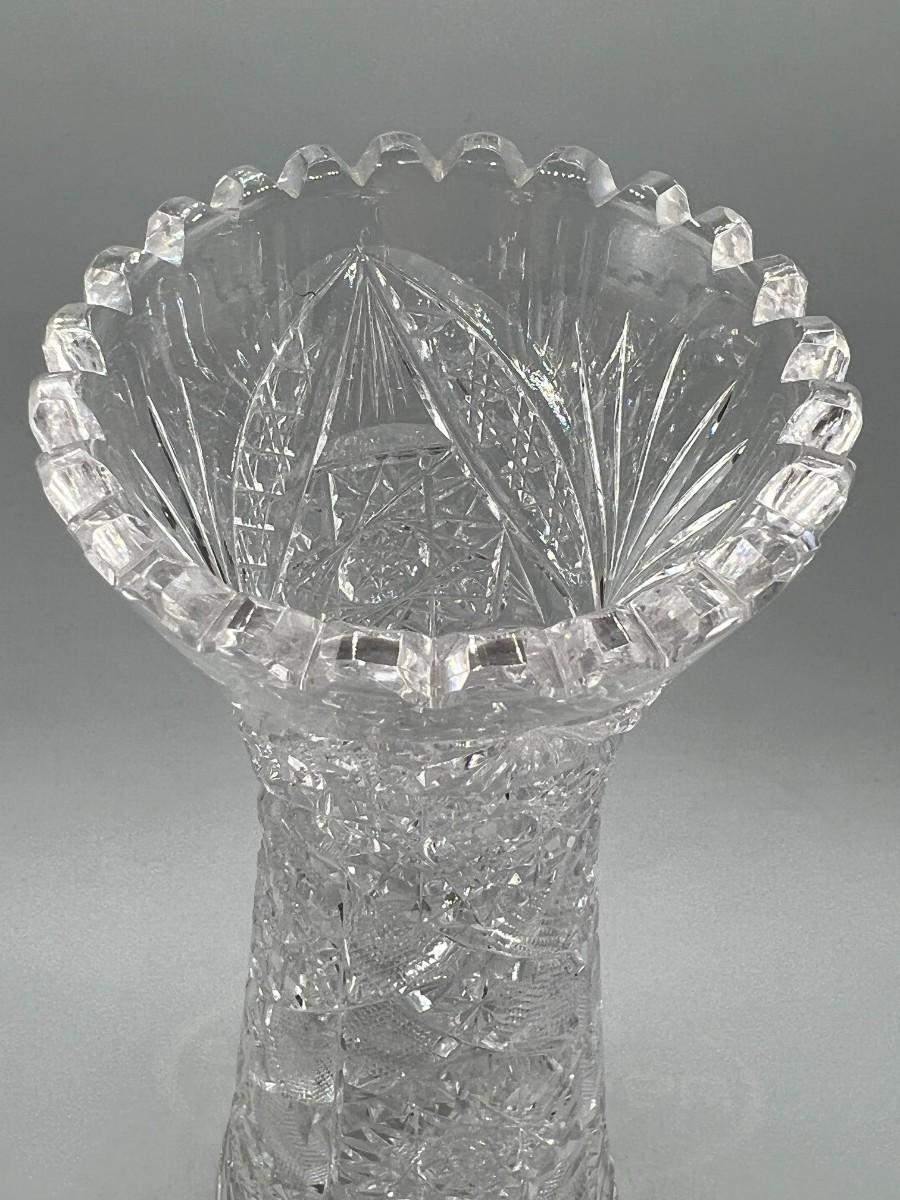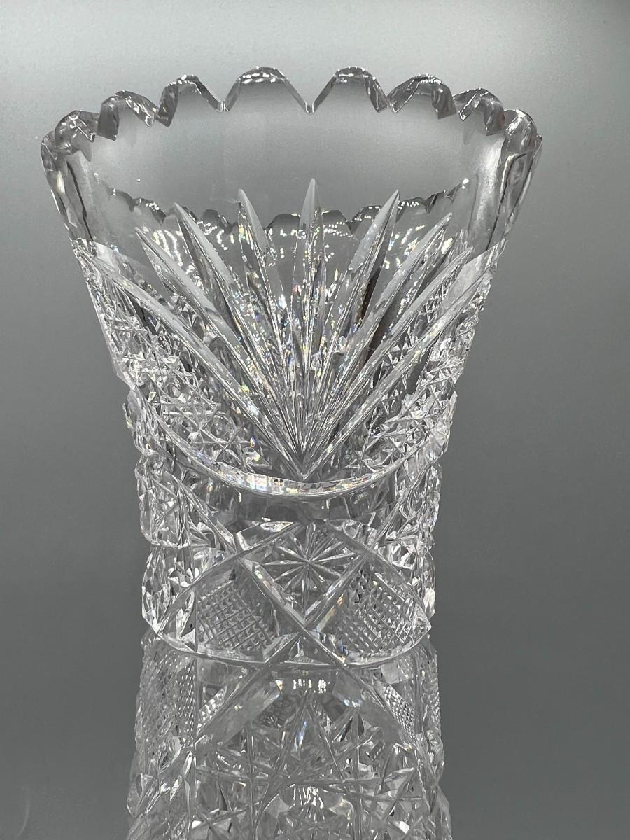 Large Vintage Cut Crystal Sawtooth Edge Flower Vase. In good condition. About 12" size.