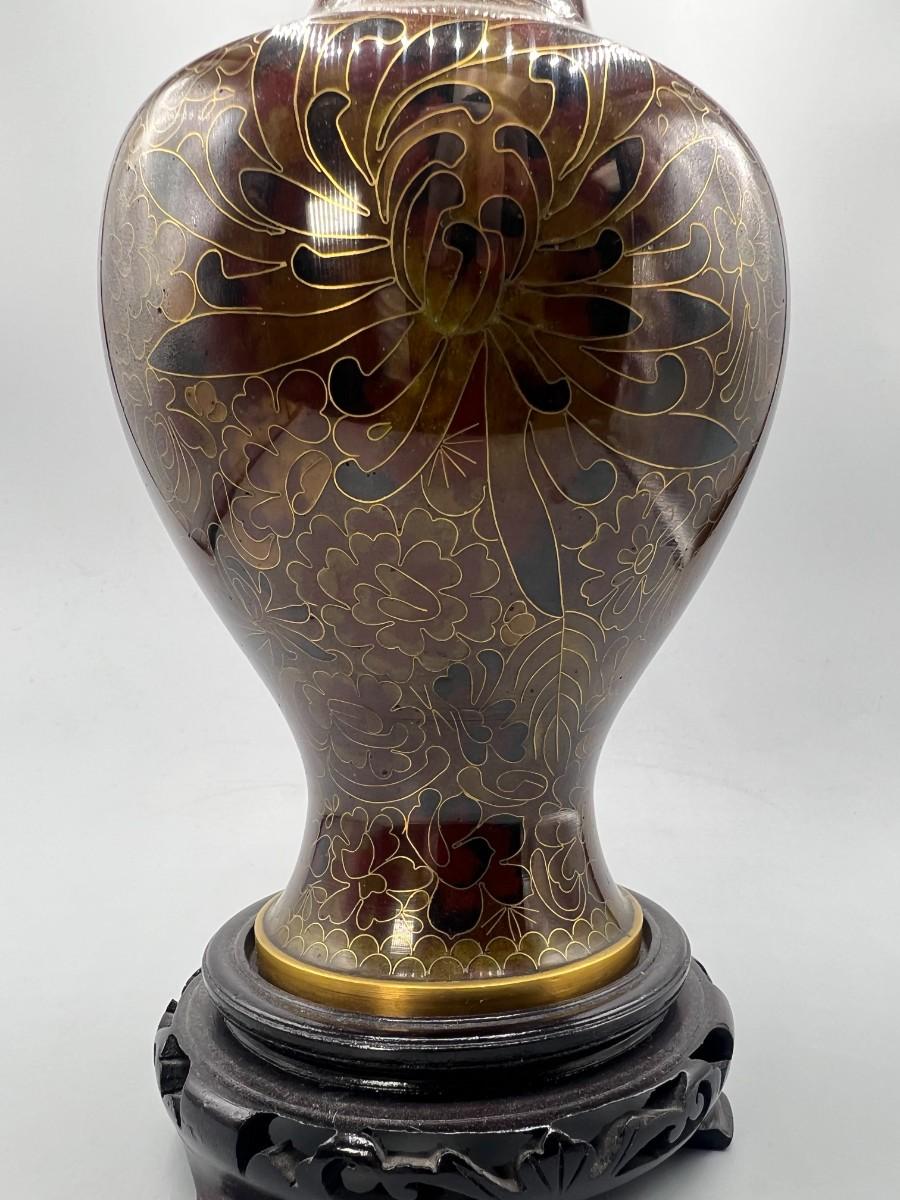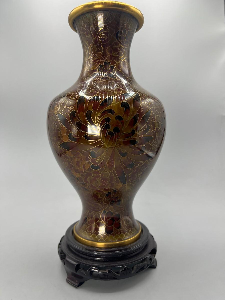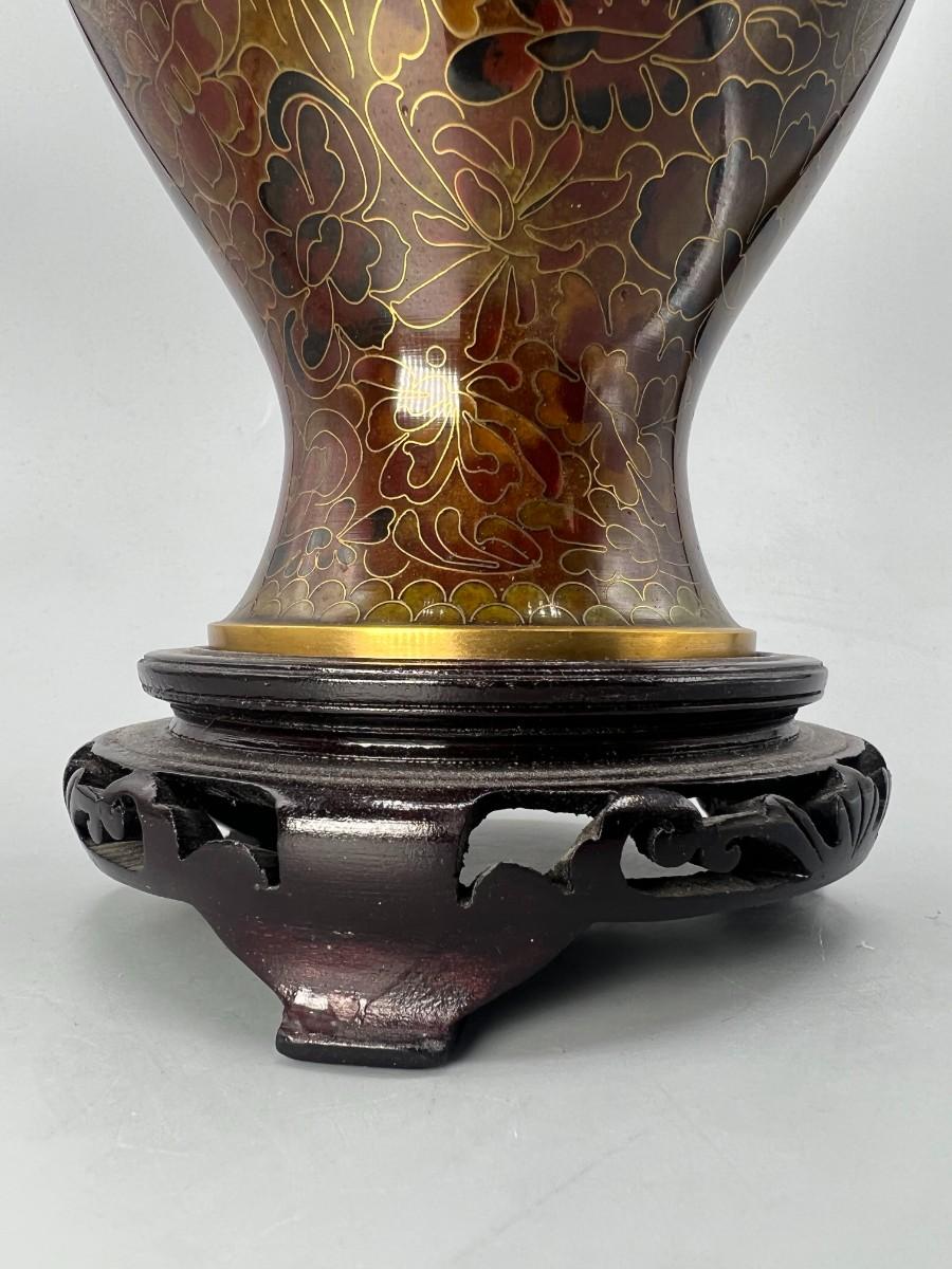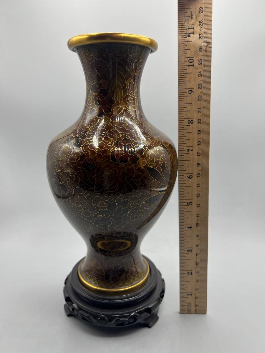Vintage Beijing Cloisonne Ware Copper Body Oriental Flower Design on Wooden Pedestal