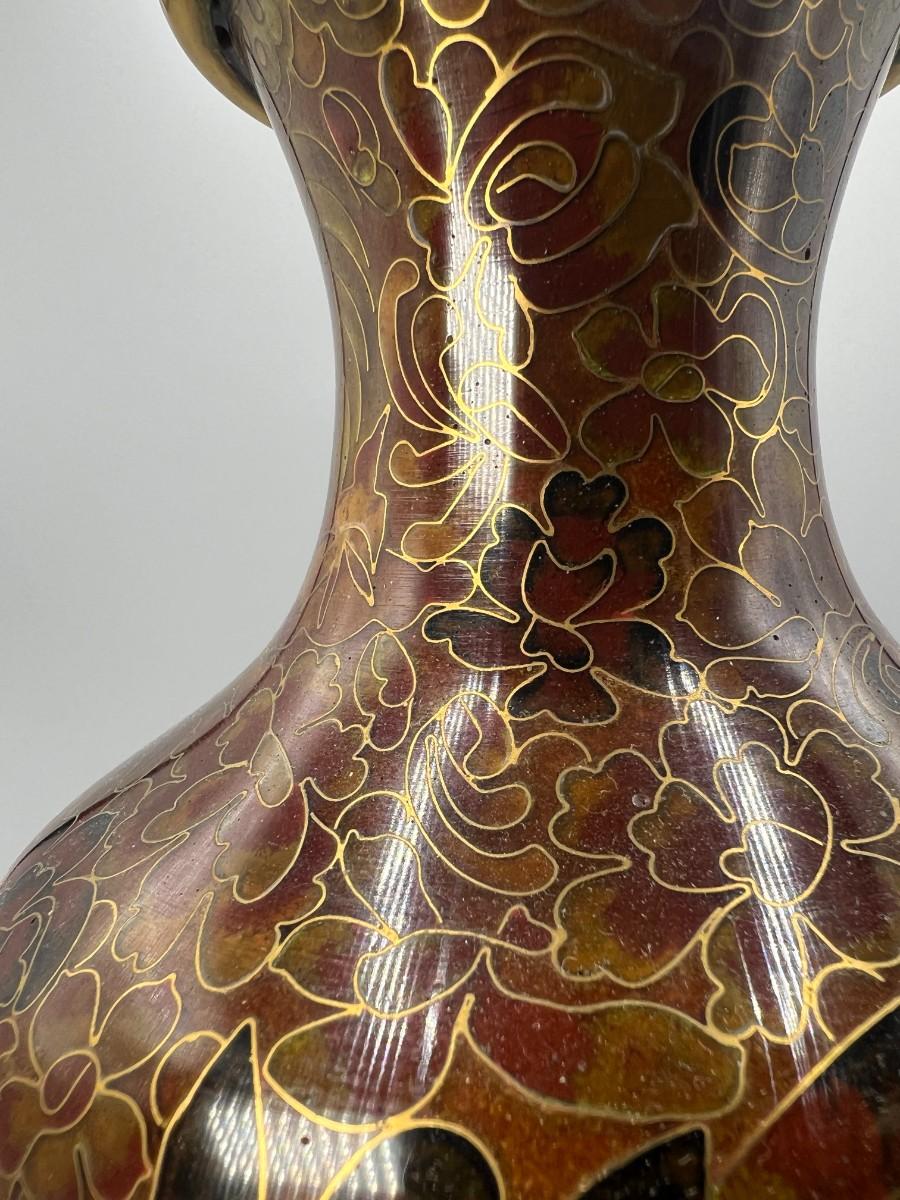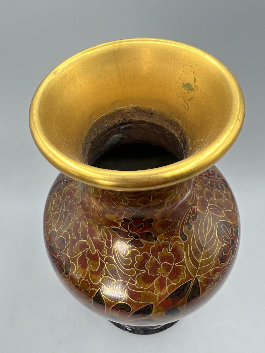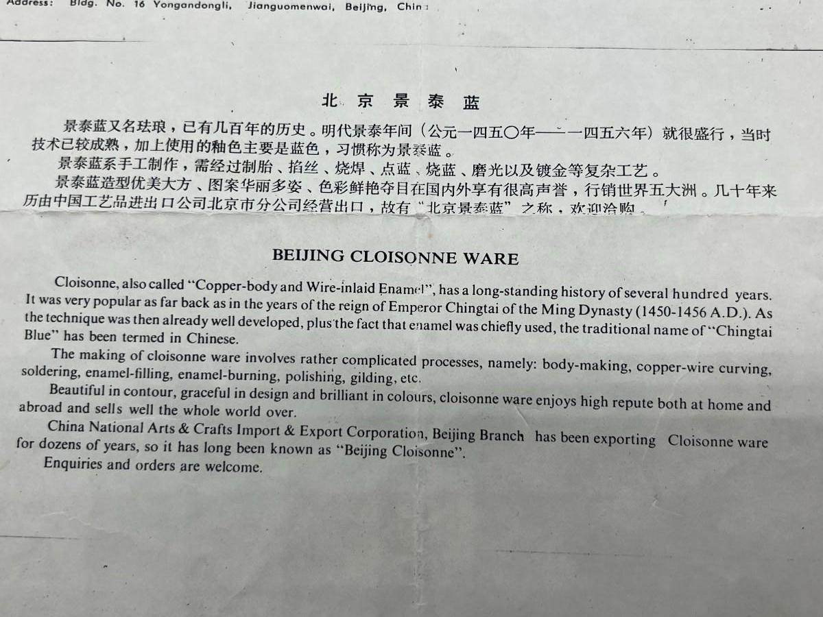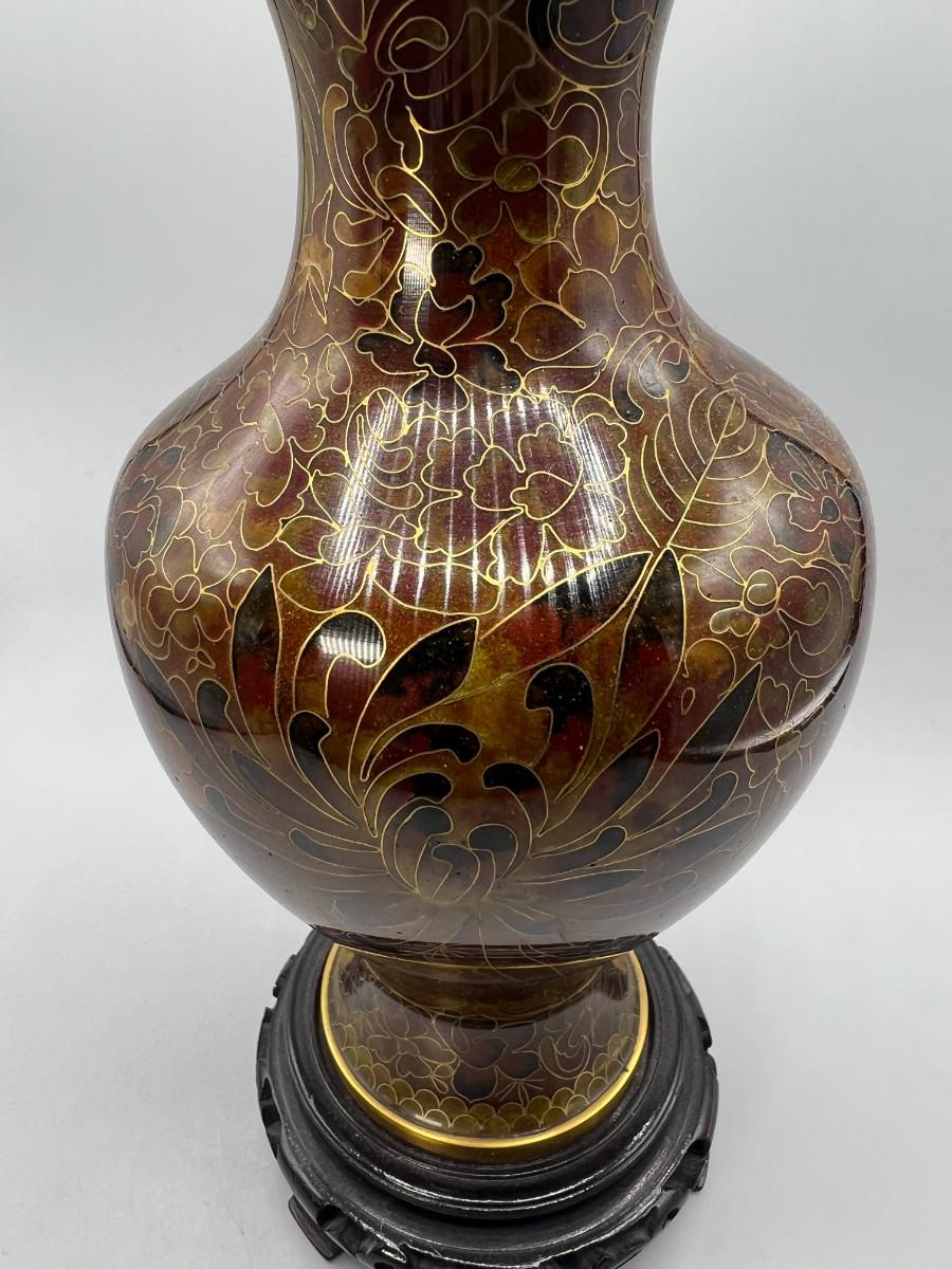 Vintage Beijing Cloisonne Ware Copper Body Oriental Flower Design on Wooden Pedestal