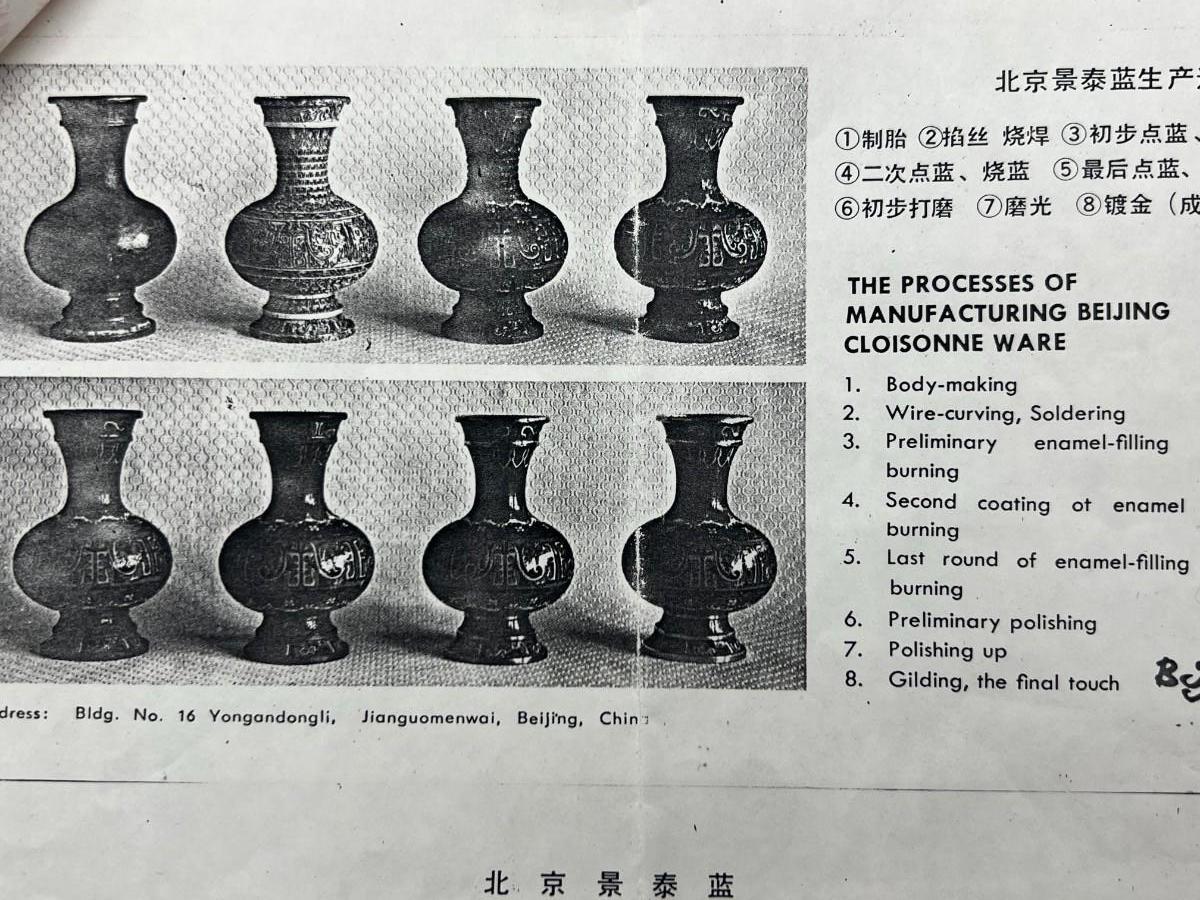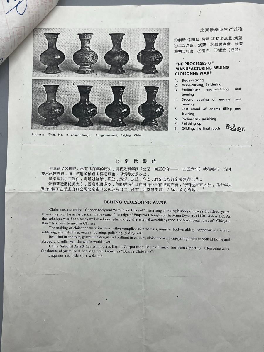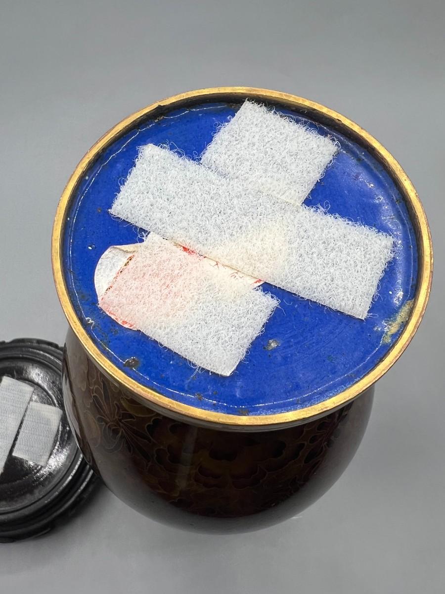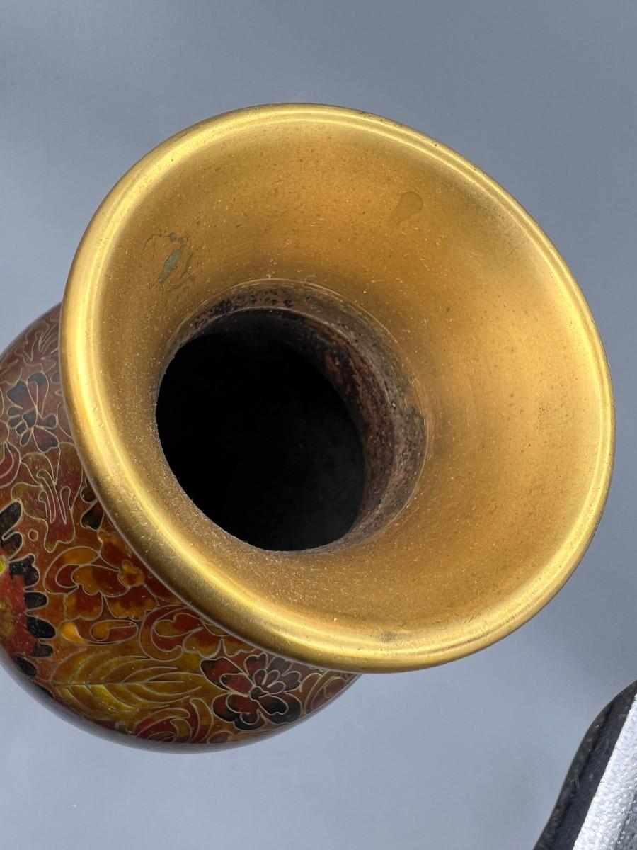 Vintage Beijing Cloisonne Ware Copper Body Oriental Flower Design on Wooden Pedestal