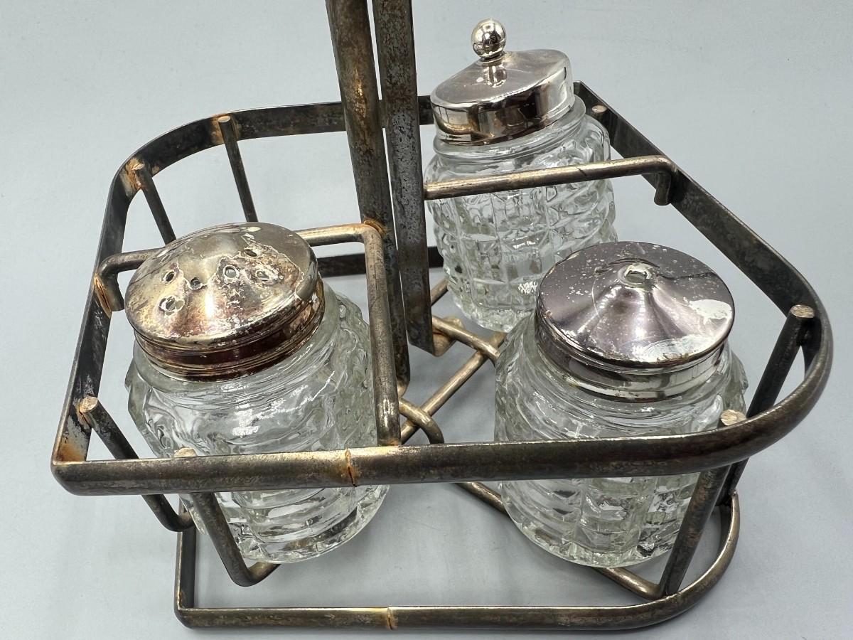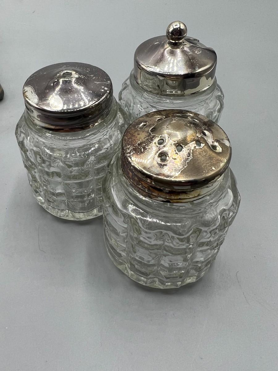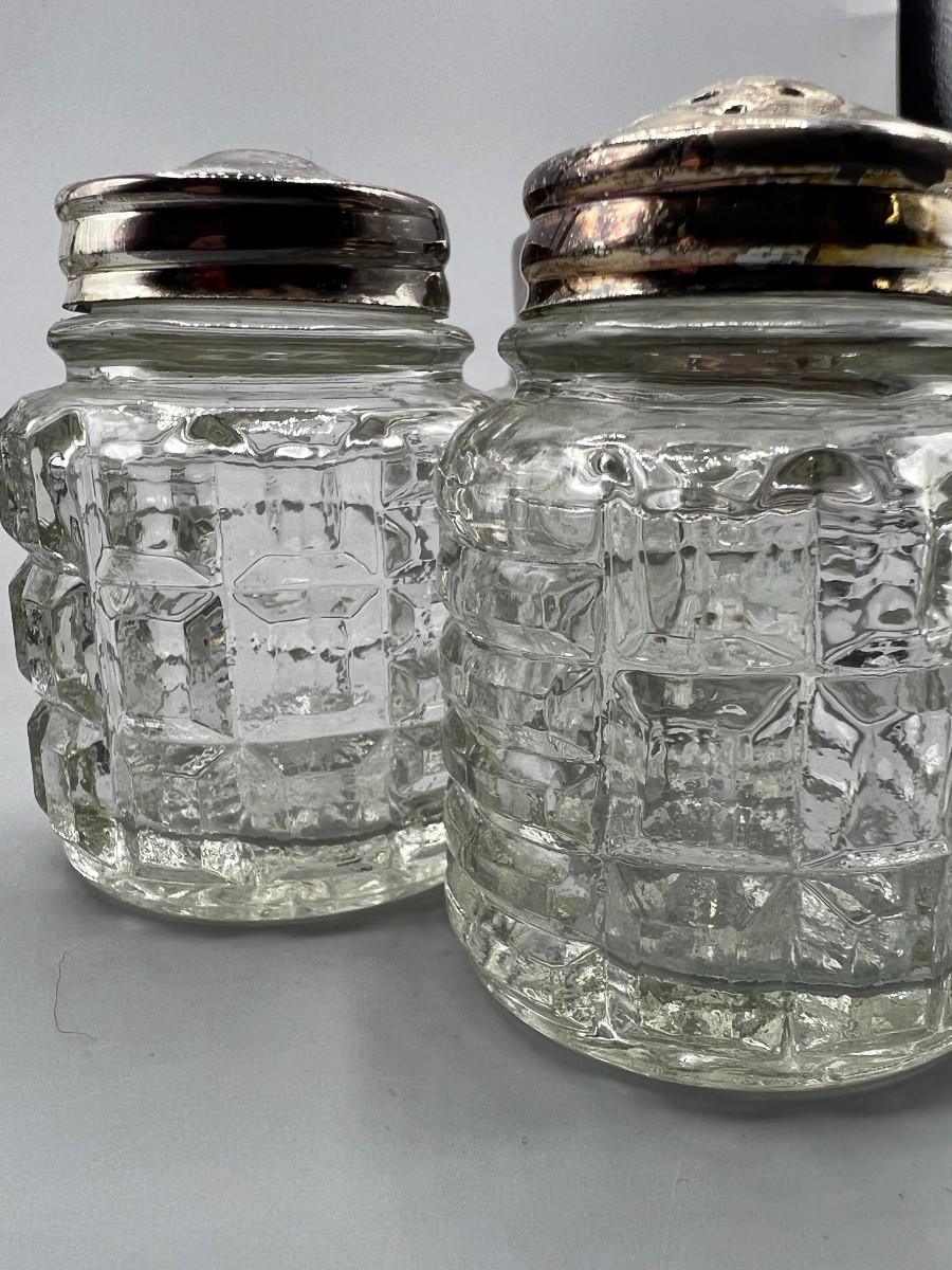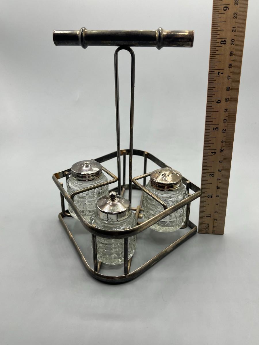 Vintage Glass Salt & Pepper Ingredient Container Silver plate Caddy