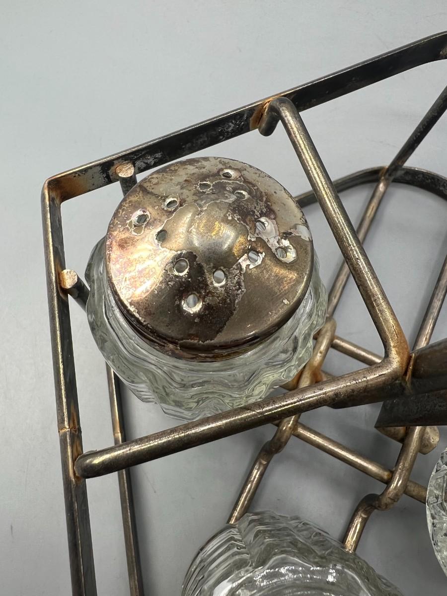 There is some vintage wear to the caddy and shakers, but there is no significant damage and is in overall good useable or collectible condition. Check pictures for more details and for sizing.