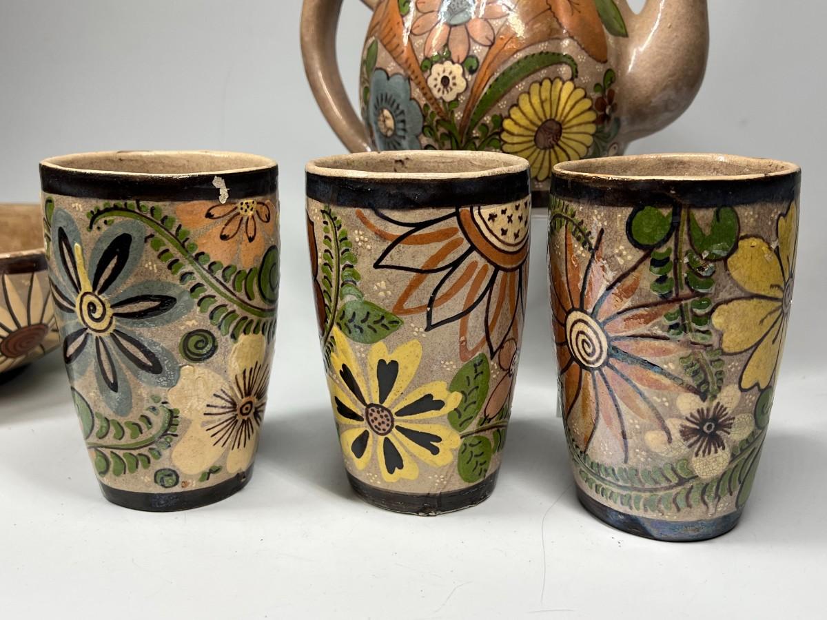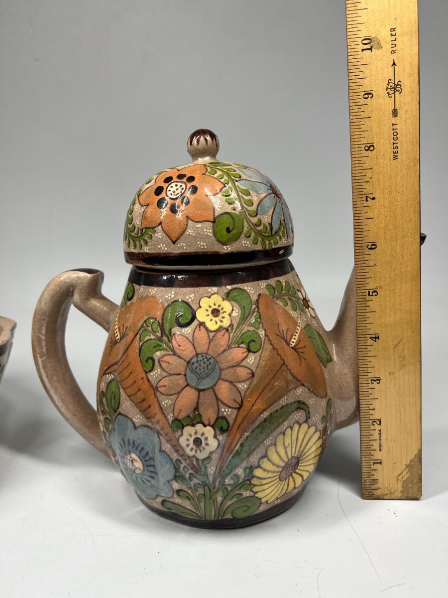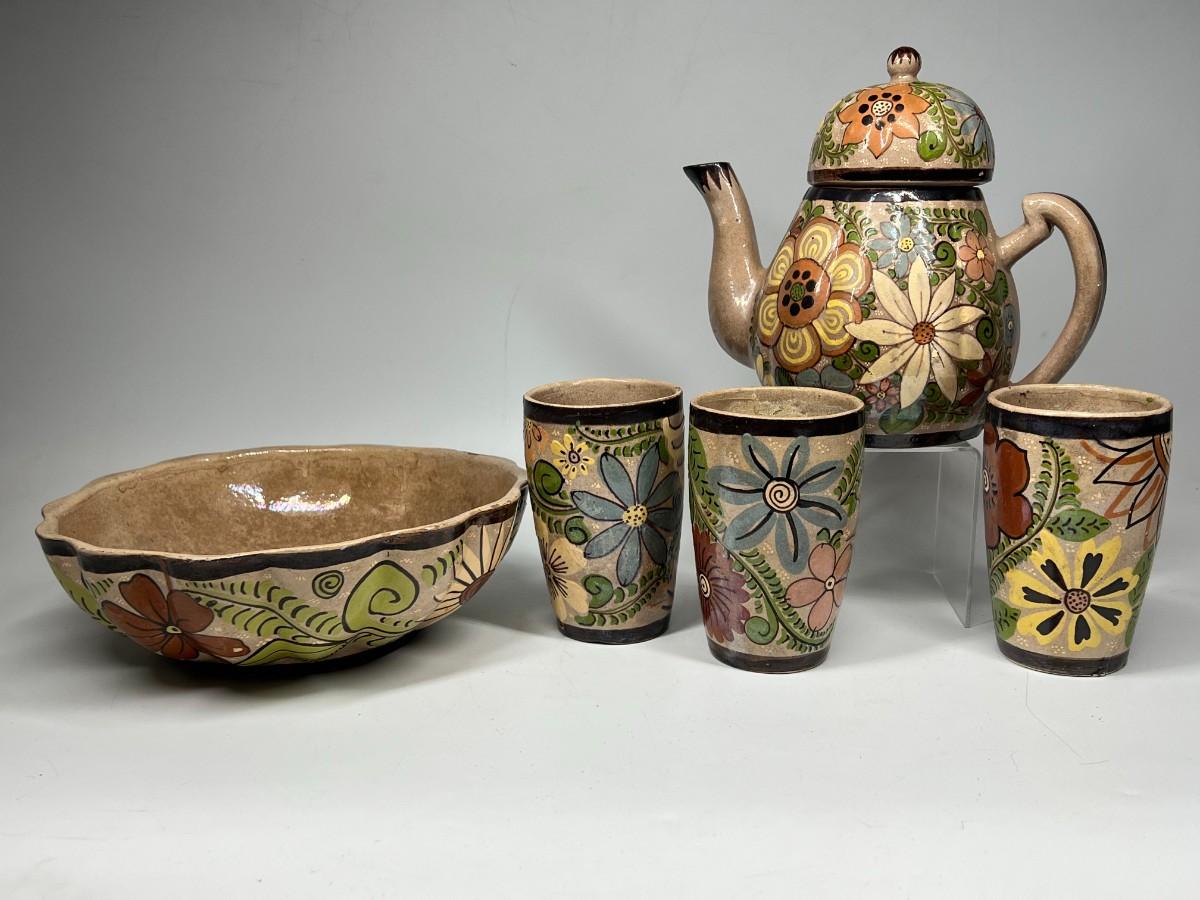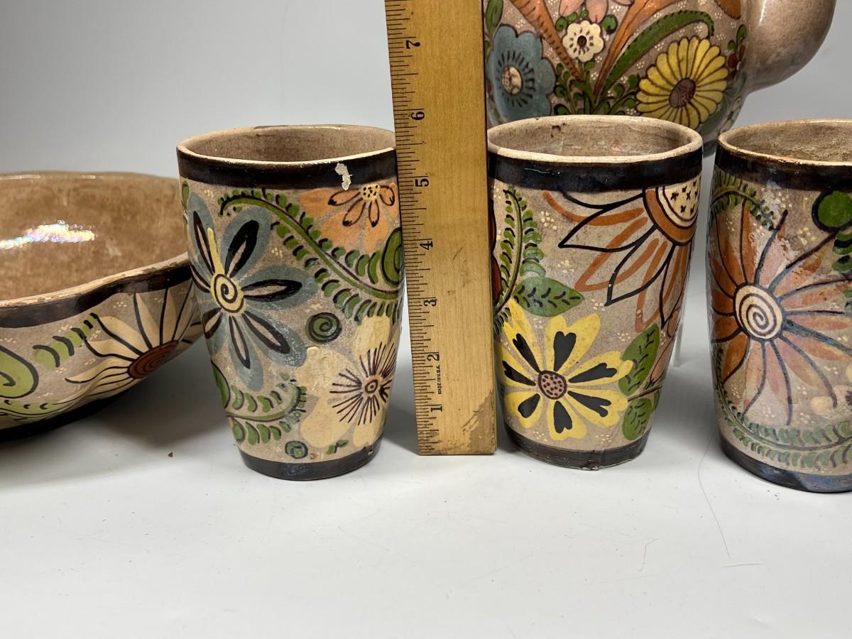 Vintage Made in Mexico Glazed Pottery Colorful Folk Art Mexican Flower Pattern Bowl, Cup, & Teapot Set