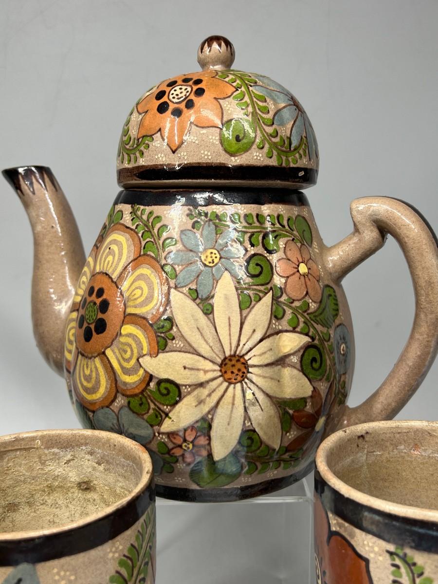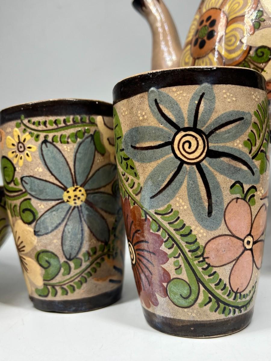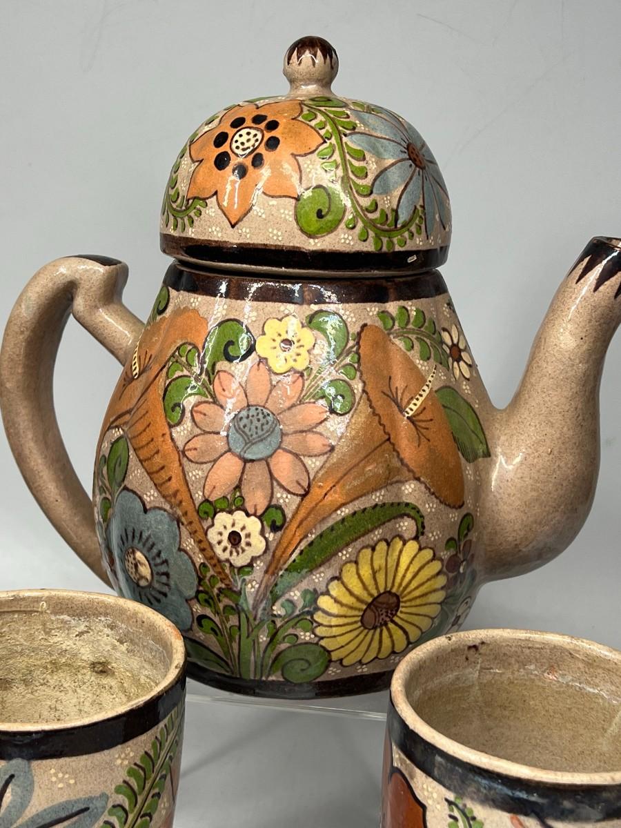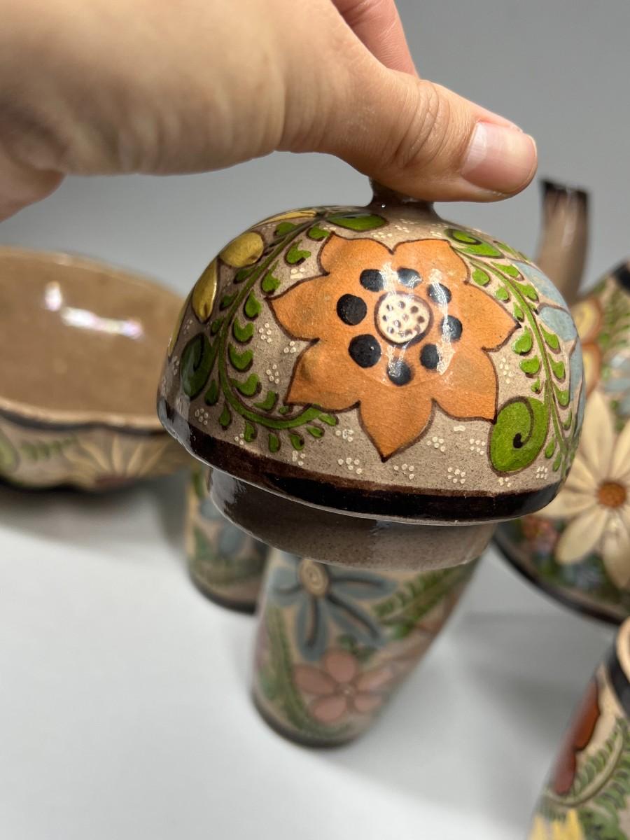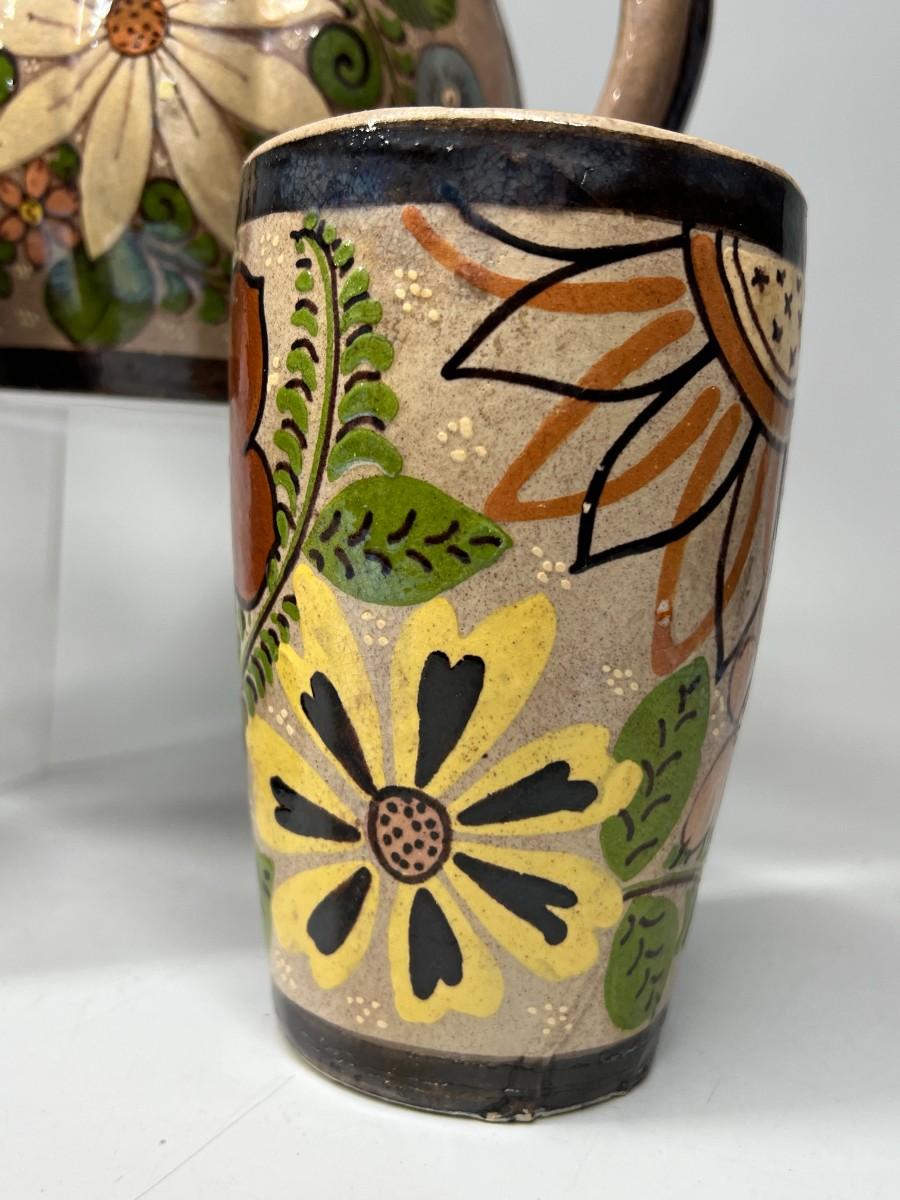 Vintage Made in Mexico Glazed Pottery Colorful Folk Art Mexican Flower Pattern Bowl, Cup, & Teapot Set