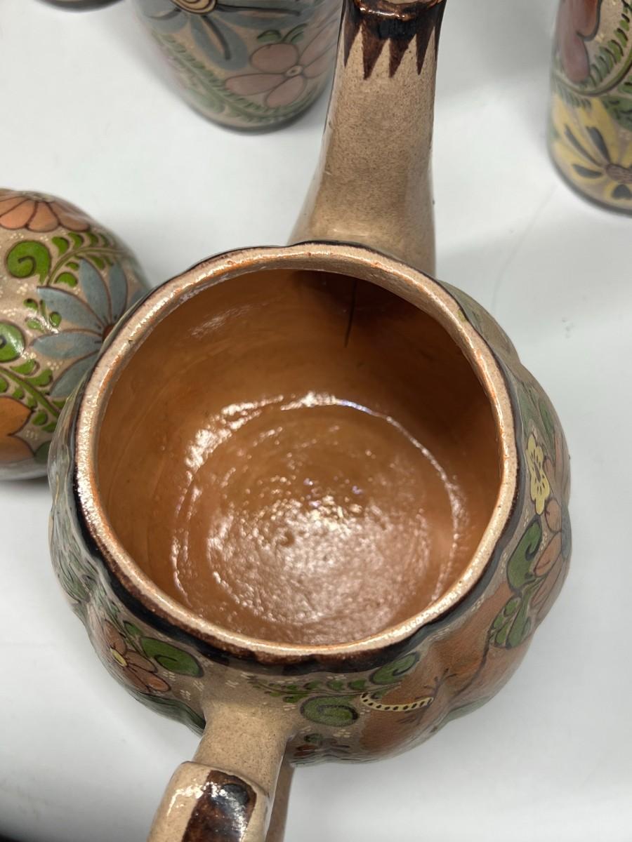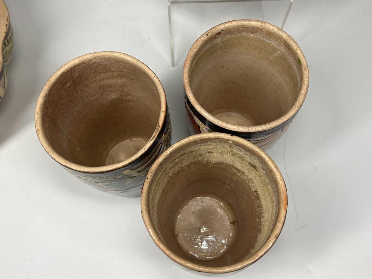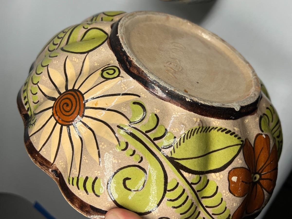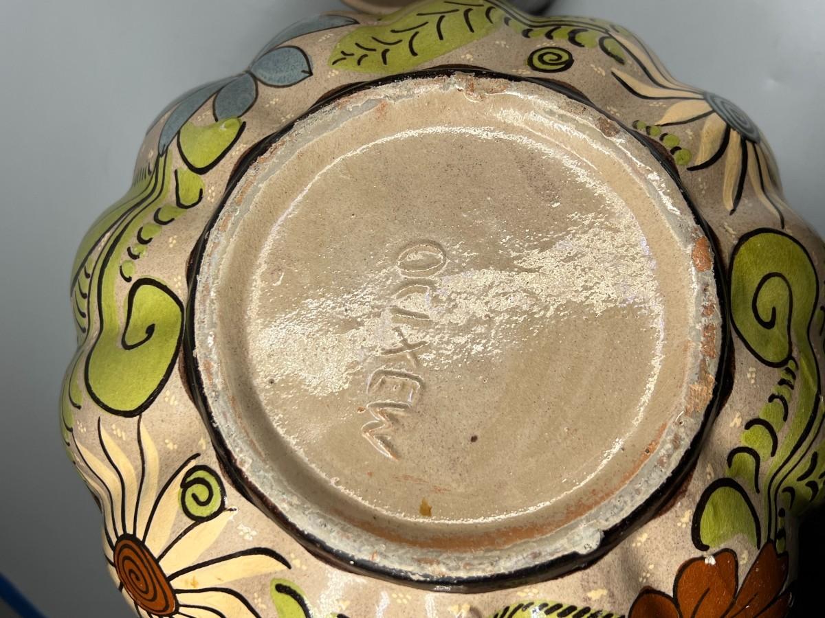 Vintage Made in Mexico Glazed Pottery Colorful Folk Art Mexican Flower Pattern Bowl, Cup, & Teapot Set