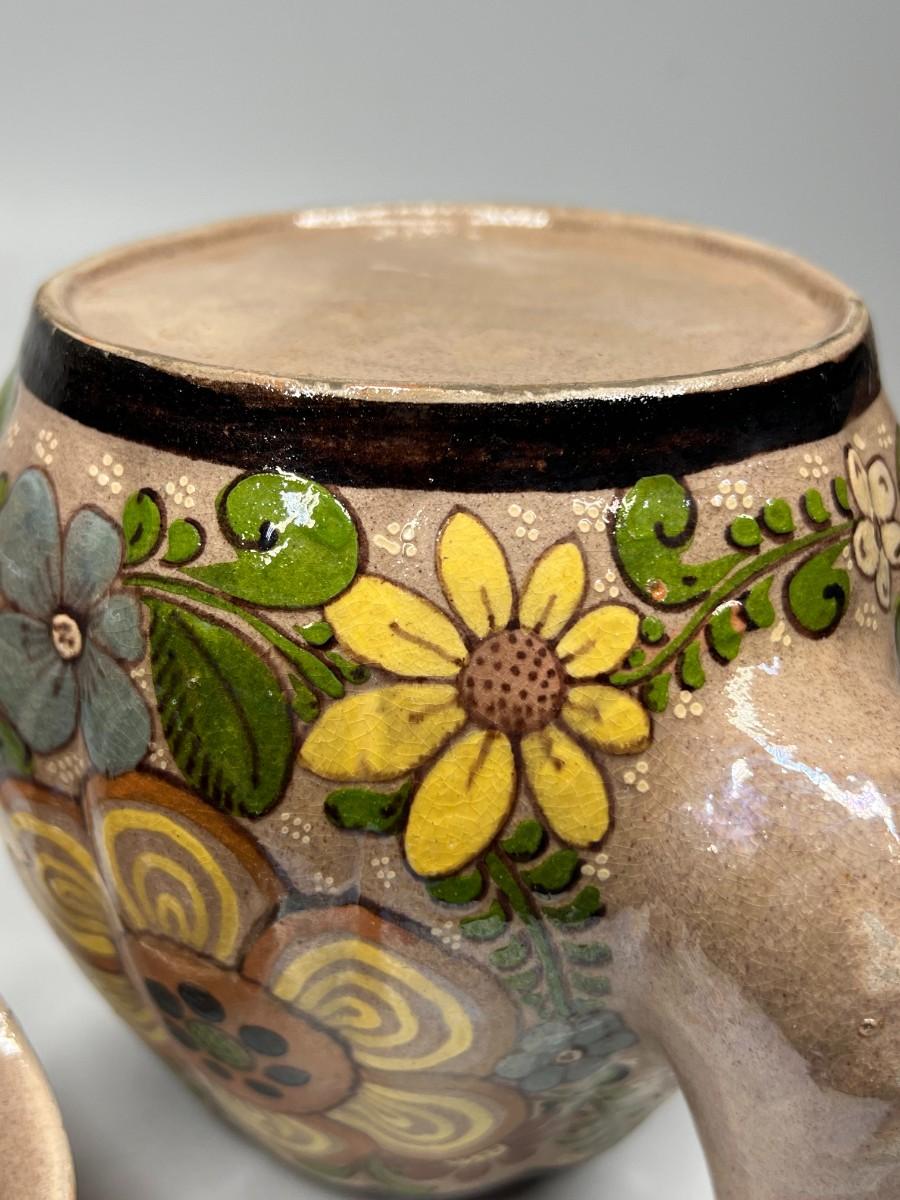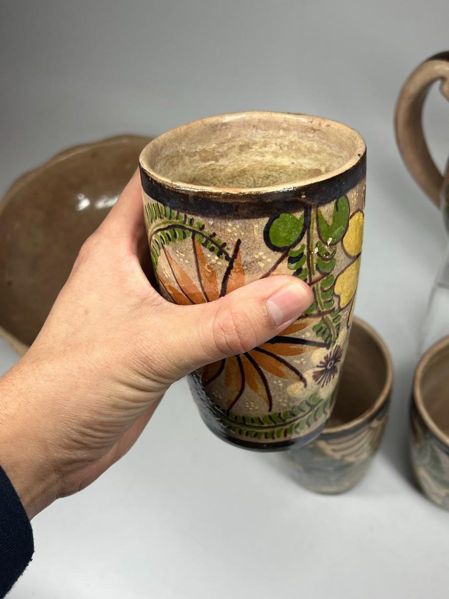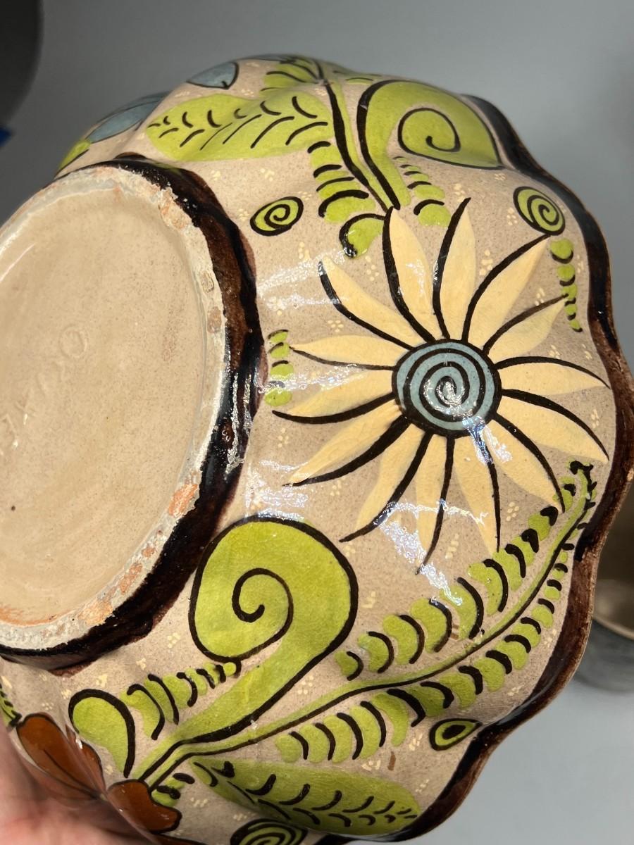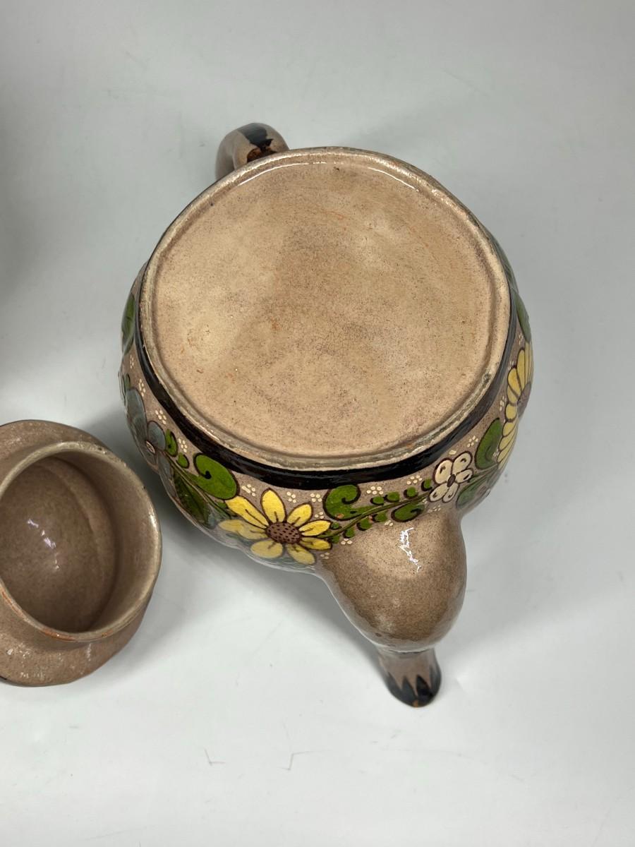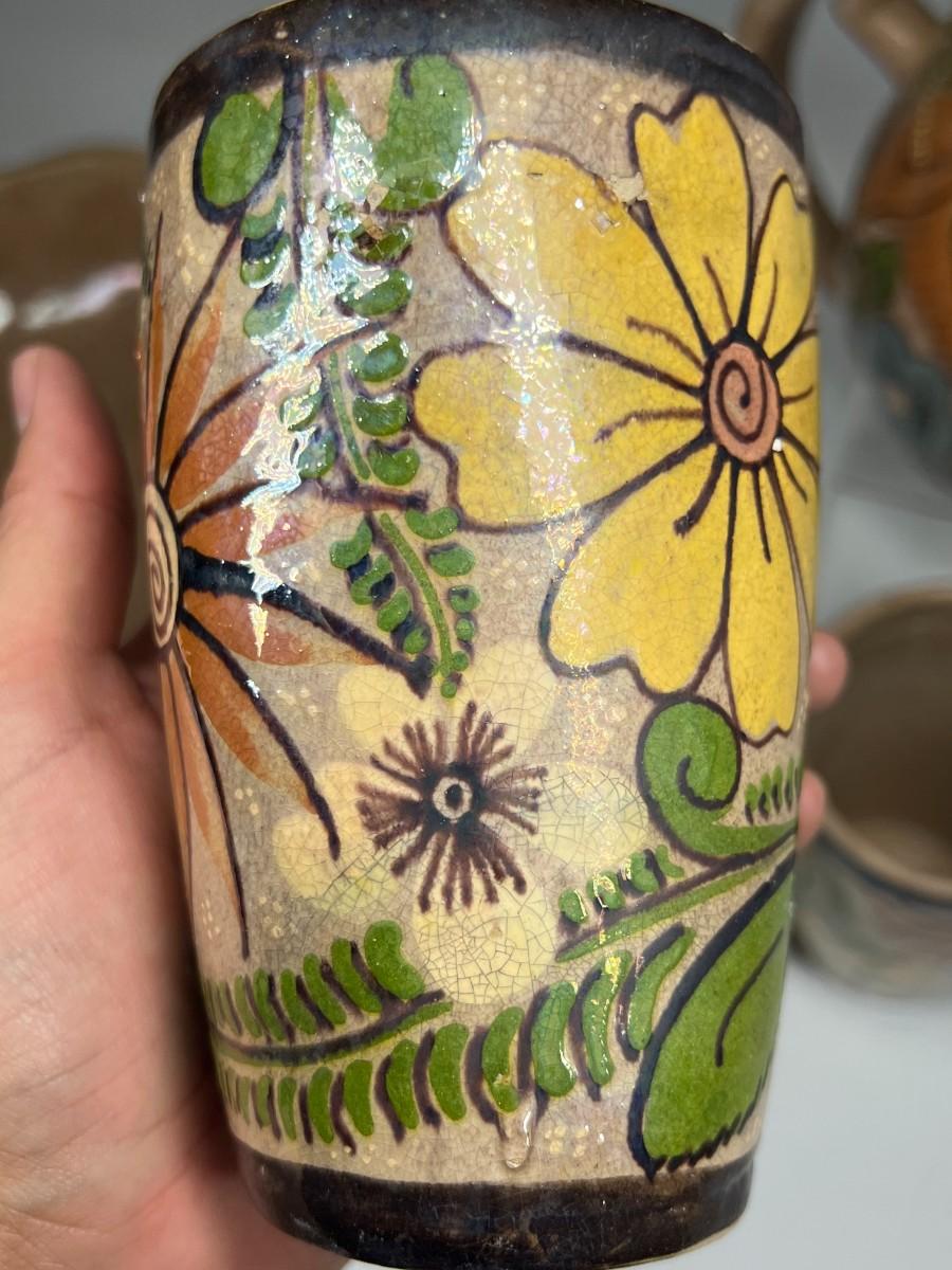 Vintage Made in Mexico Glazed Pottery Colorful Folk Art Mexican Flower Pattern Bowl, Cup, & Teapot Set