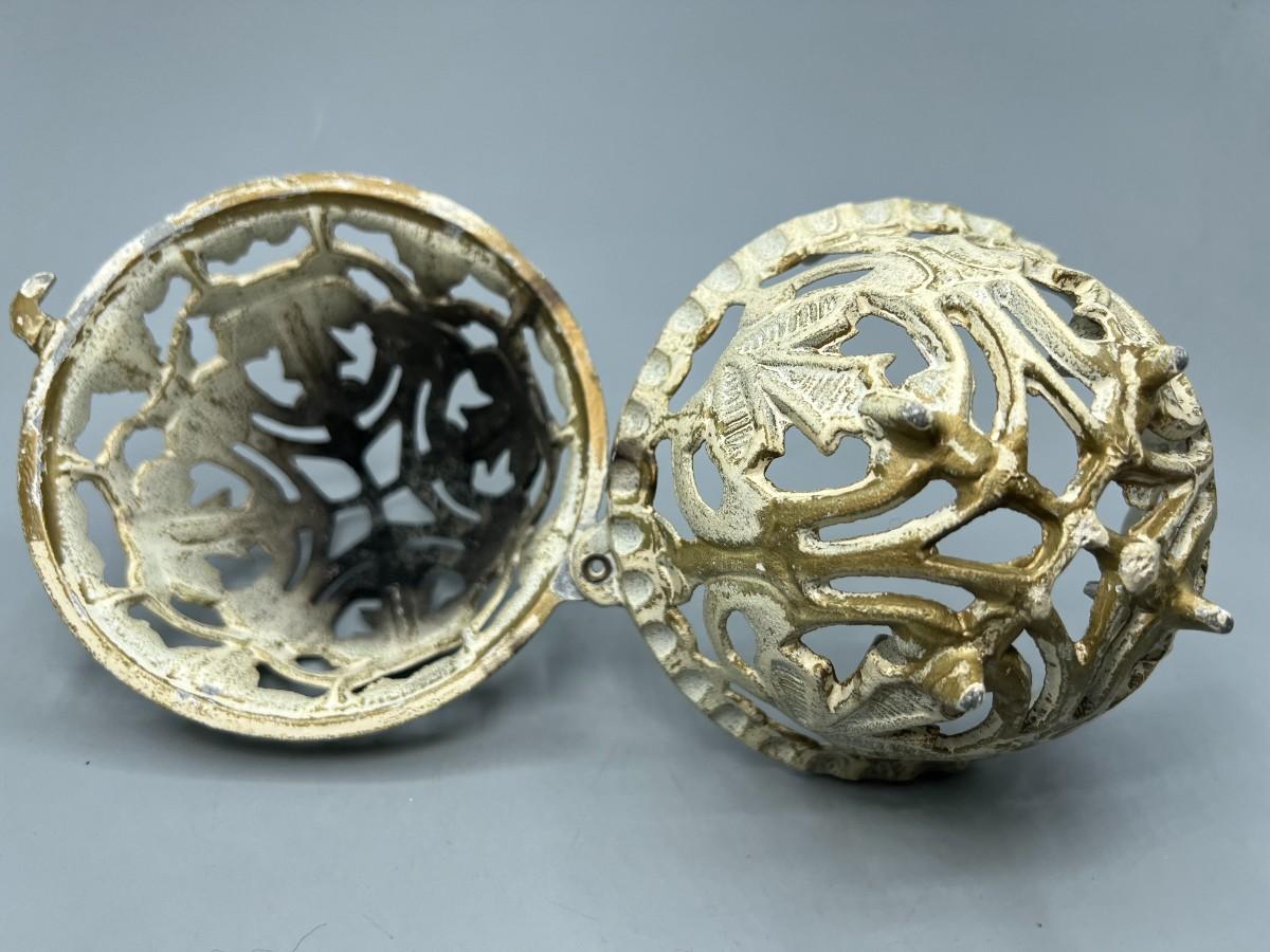 There is no significant damage to the cast metal egg and is in overall good collectible or useable condition. Check pictures for more details and for sizing.