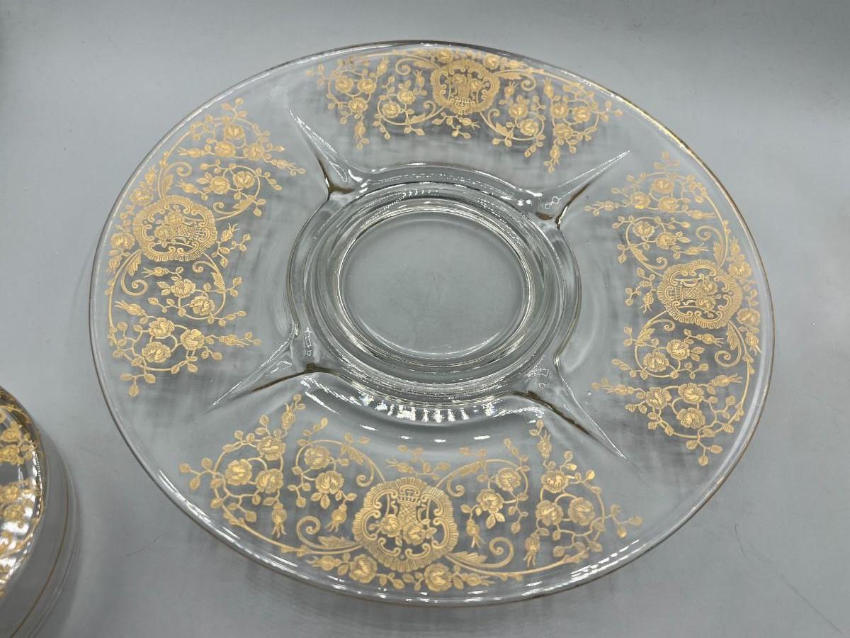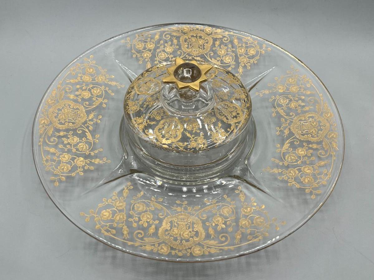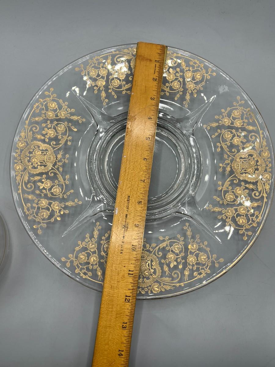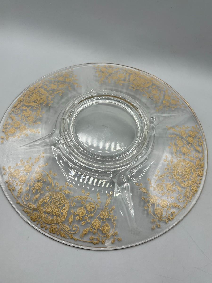 Vintage Clear Glass Gold Bridal Bouquet Pattern Art Nouveau Hollywood Regency Serving Presentation Dish