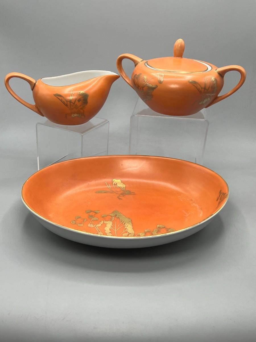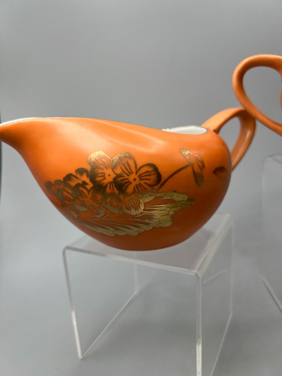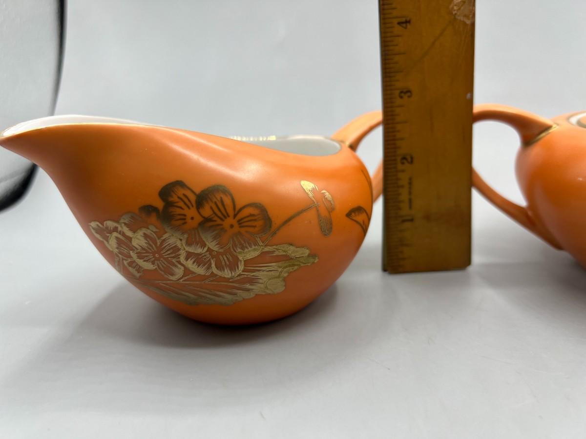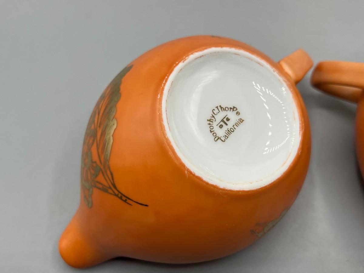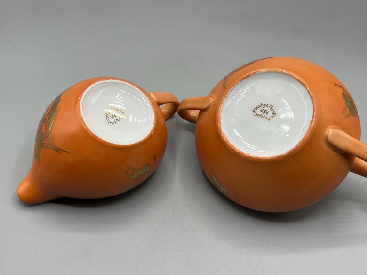 Vintage Dorothy C. Thorpe California Mid Century Gold Trim Persimmon Design Bisque Sugar Bowl, Creamer Pitcher & Dish