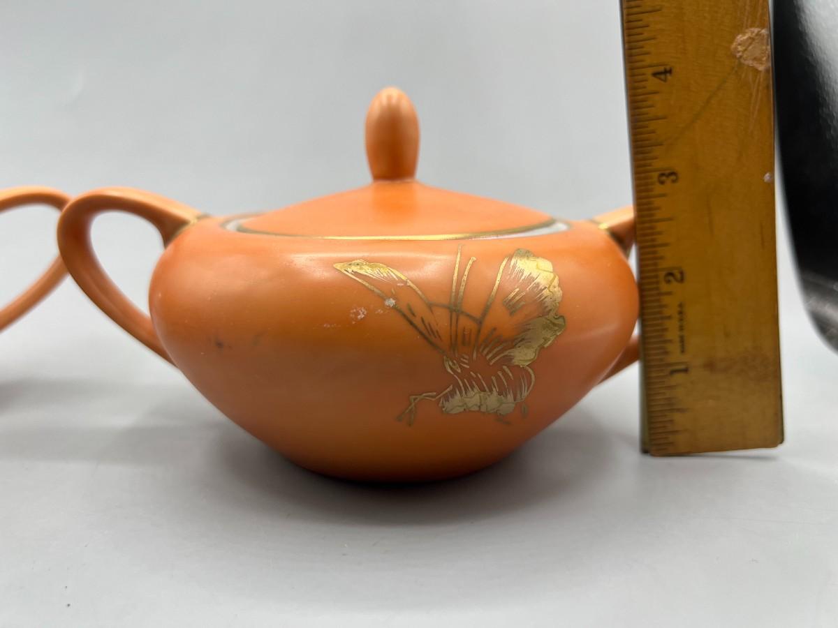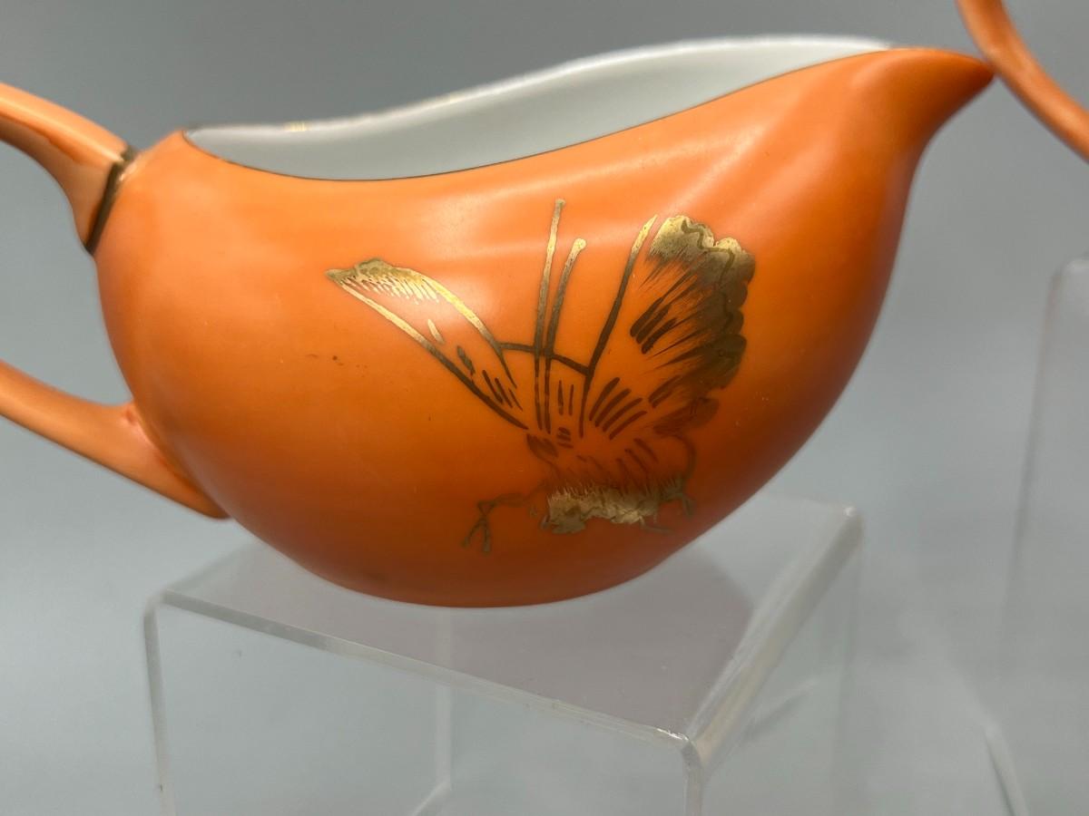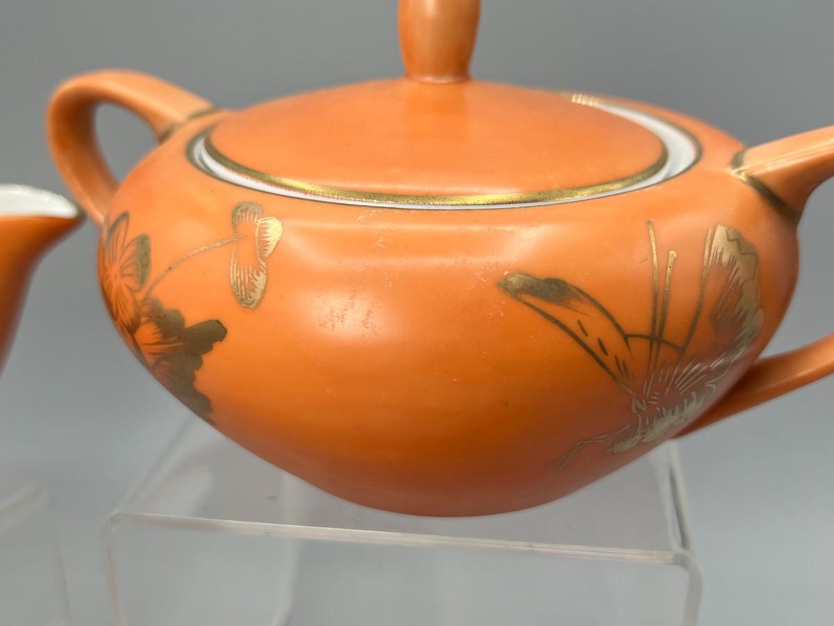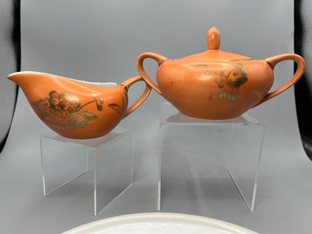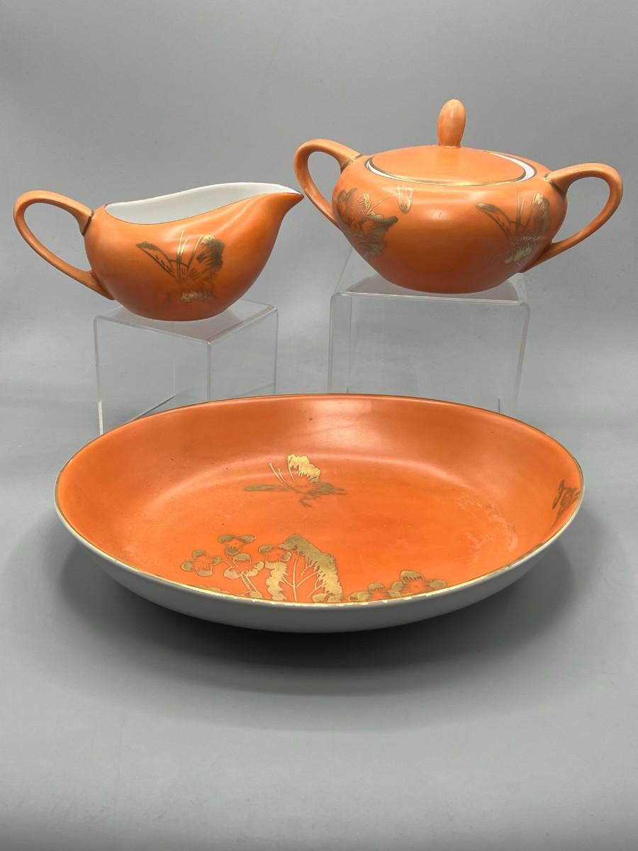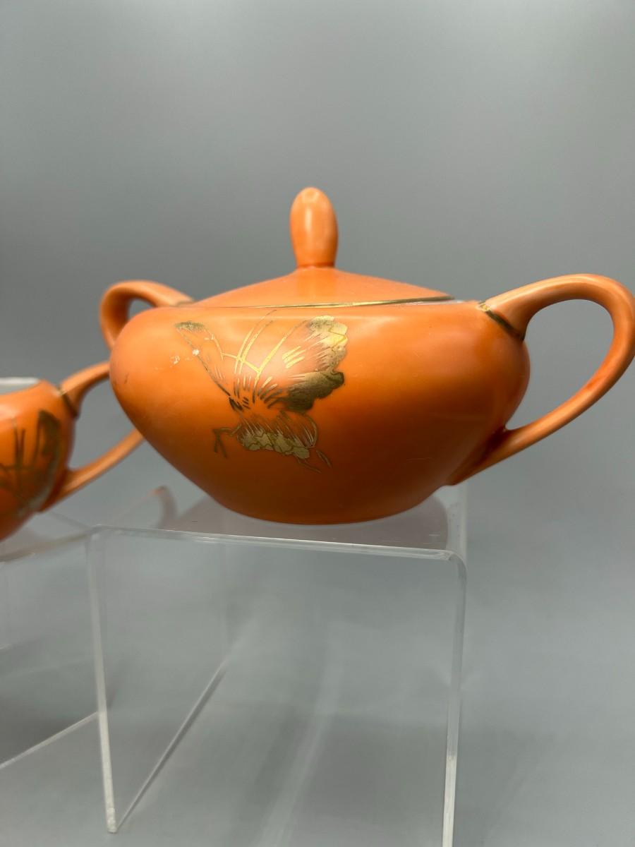 Vintage Dorothy C. Thorpe California Mid Century Gold Trim Persimmon Design Bisque Sugar Bowl, Creamer Pitcher & Dish