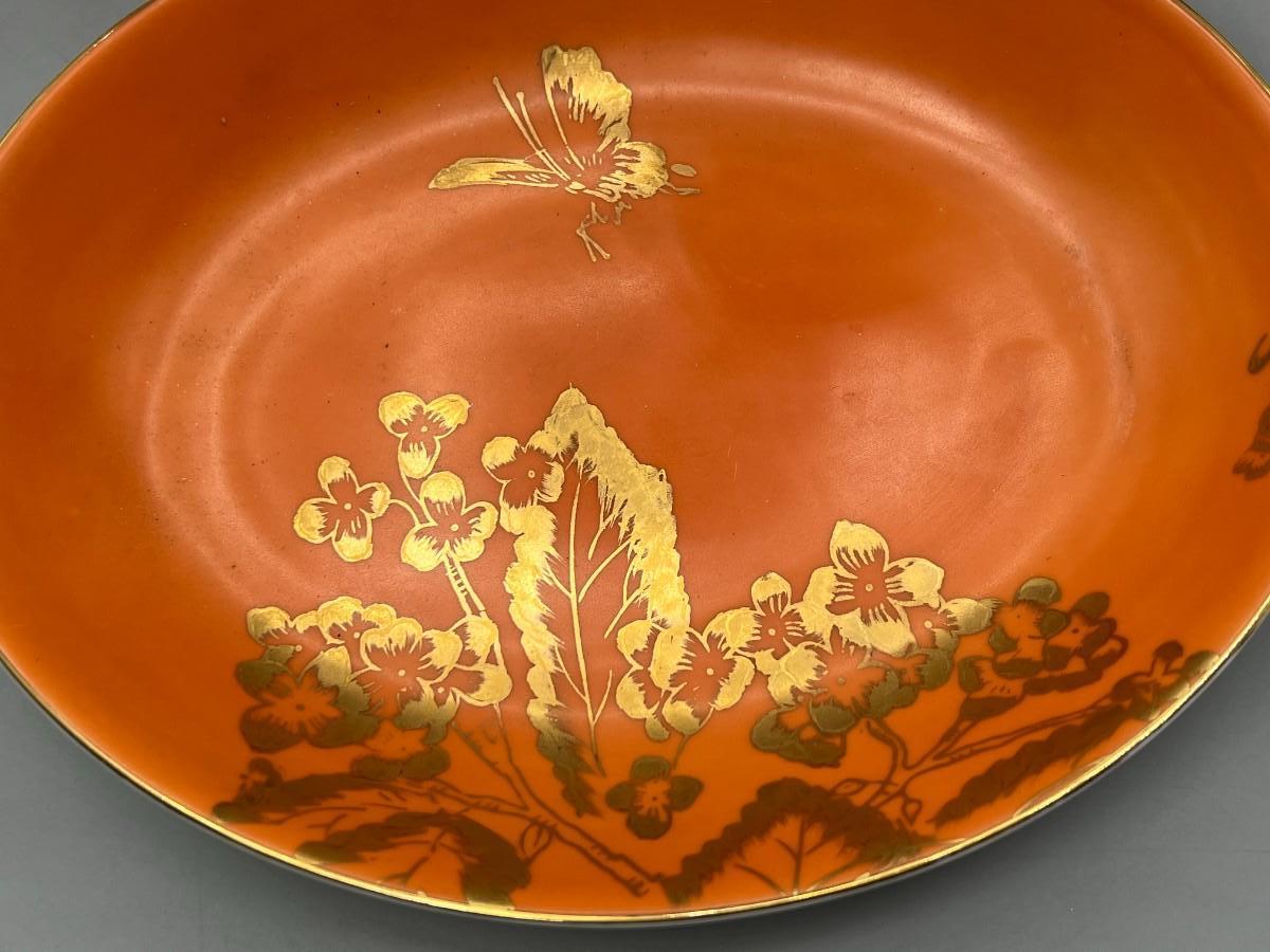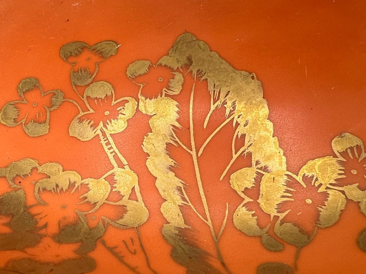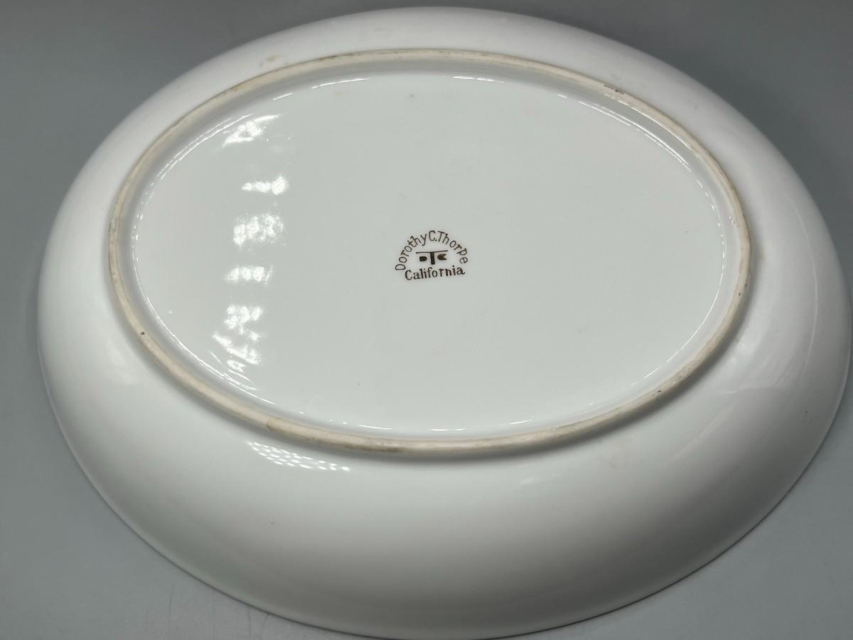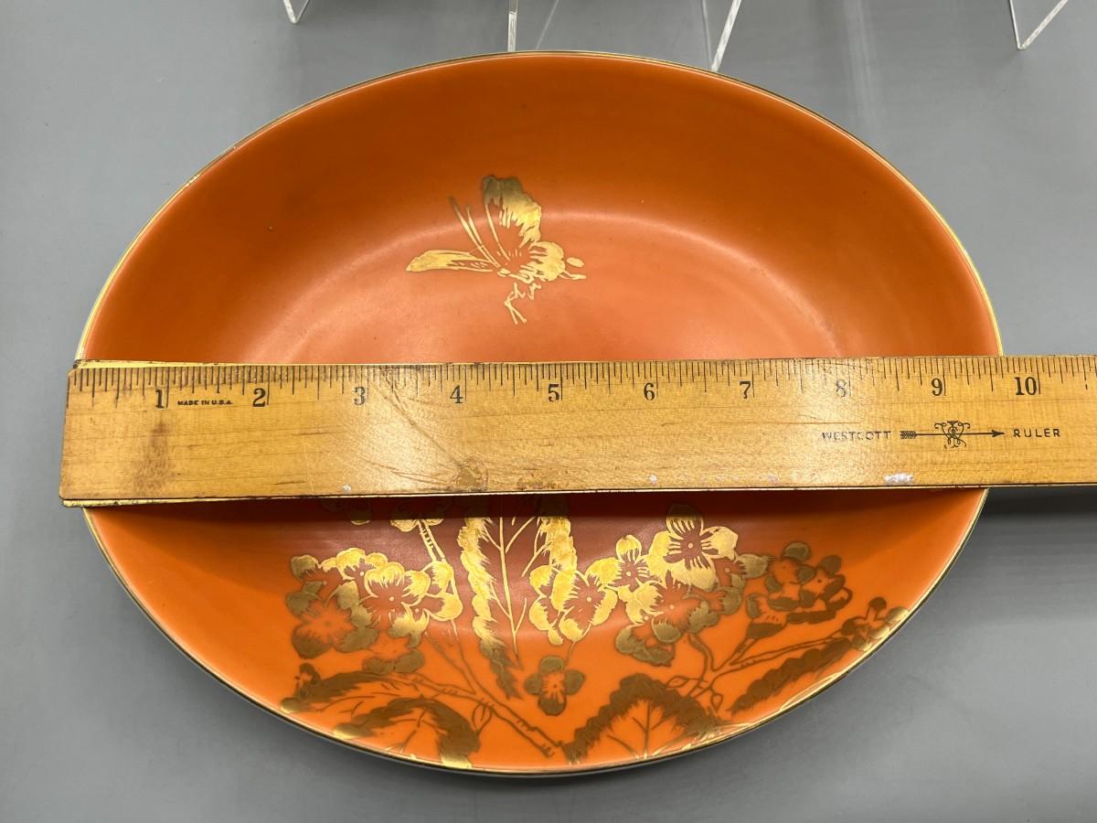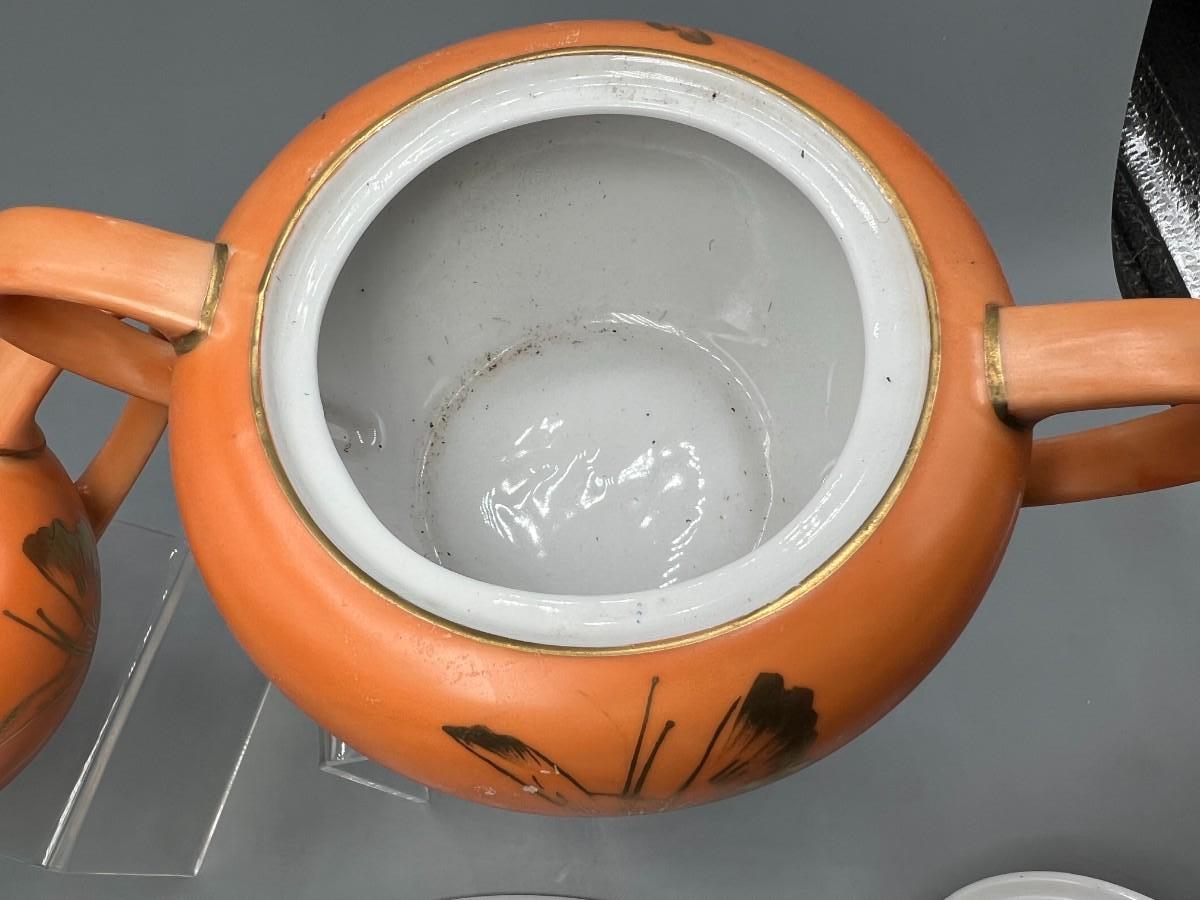 Vintage Dorothy C. Thorpe California Mid Century Gold Trim Persimmon Design Bisque Sugar Bowl, Creamer Pitcher & Dish