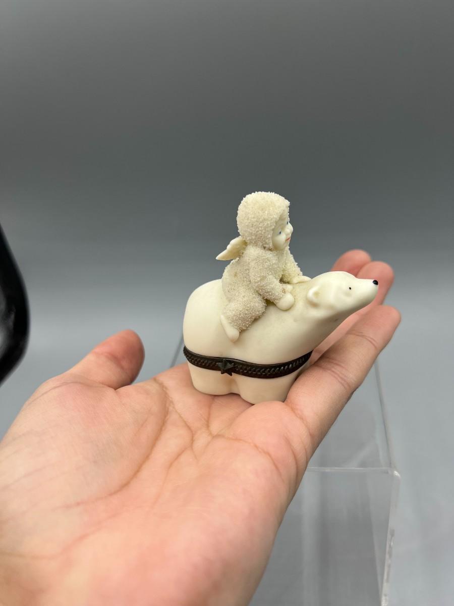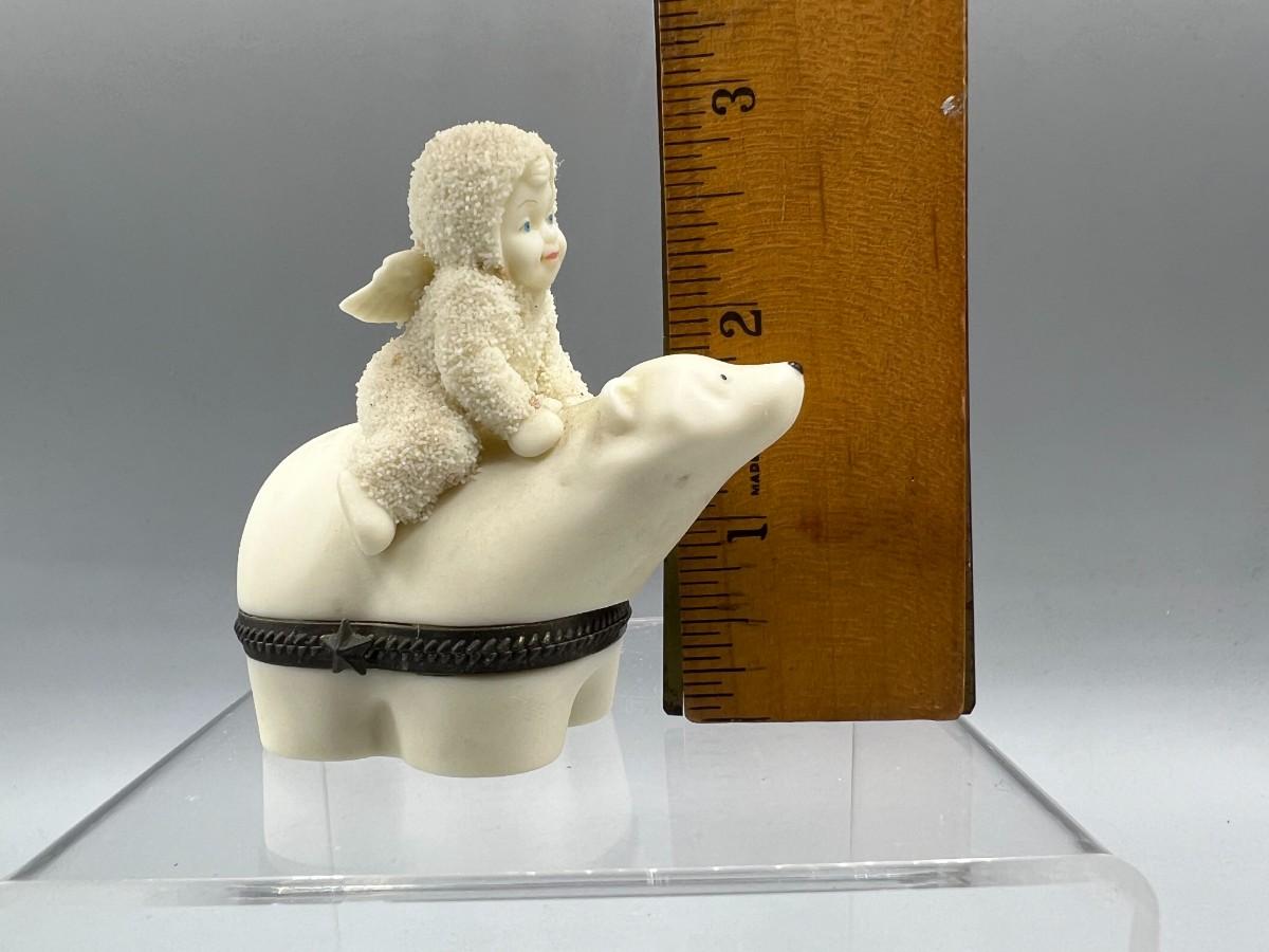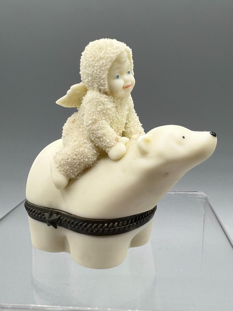 Dept 56 Snow Babies Small Trinket Box Angel on Polar Bear. In good condition. About 3" size.