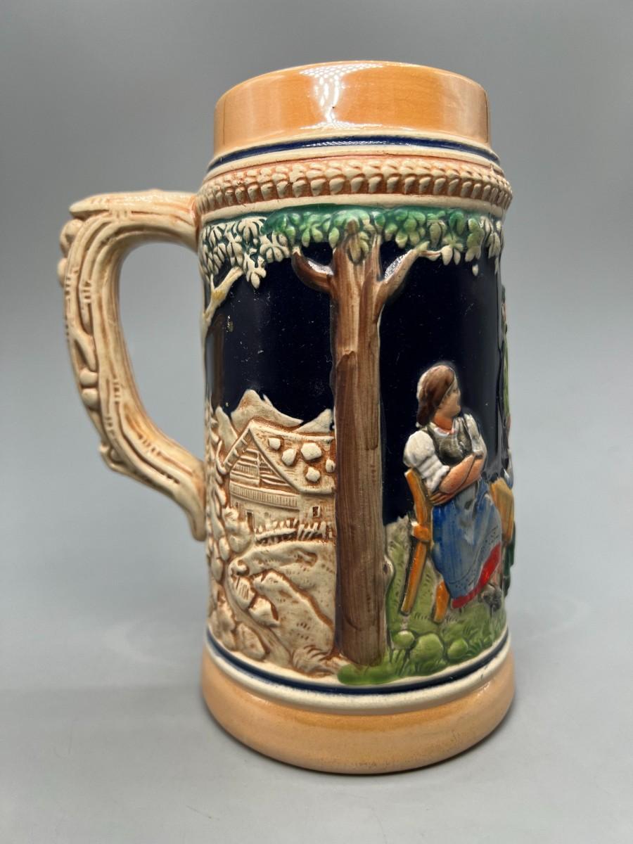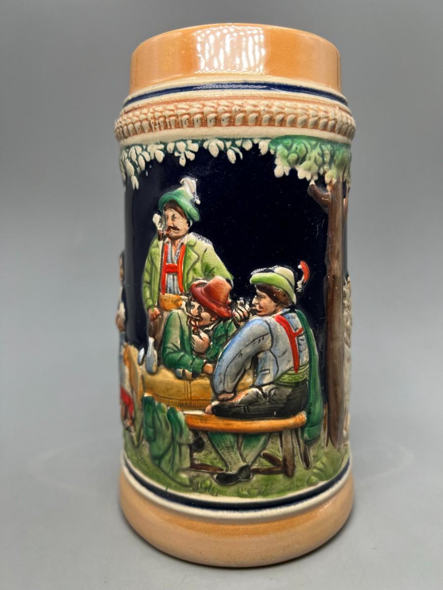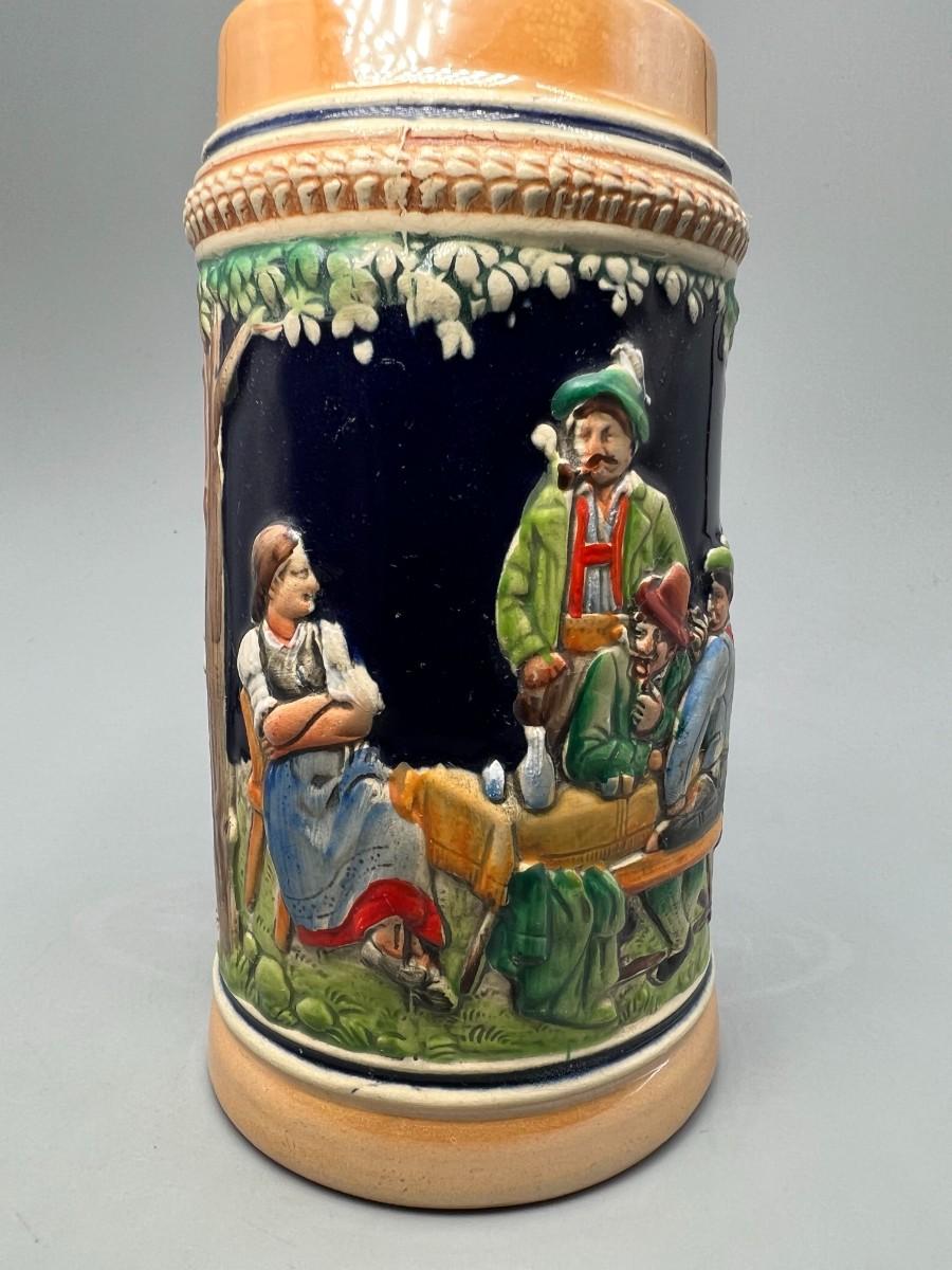 Vintage Made in Germany Beer Stein Colorful People Gathered Outside Under Tree Scene