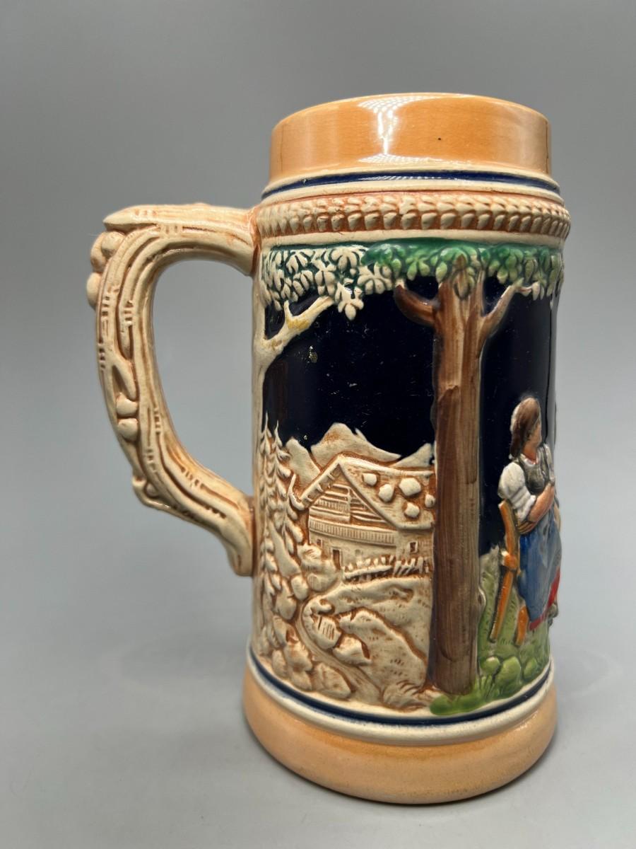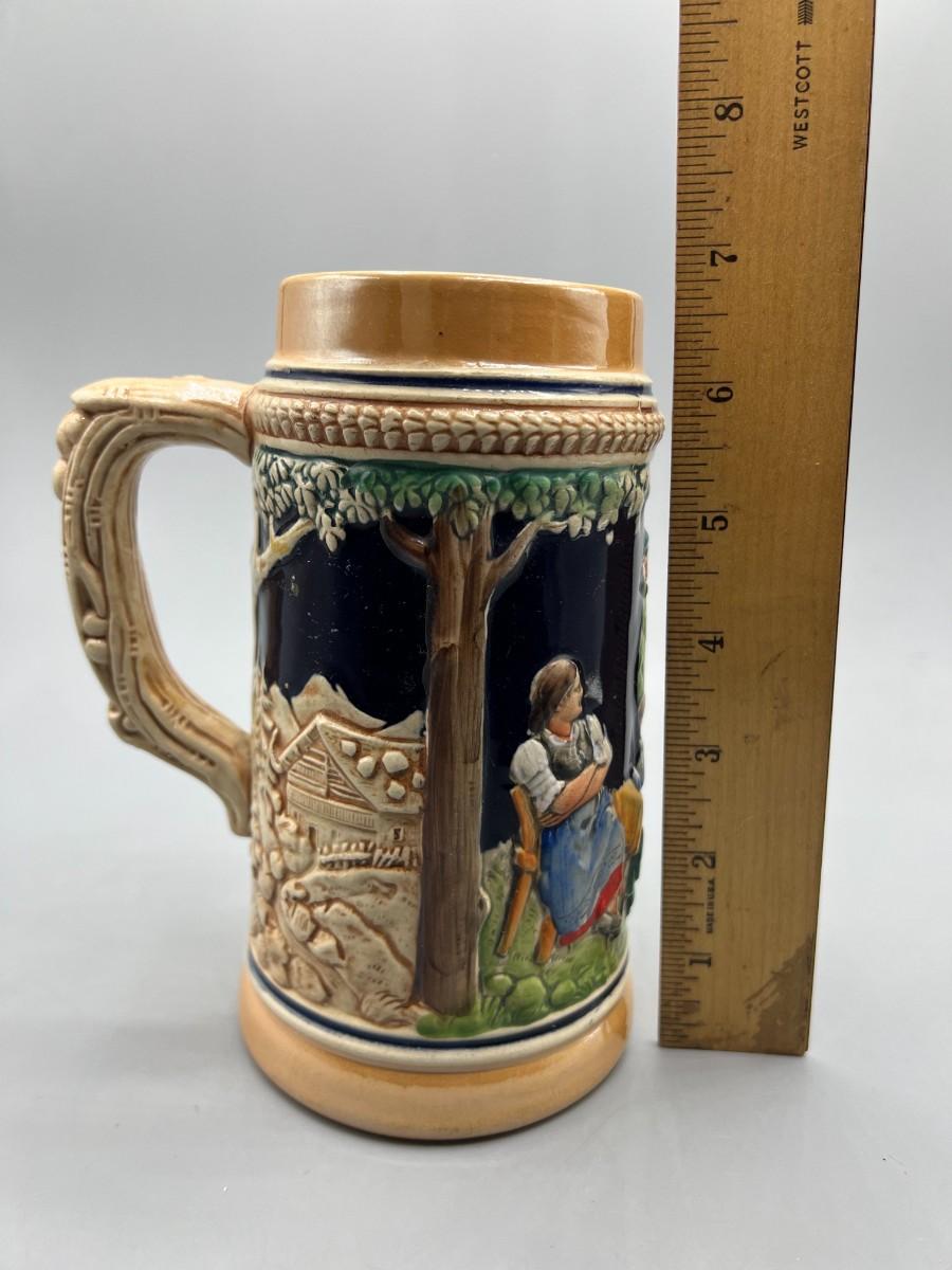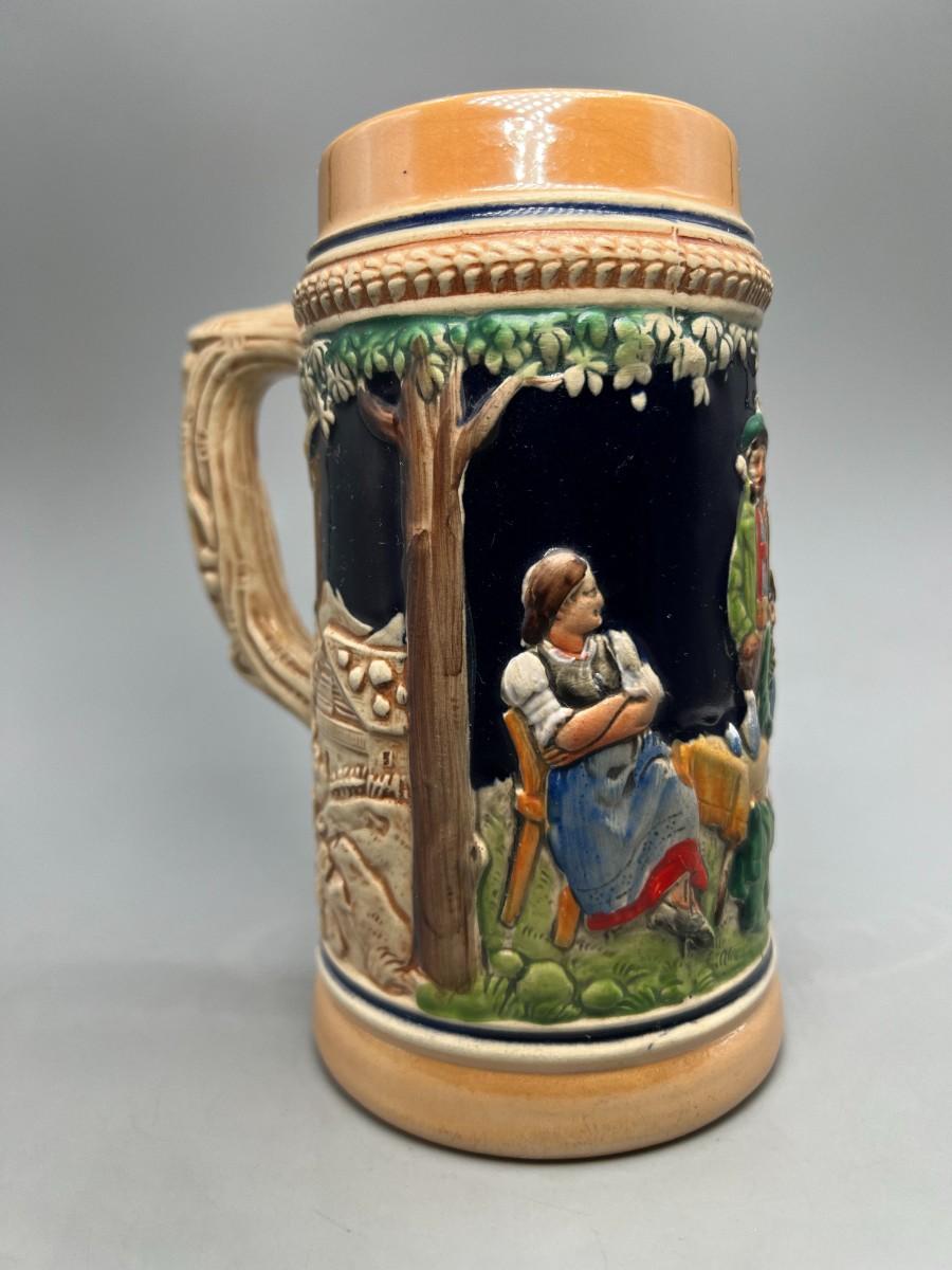Vintage Made in Germany Beer Stein Colorful People Gathered Outside Under Tree Scene. In vintage condition. There is crazing to the finish. Displays nice.