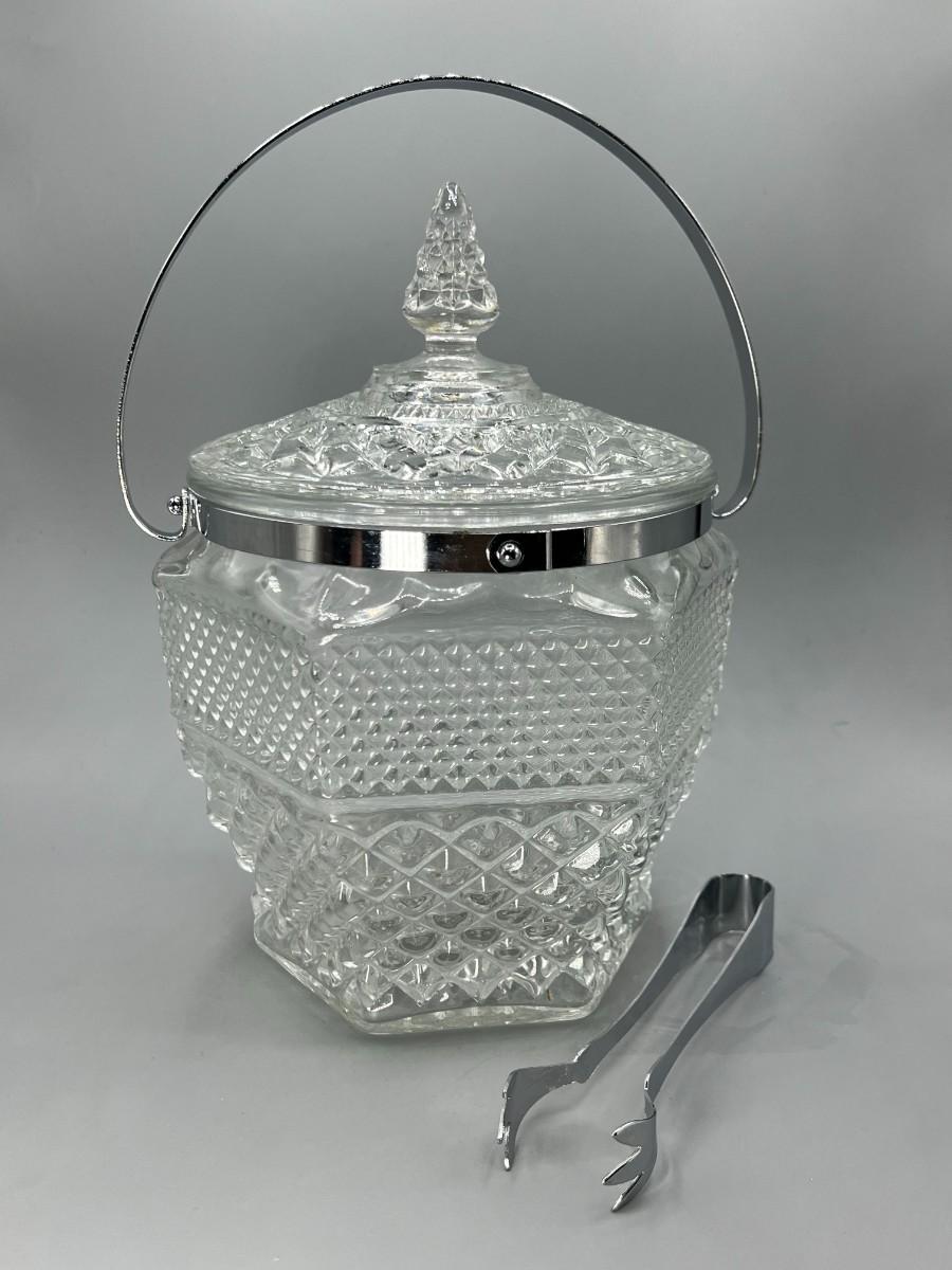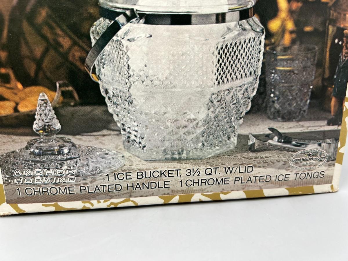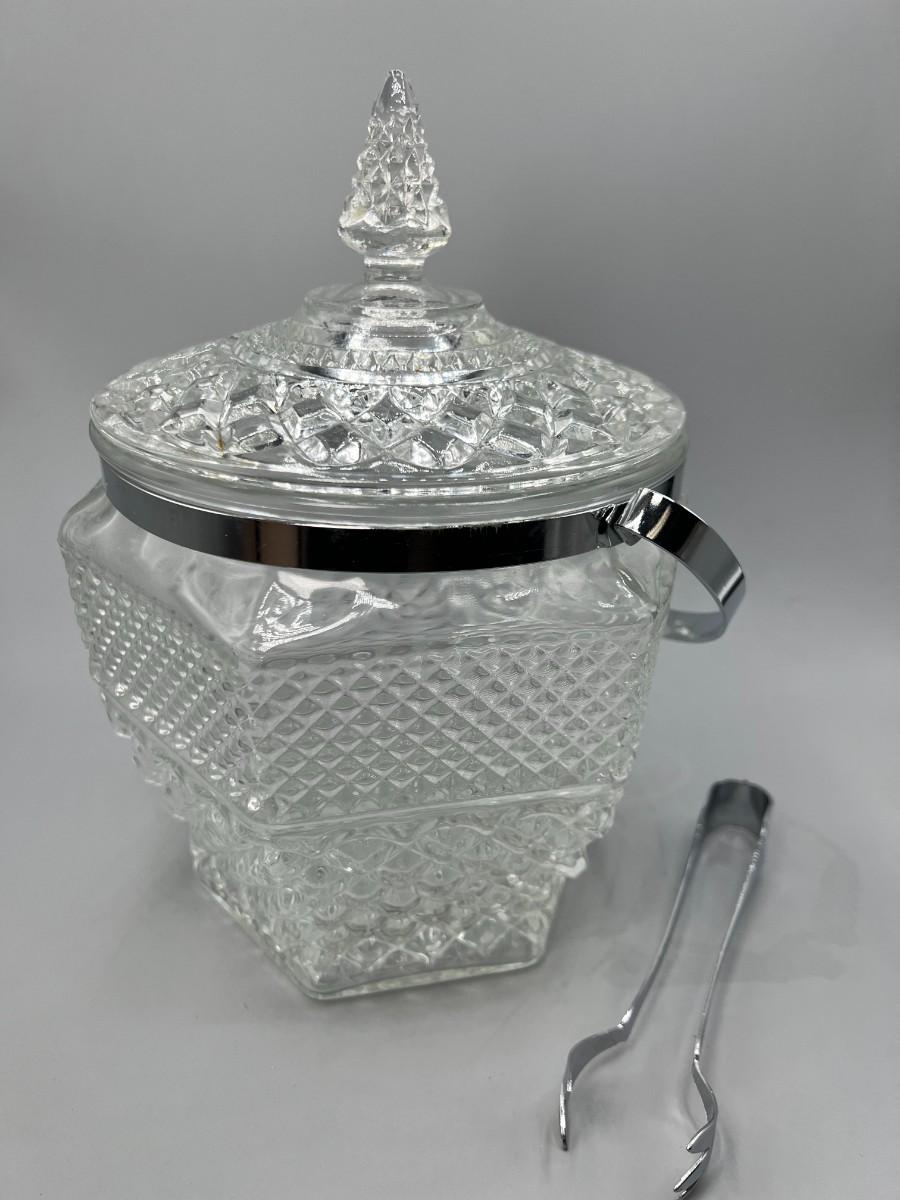 Vintage Wexford Pressed Glass Crystal Lidded Ice Bucket with Tongs in Original Box Anchor Hocking
