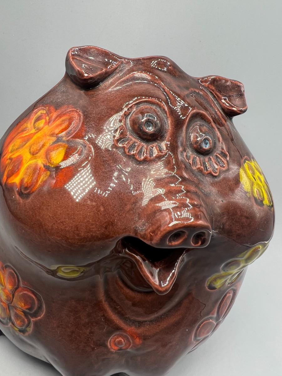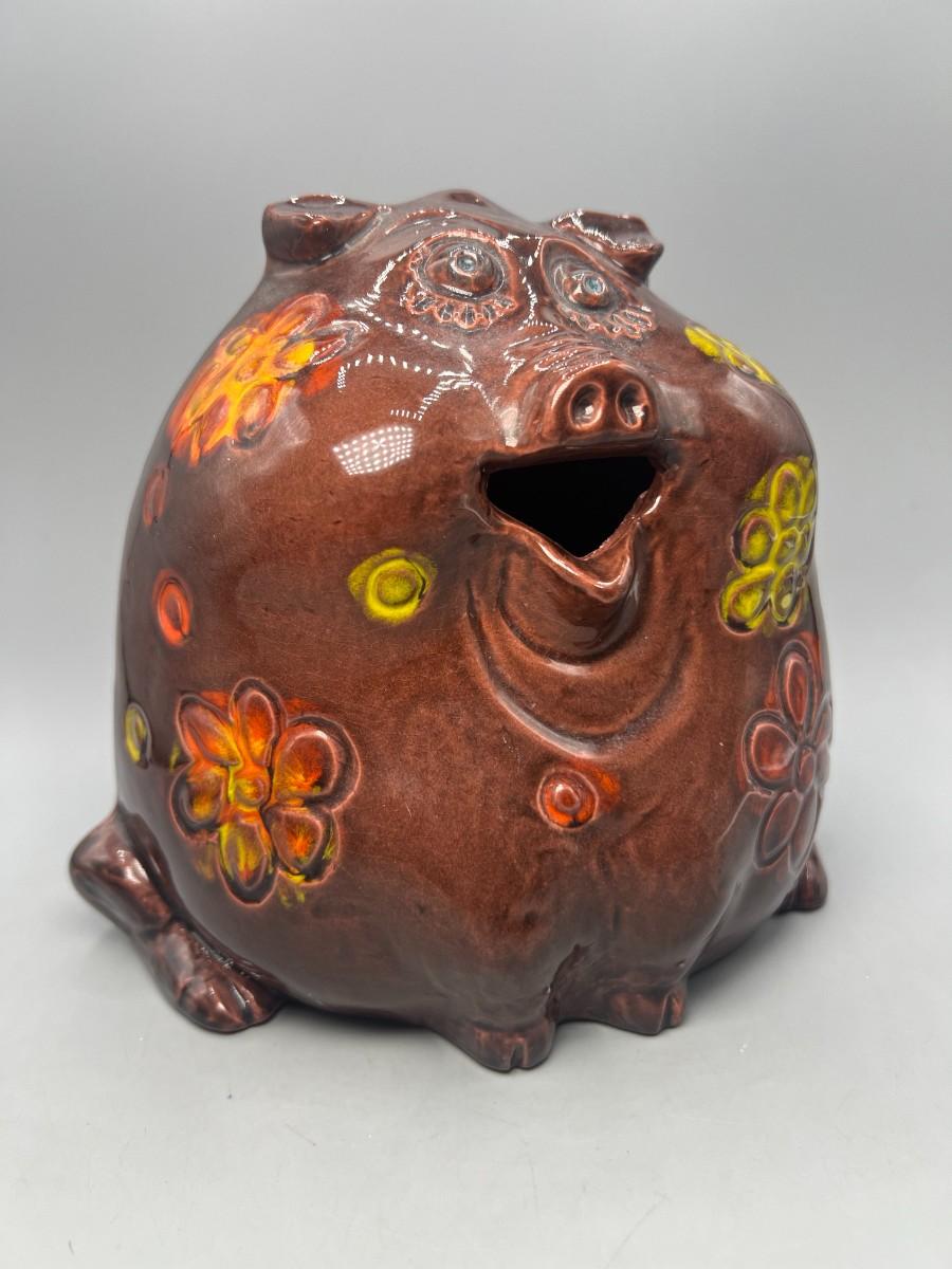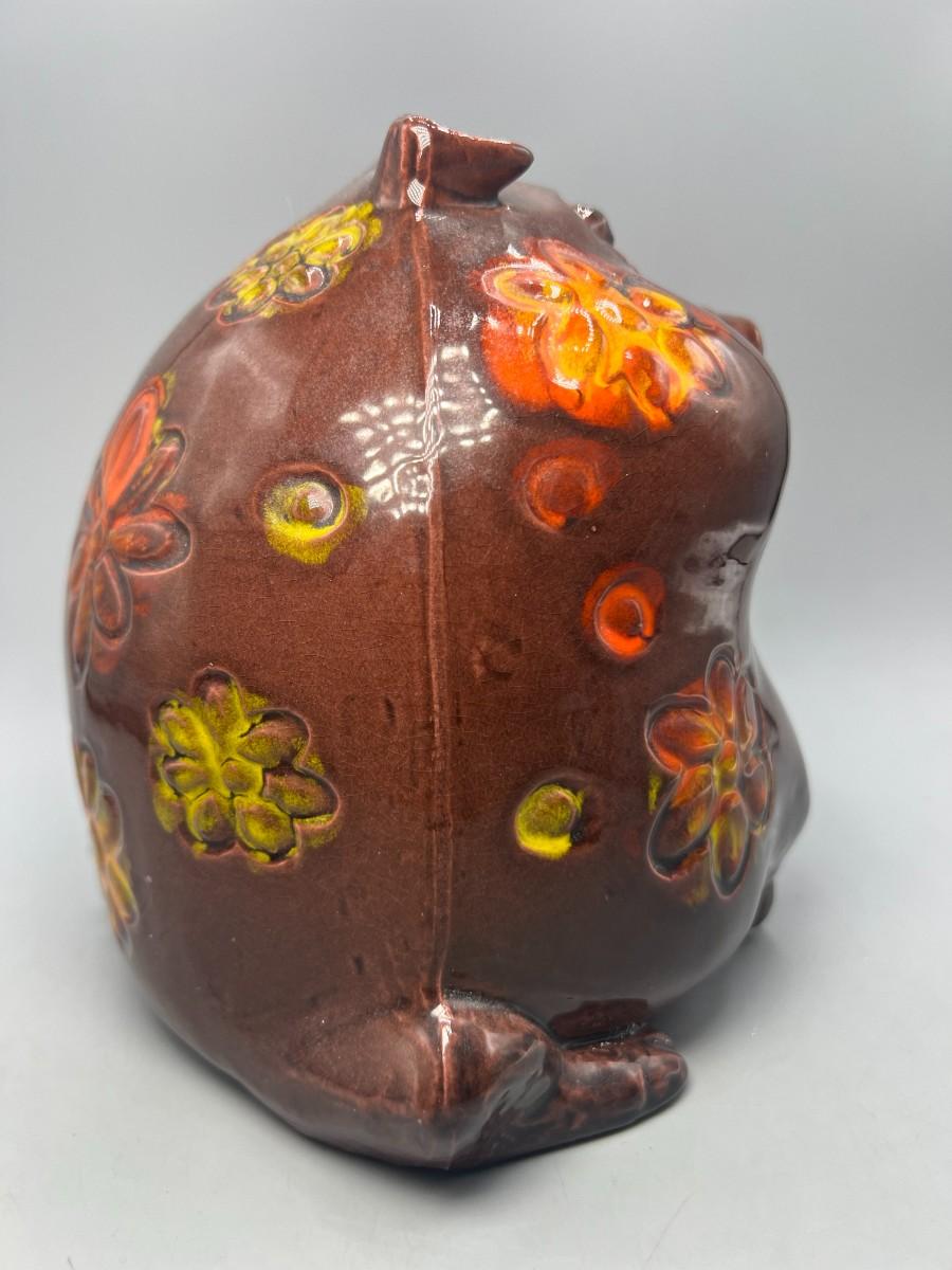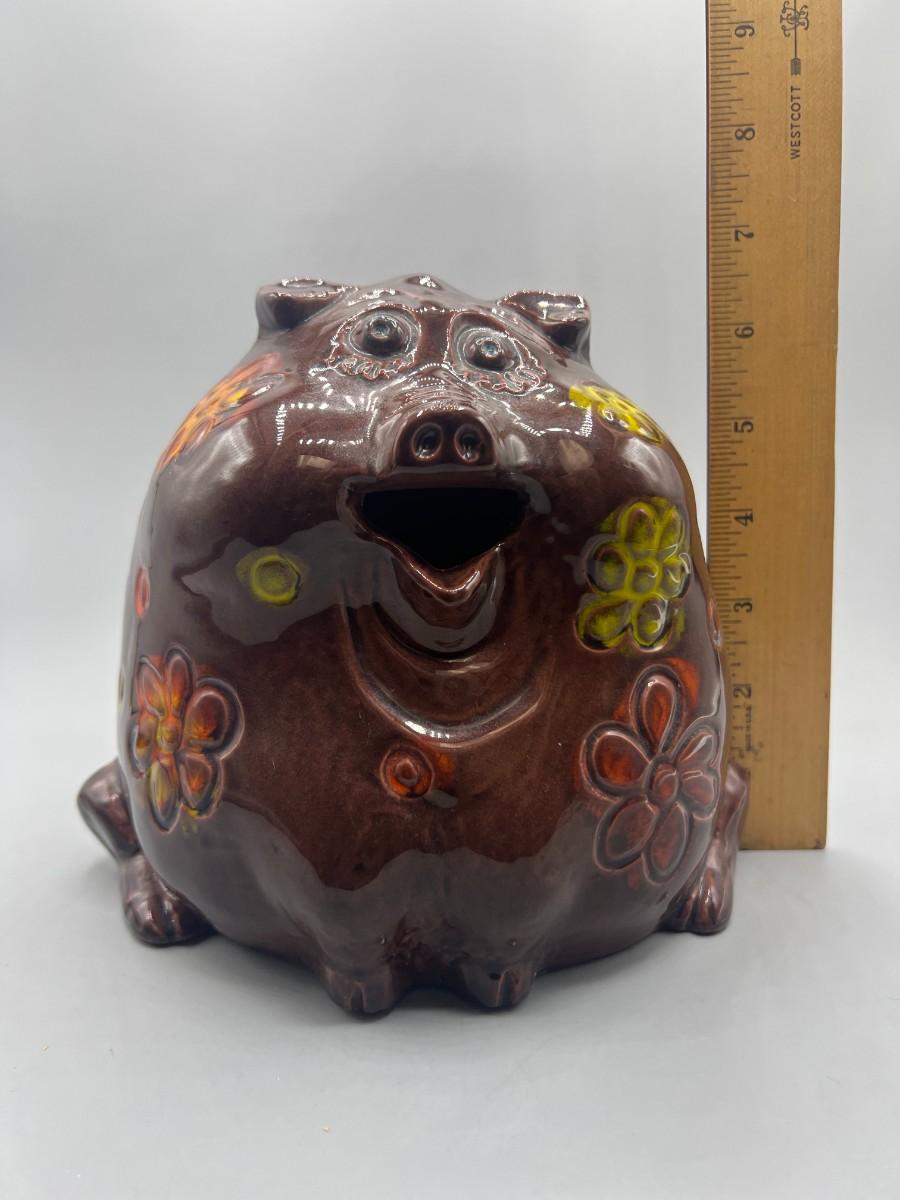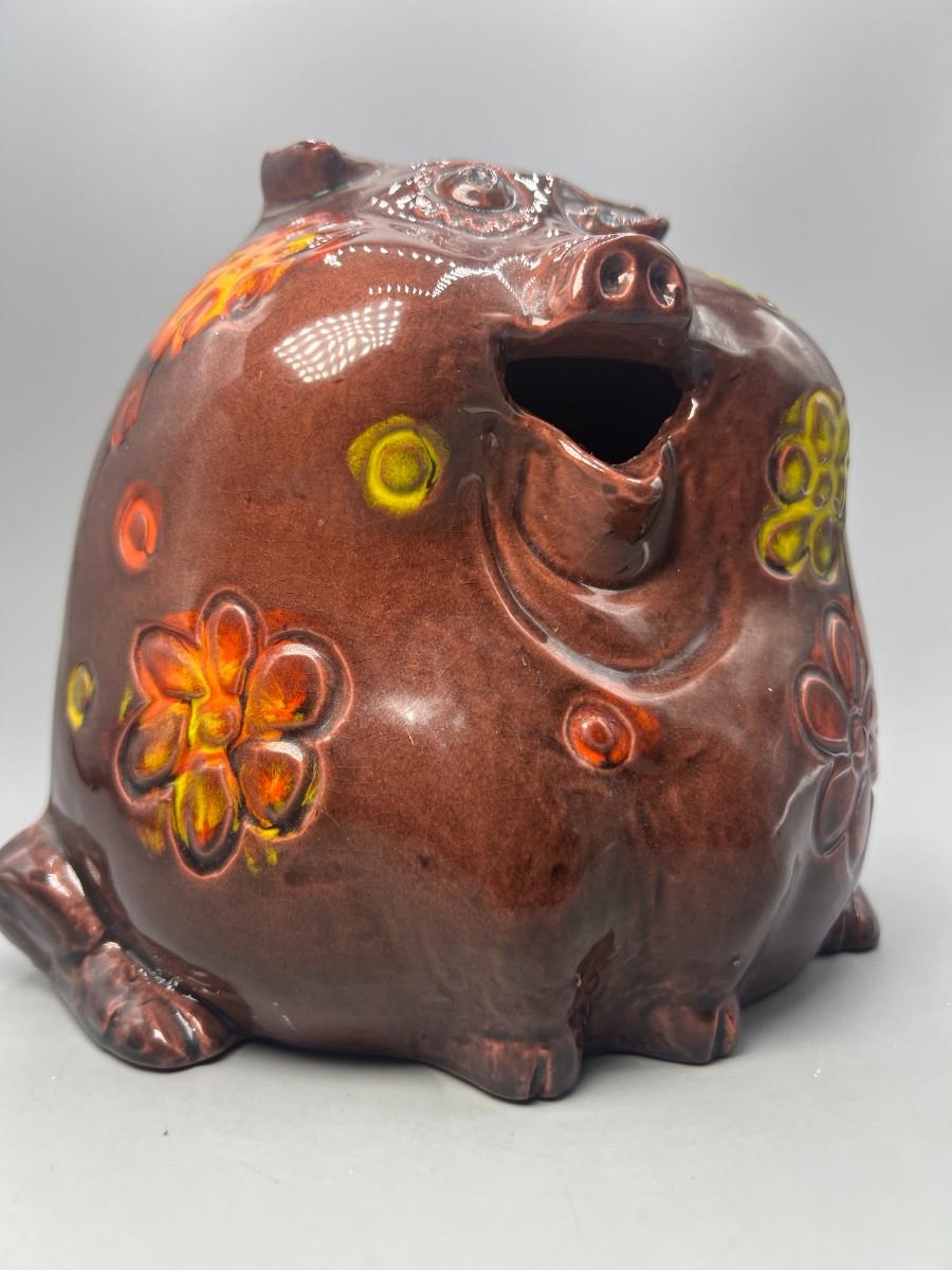 1970 B Welsh Pig Piggy Bank Pacific Stoneware Midcentury Figurine Pottery Brown w Orange & Yellow Flowers