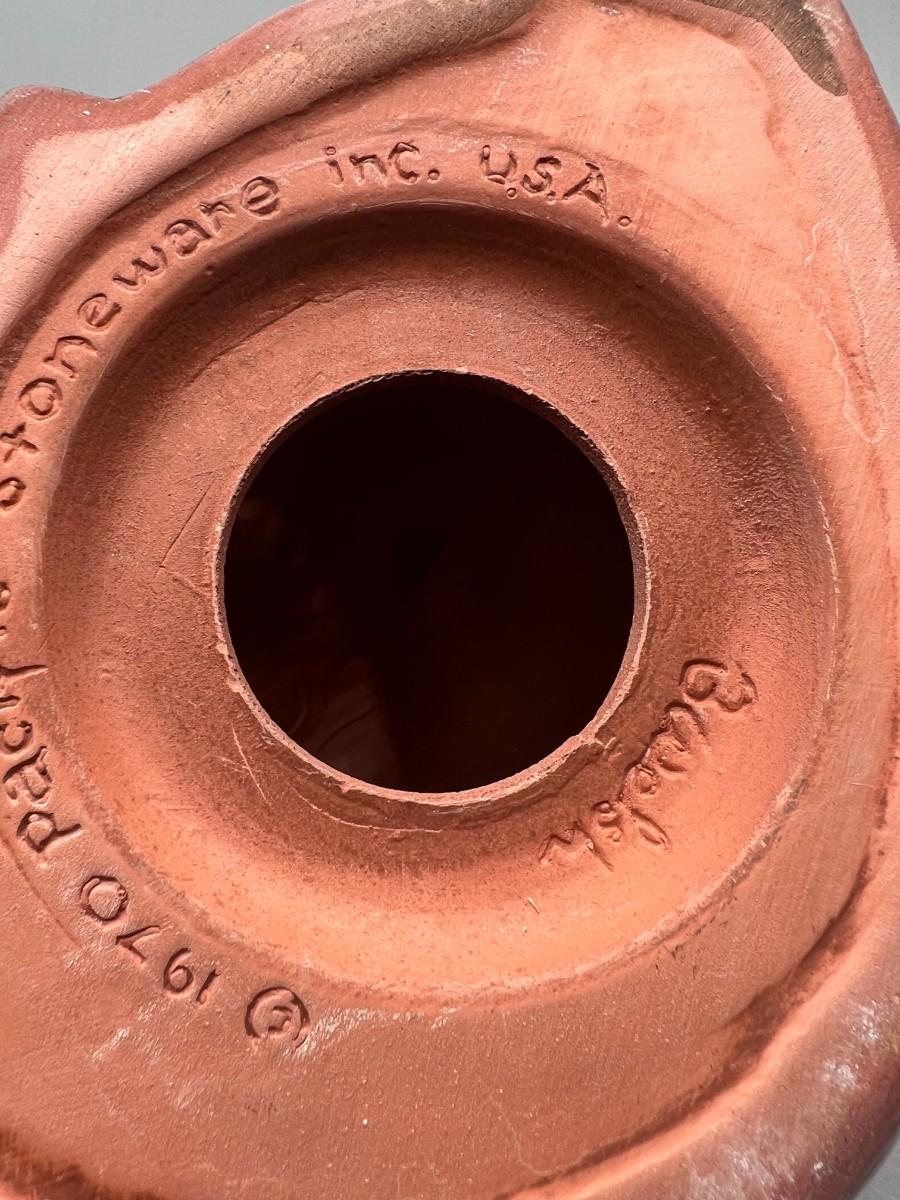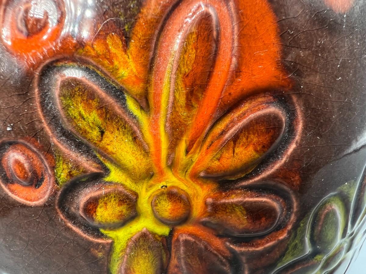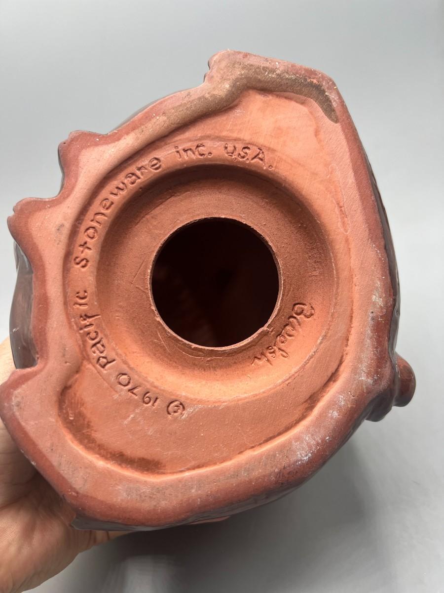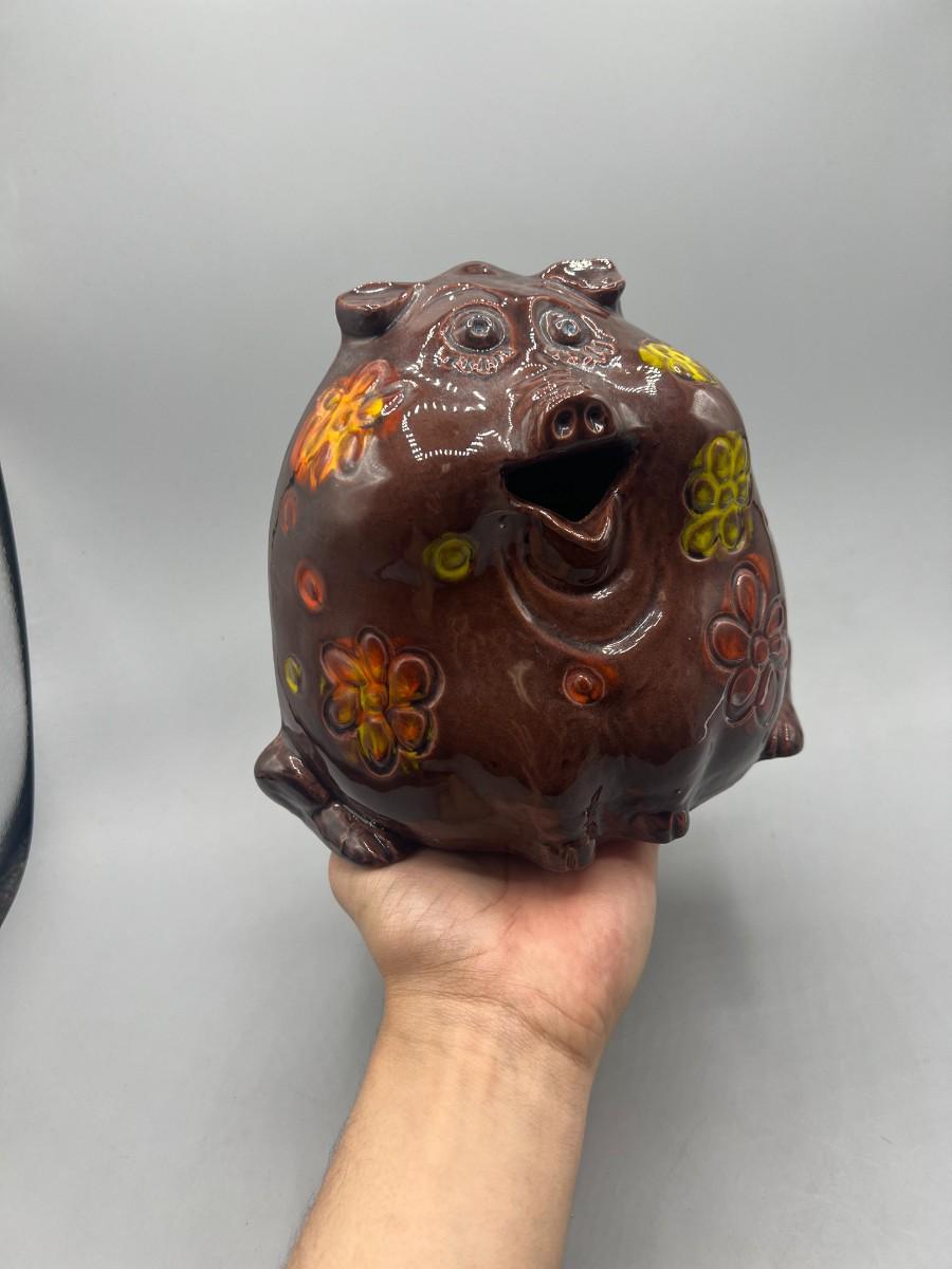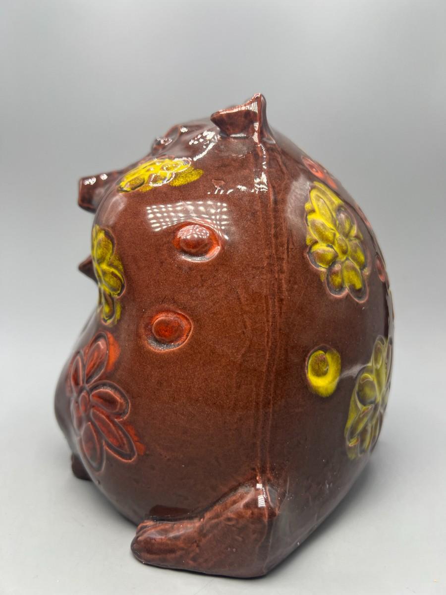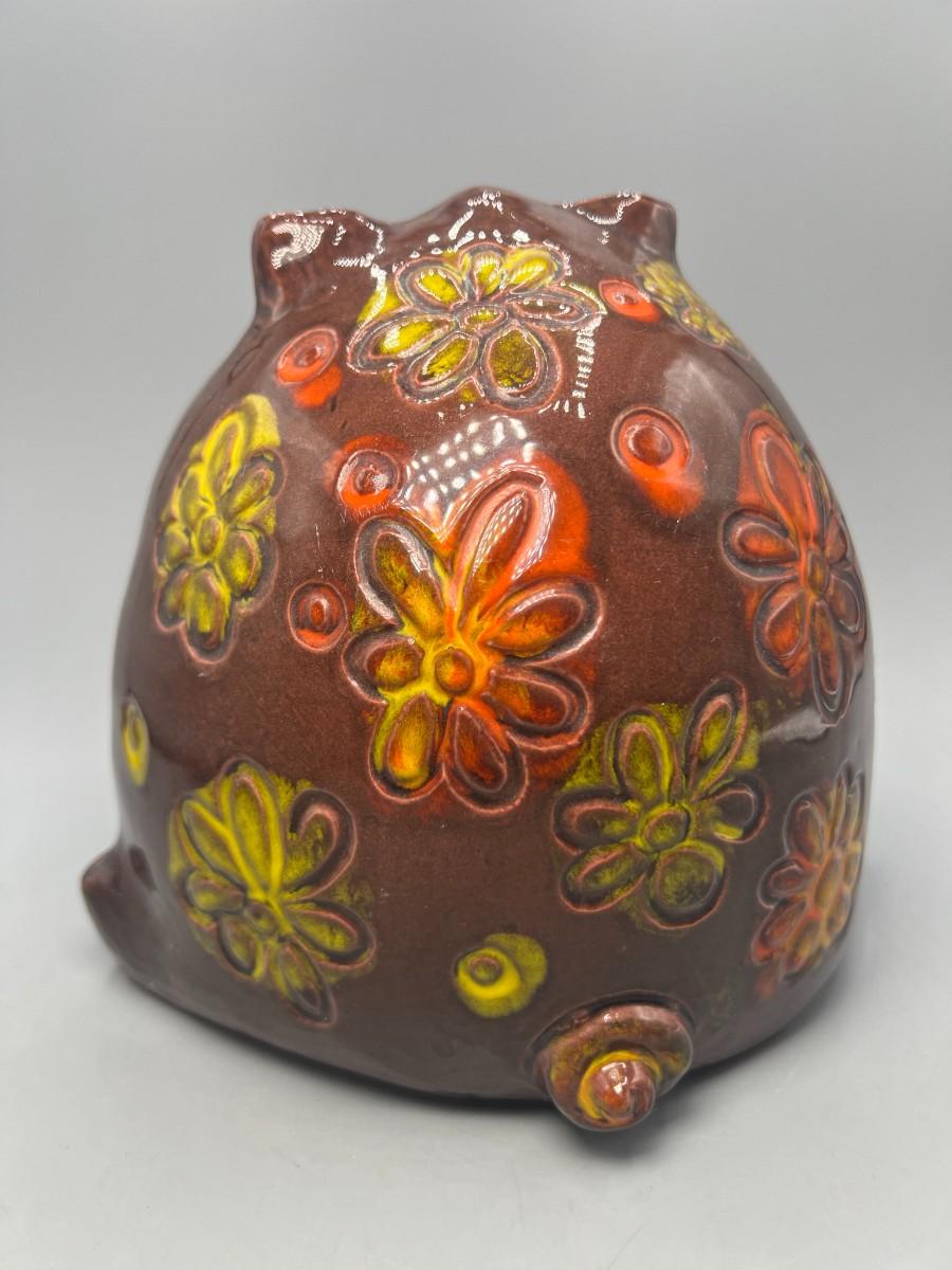 1970 B Welsh Pig Piggy Bank Pacific Stoneware Midcentury Figurine Pottery Brown w Orange & Yellow Flowers