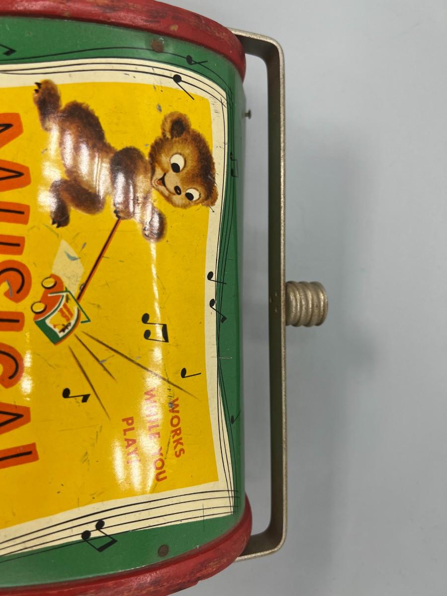 There is some light vintage wear to the toy, but there is no significant damage and is in overall good collectible or displayable condition. The music box still works when pushed around, does not come with broom handle. Check pictures for more details and for sizing.