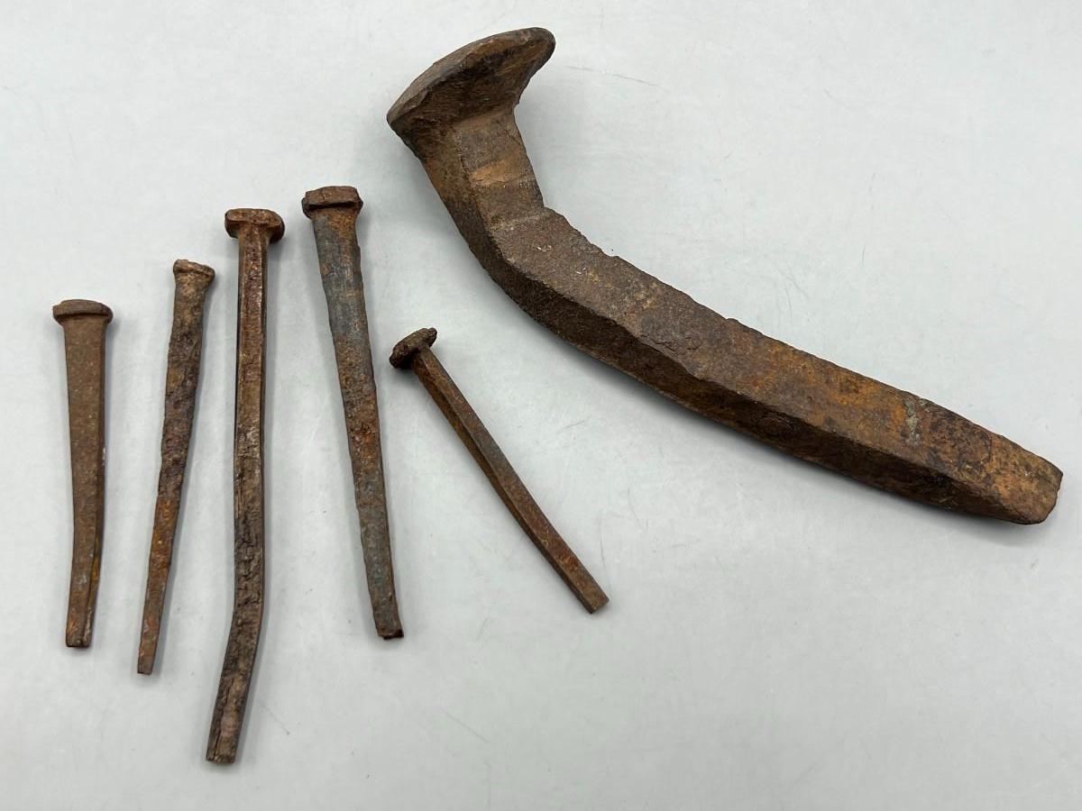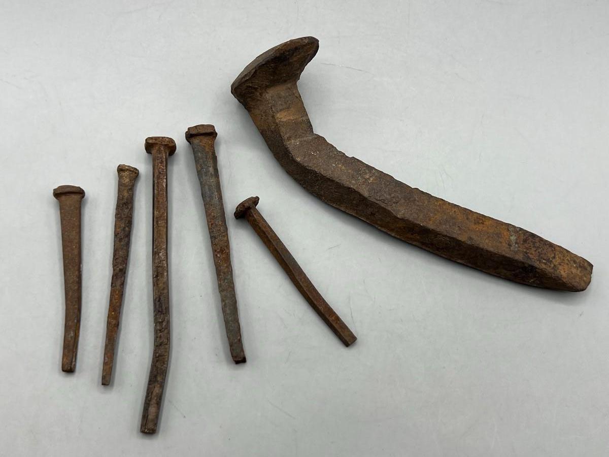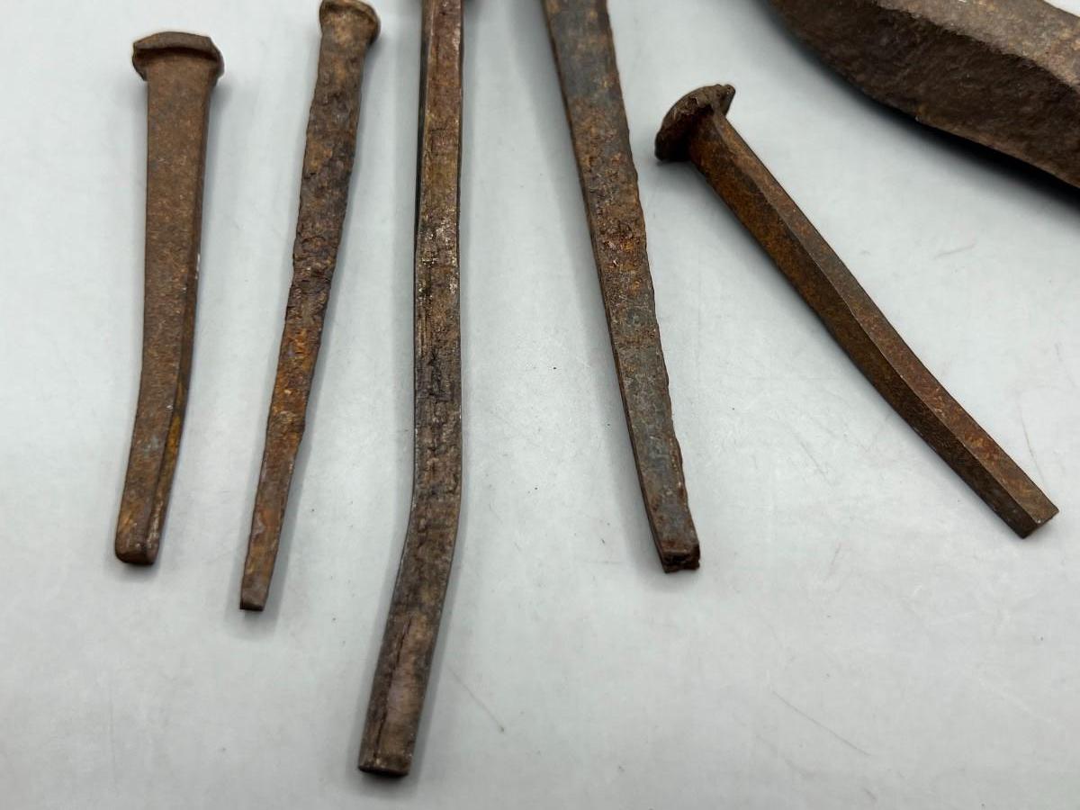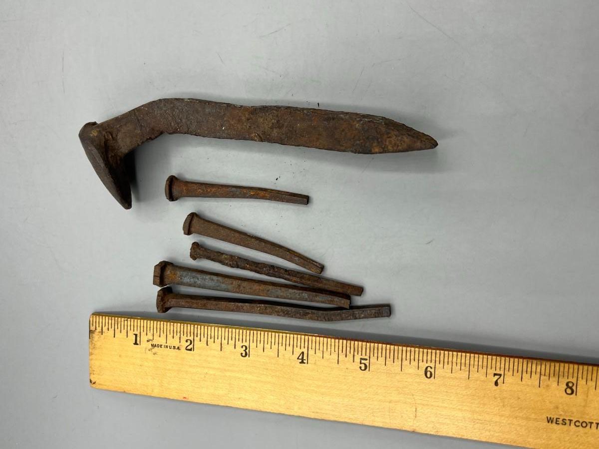 Antique Bent and Rusty Old Railroad Spike and Hand Cut Nails