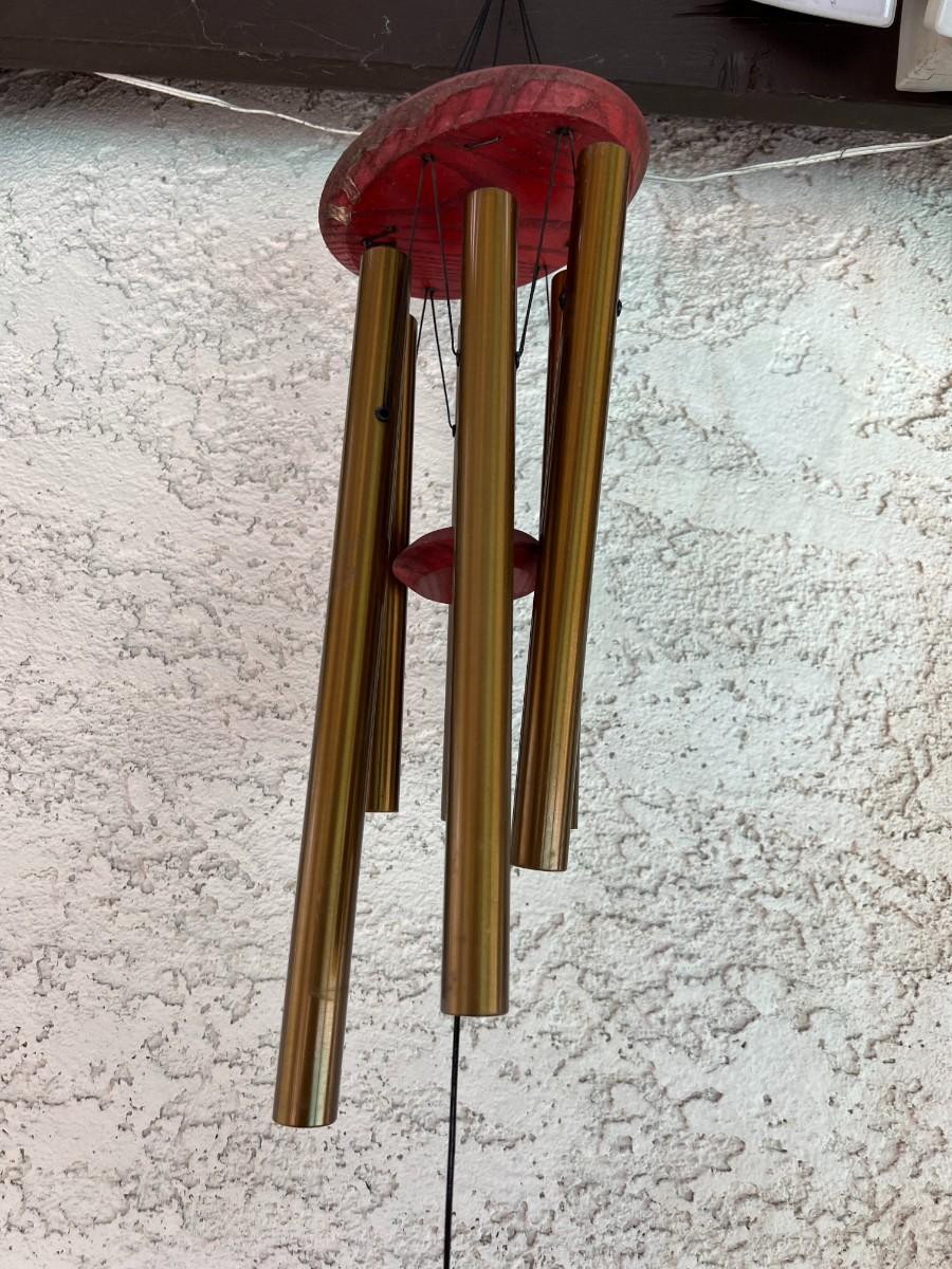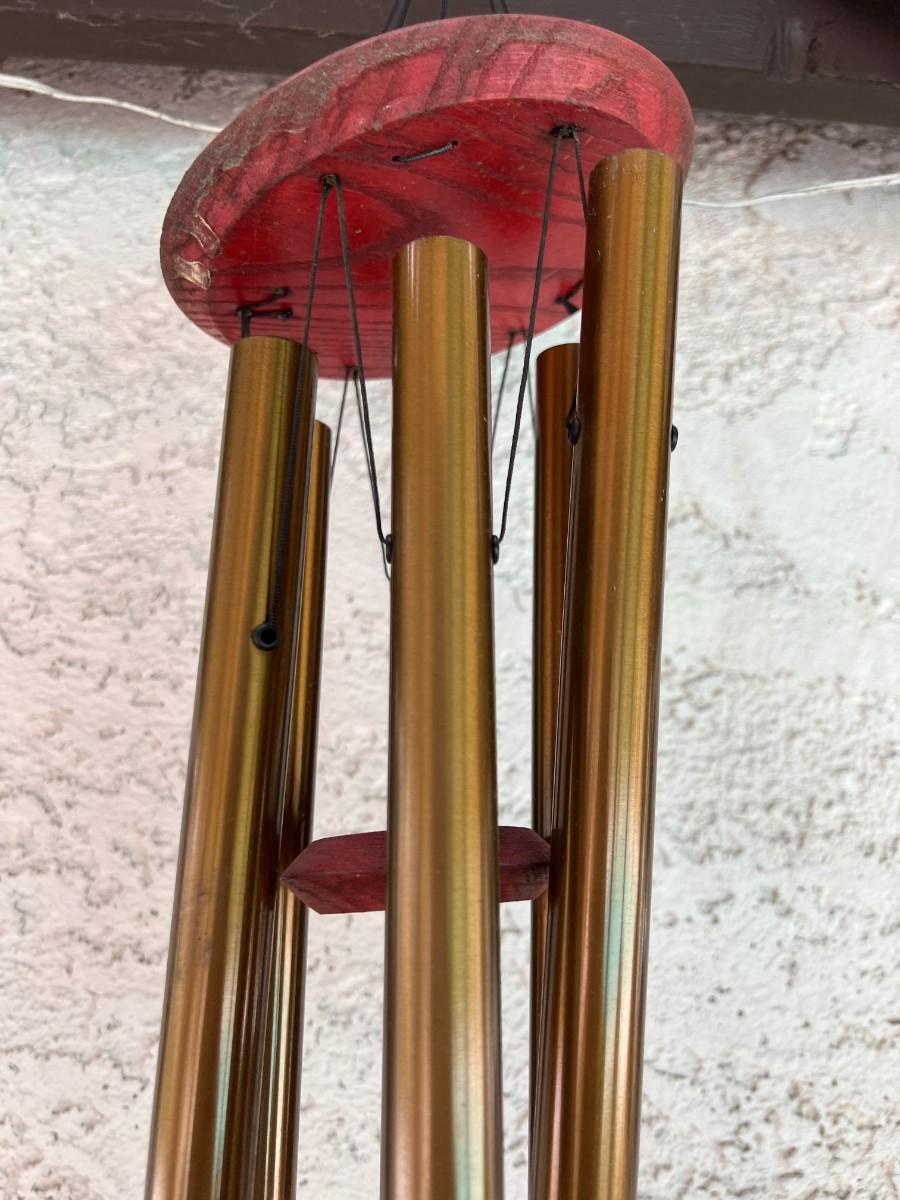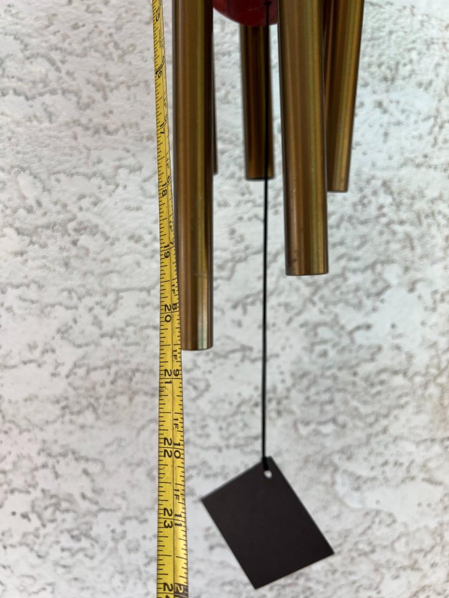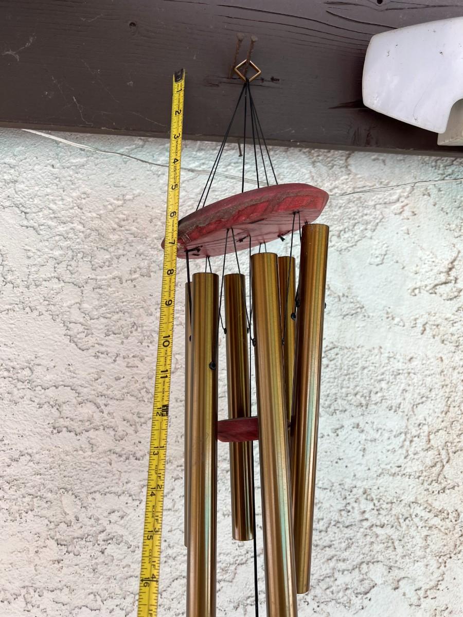 Pair of Gold Tone Metal Brass Hanging Tube Wind Chimes Mother's Day Gift. The wind catcher weight had a note to mom on it, could be repainted or replaced. About 24" length.
