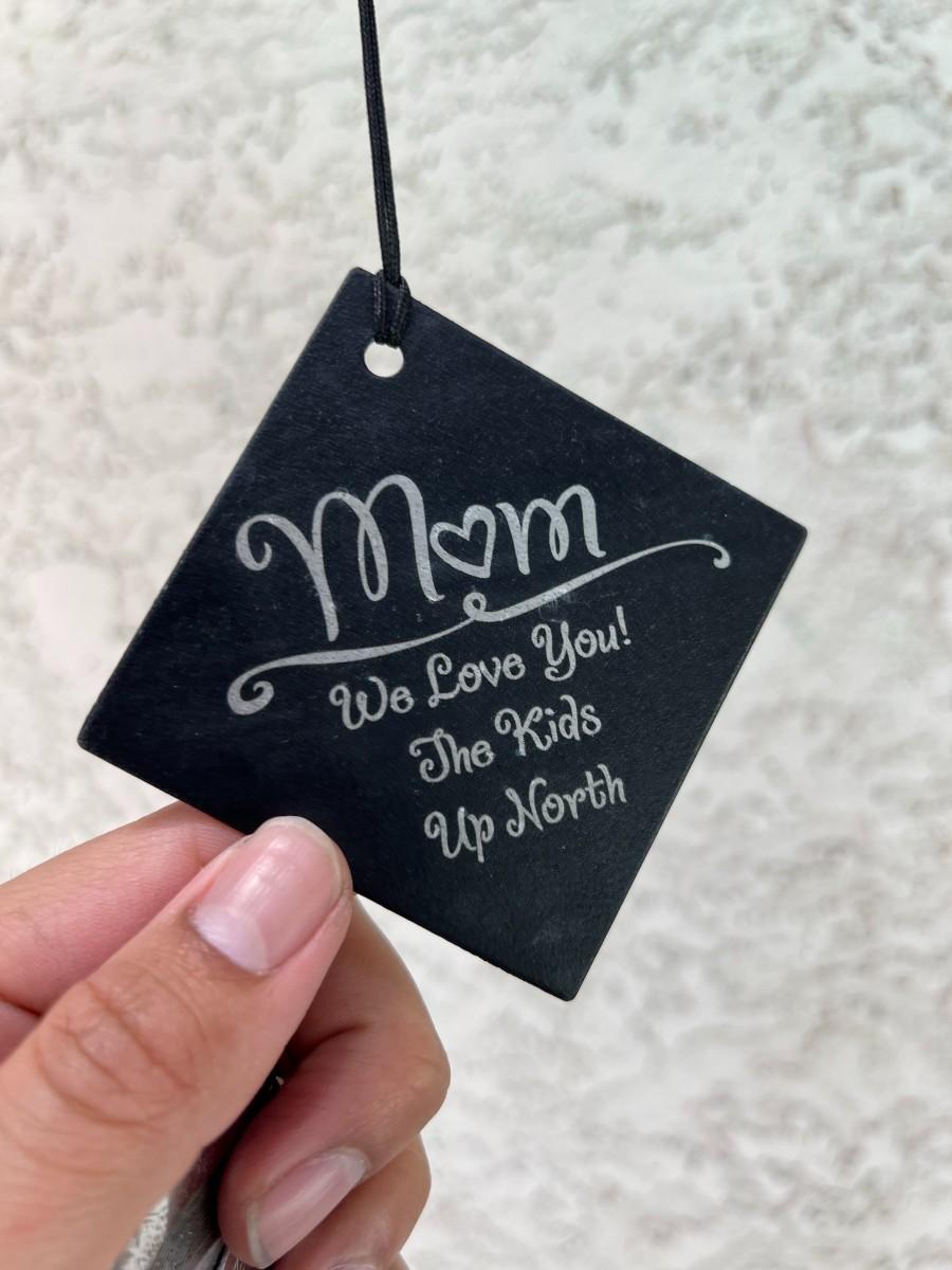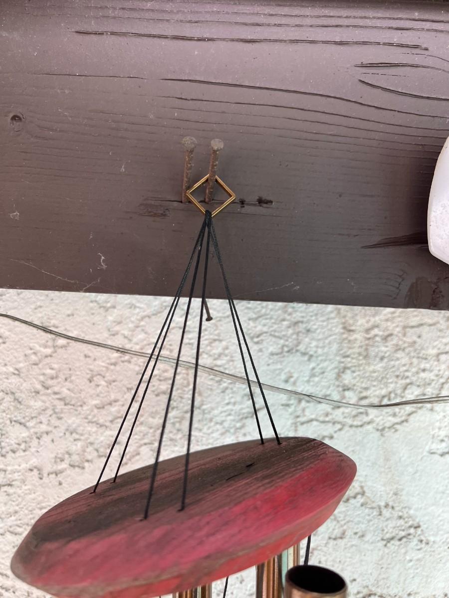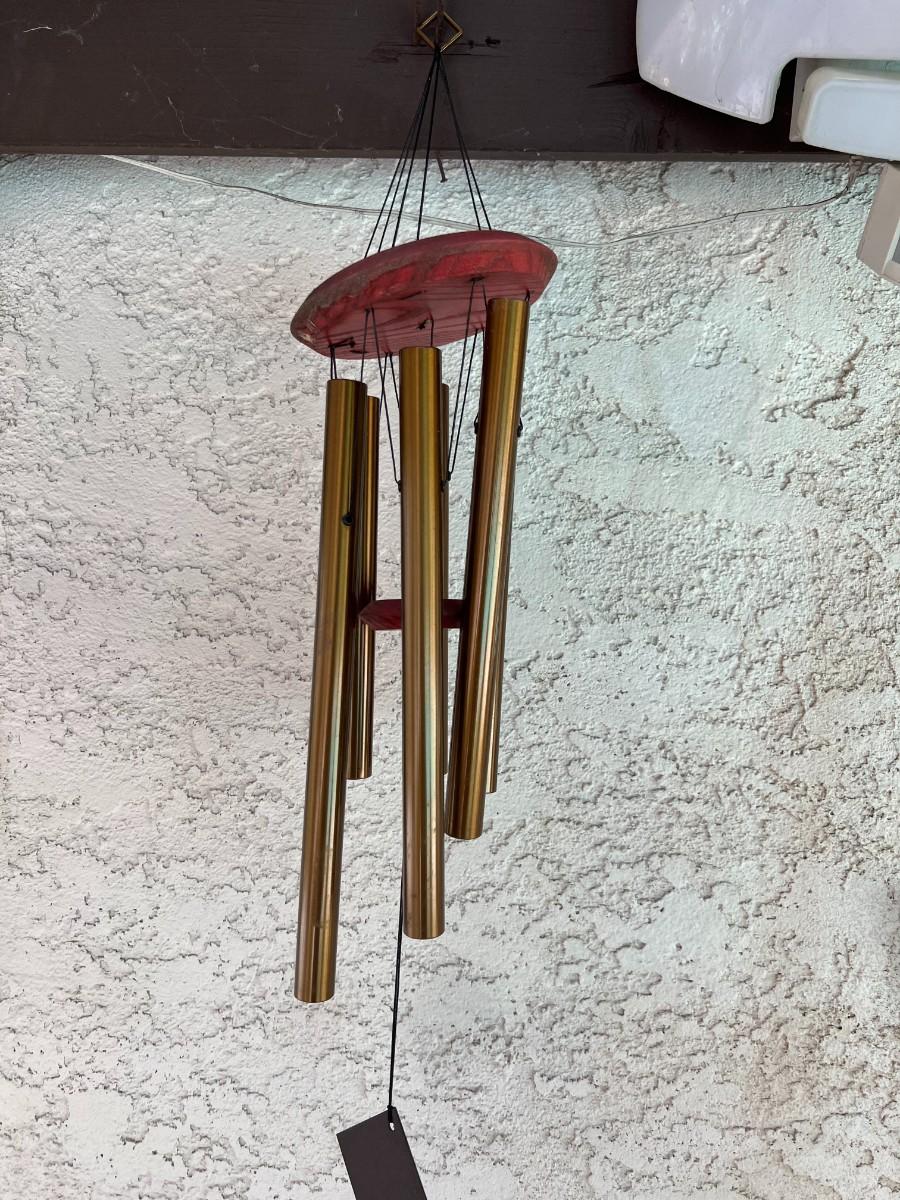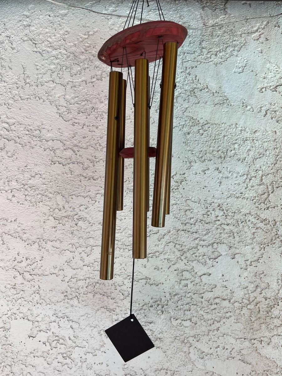 Pair of Gold Tone Metal Brass Hanging Tube Wind Chimes Mother's Day Gift. The wind catcher weight had a note to mom on it, could be repainted or replaced. About 24" length.