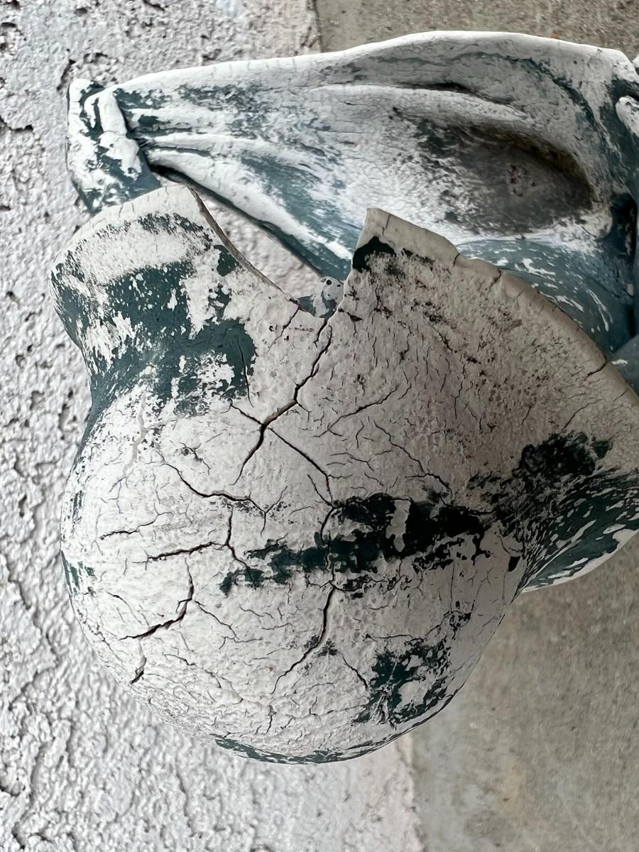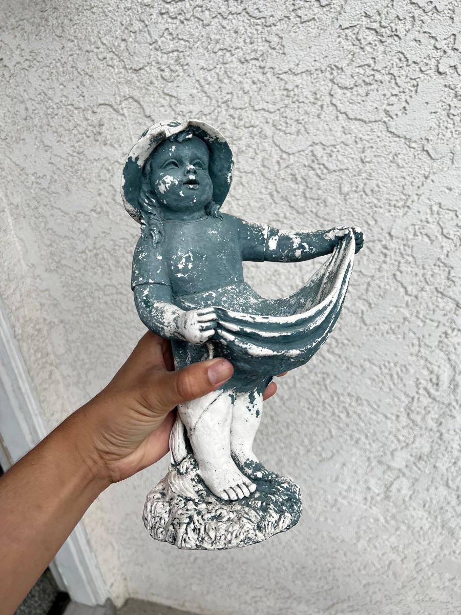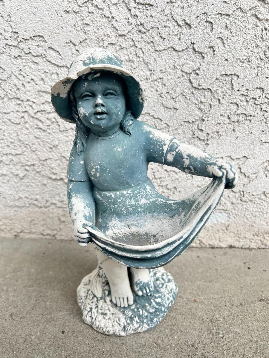 There is some cracking to the figurine, but no significant damage. In good condition to be used in a home garden.