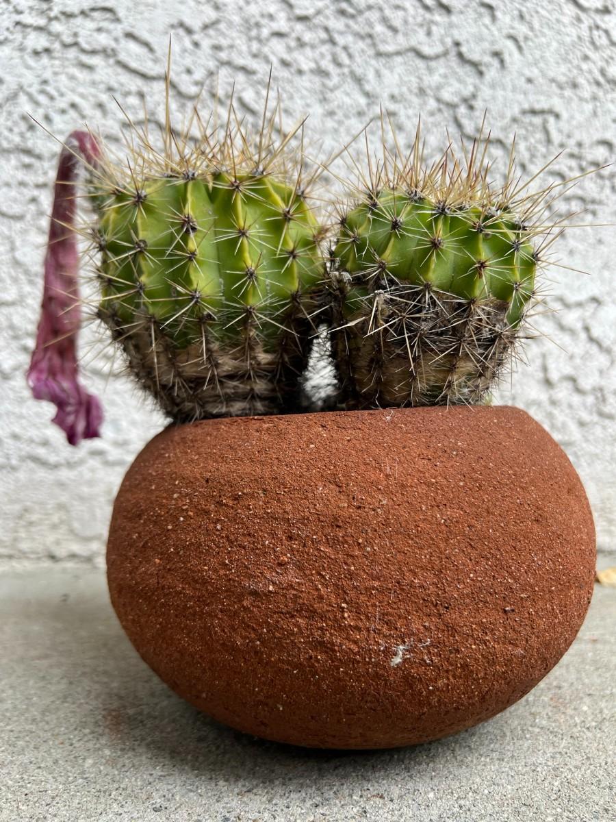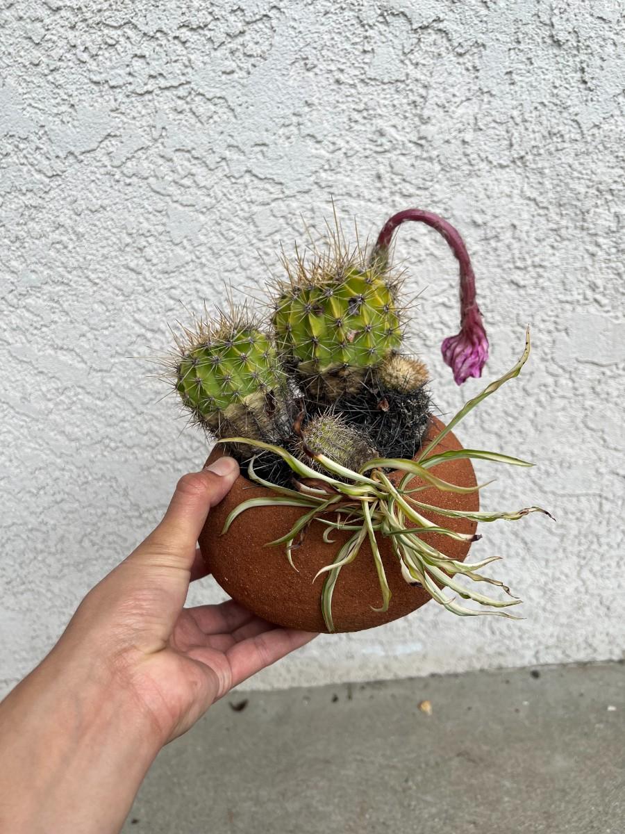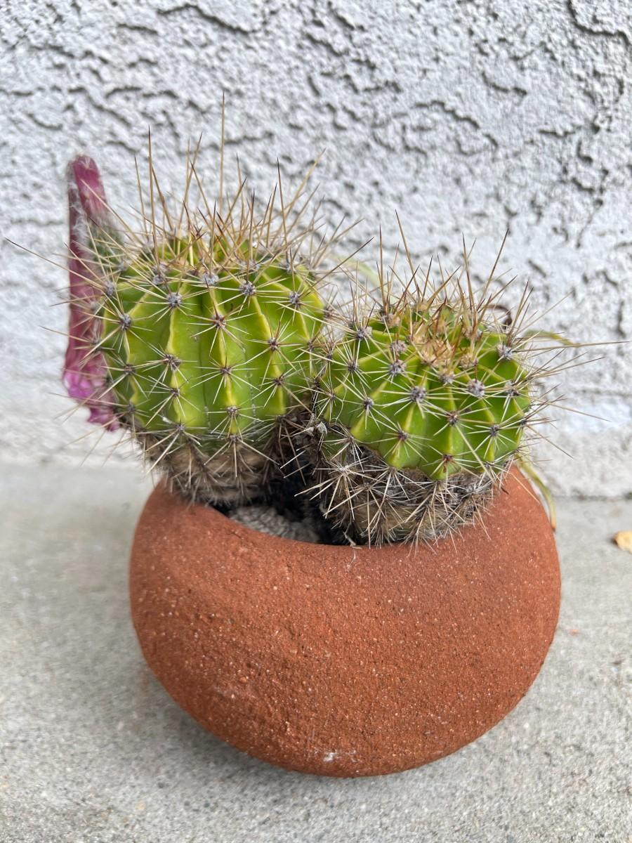 There is no damage to the pottery planter or the cactus and is in good displayable condition. Can also be replanted. Around 6 inches tall.
