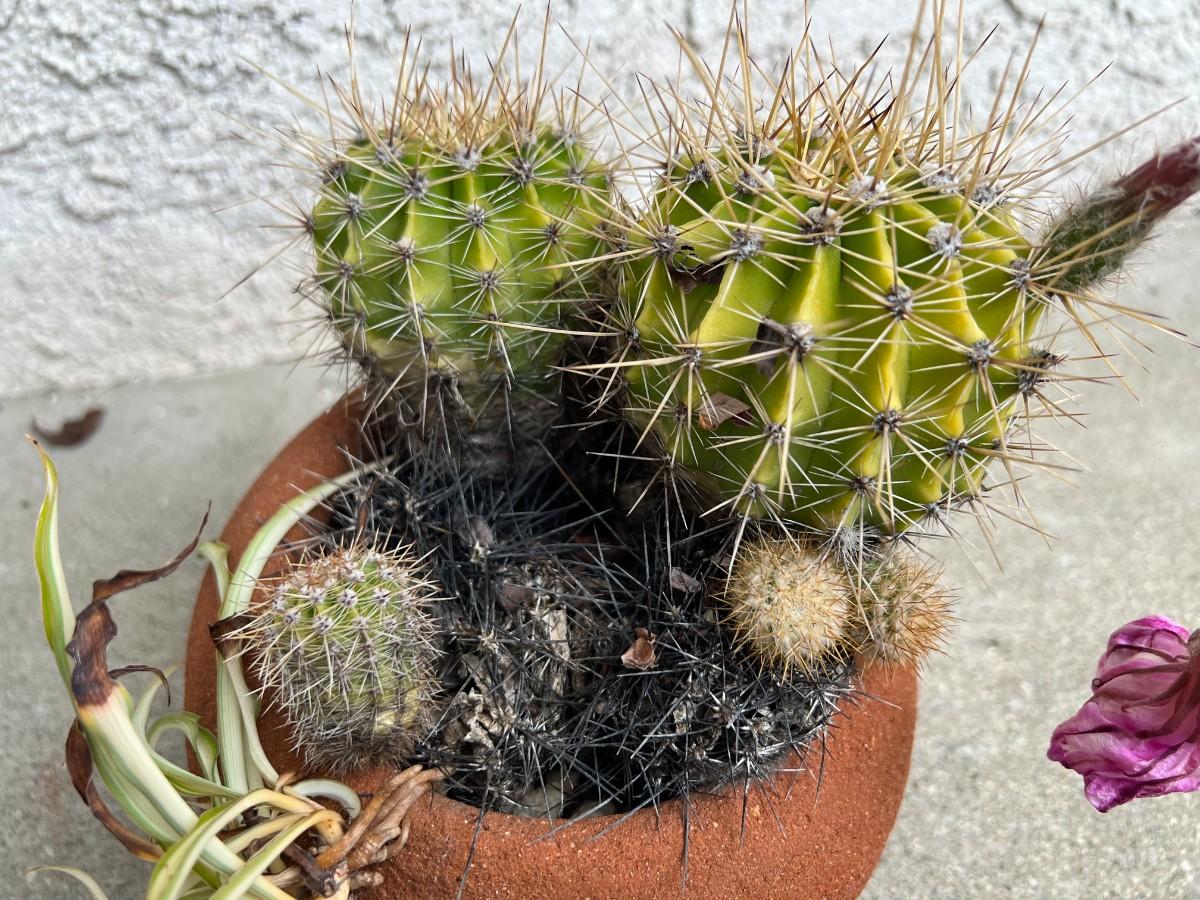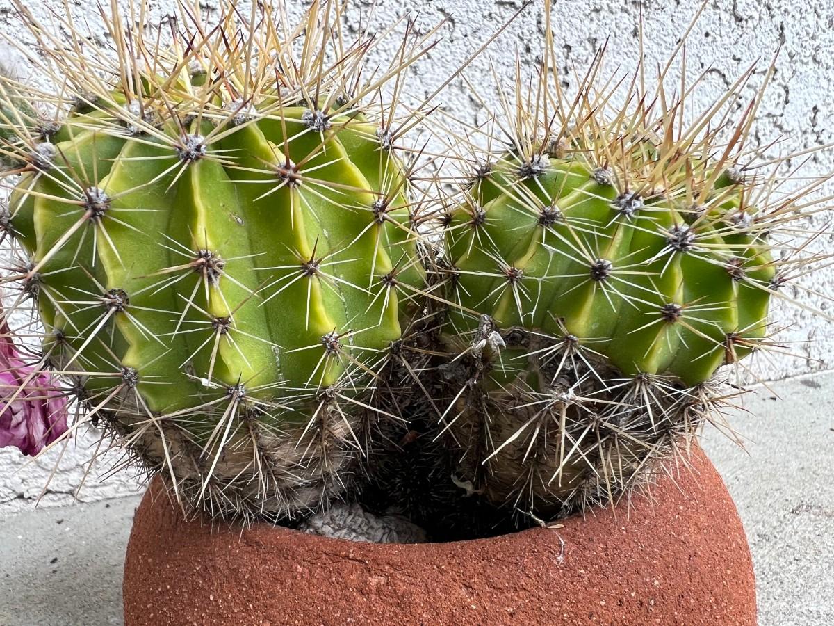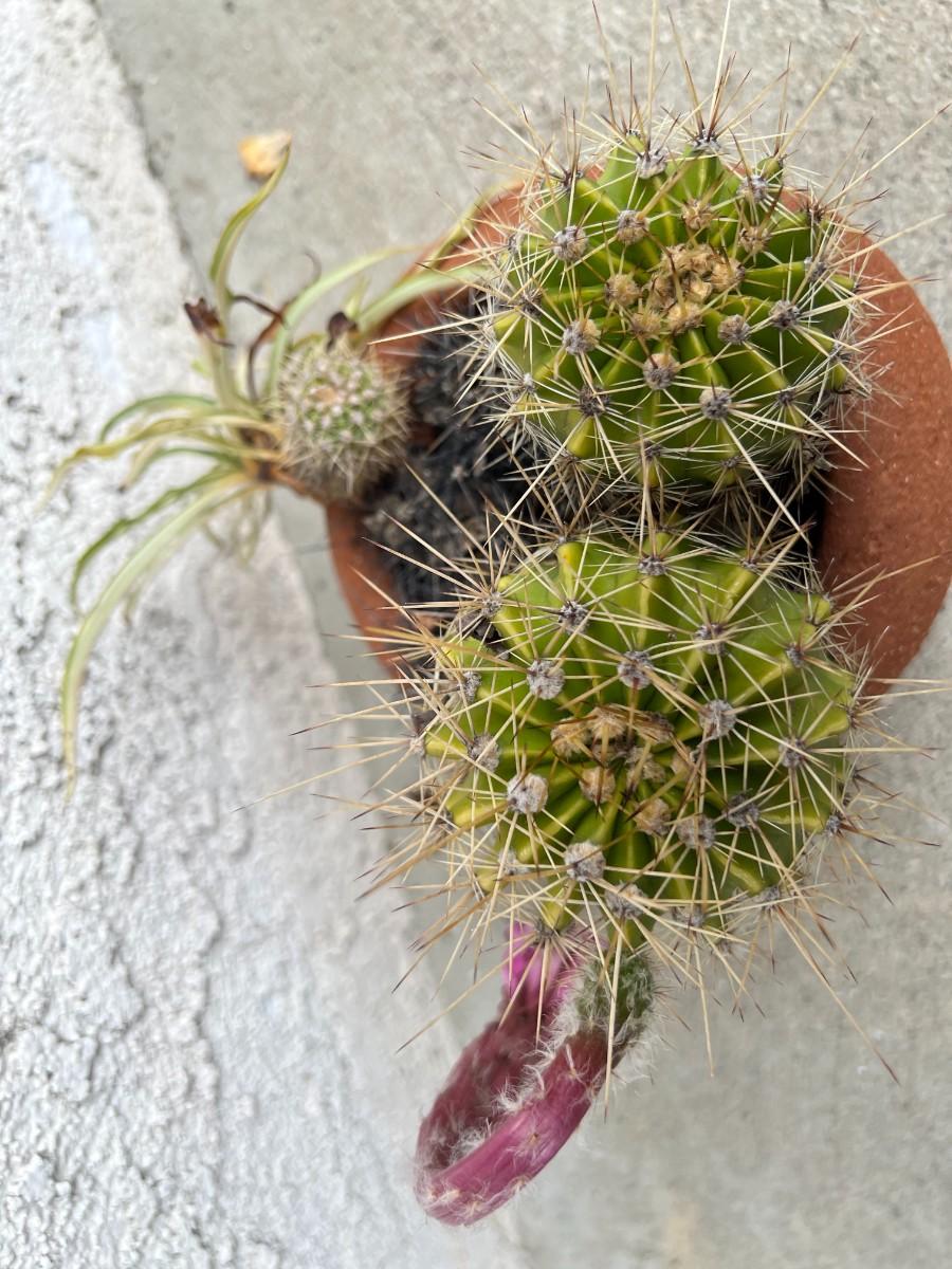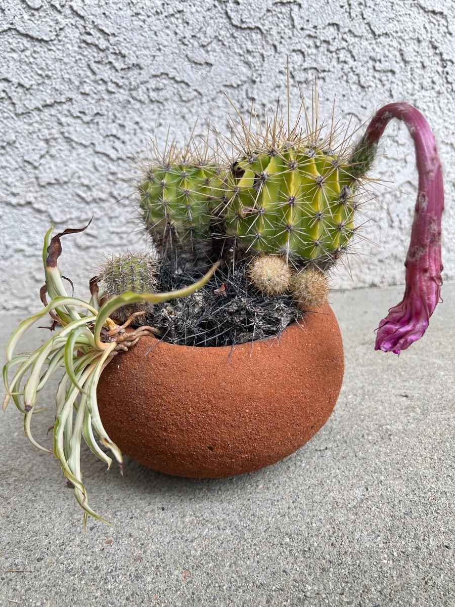 There is no damage to the pottery planter or the cactus and is in good displayable condition. Can also be replanted. Around 6 inches tall.