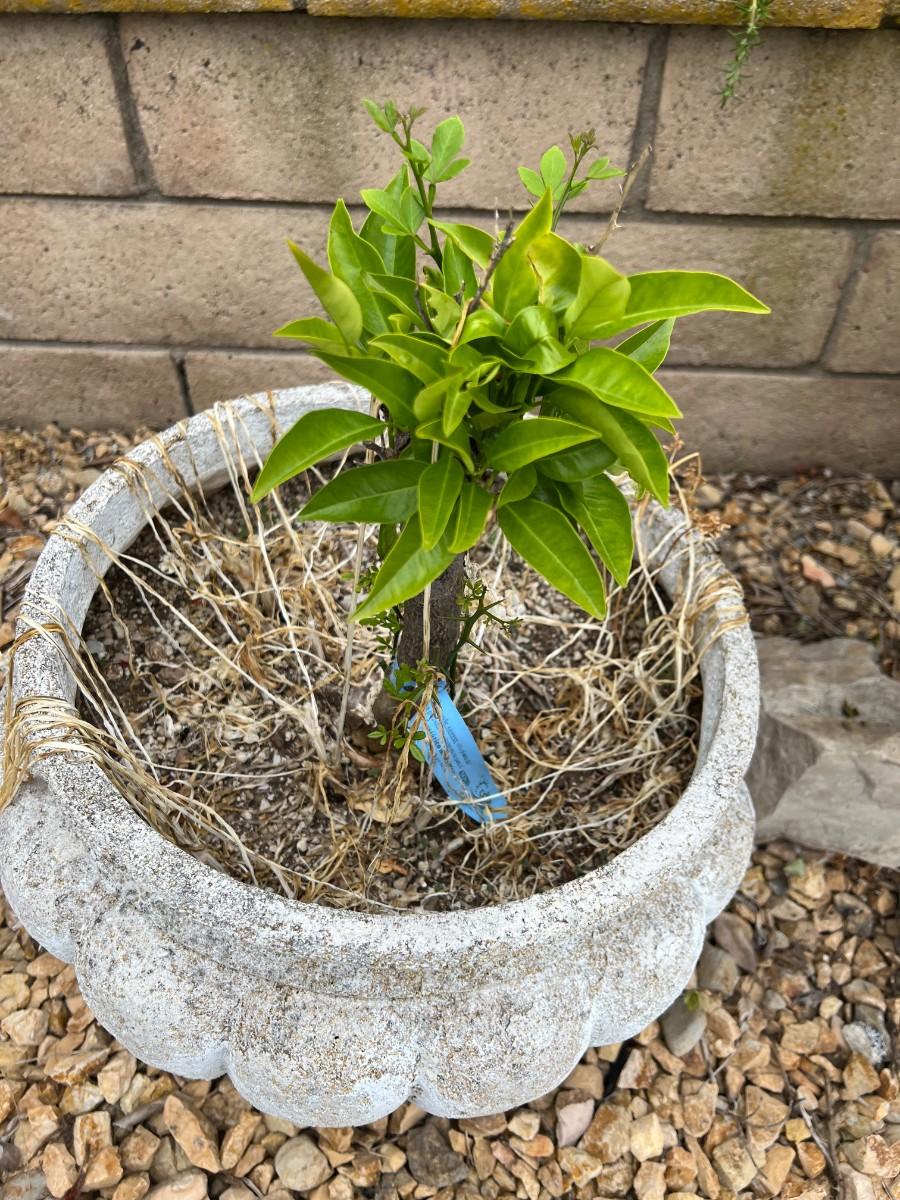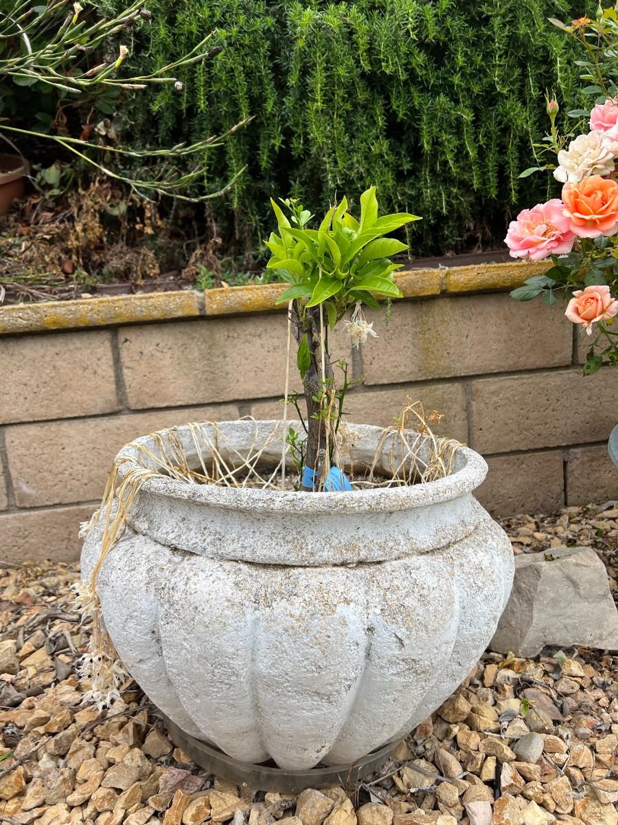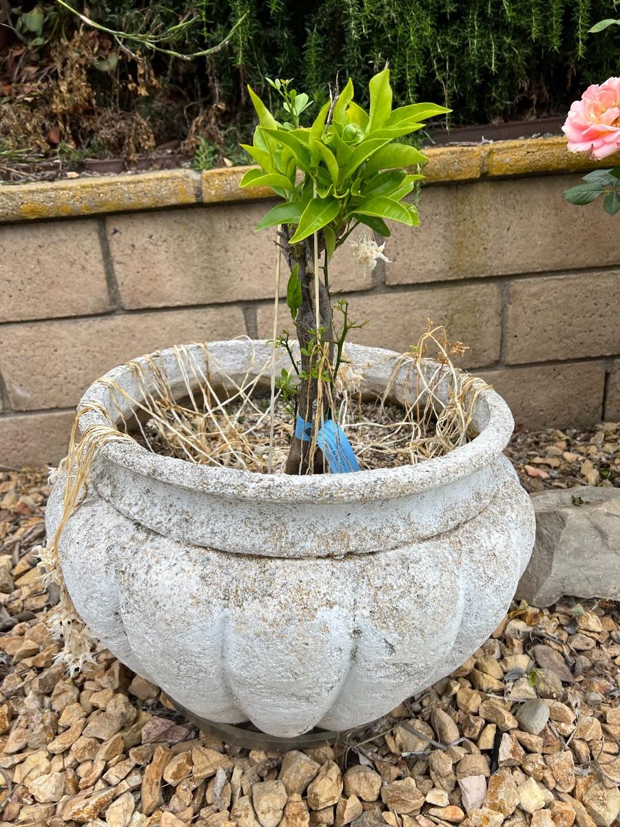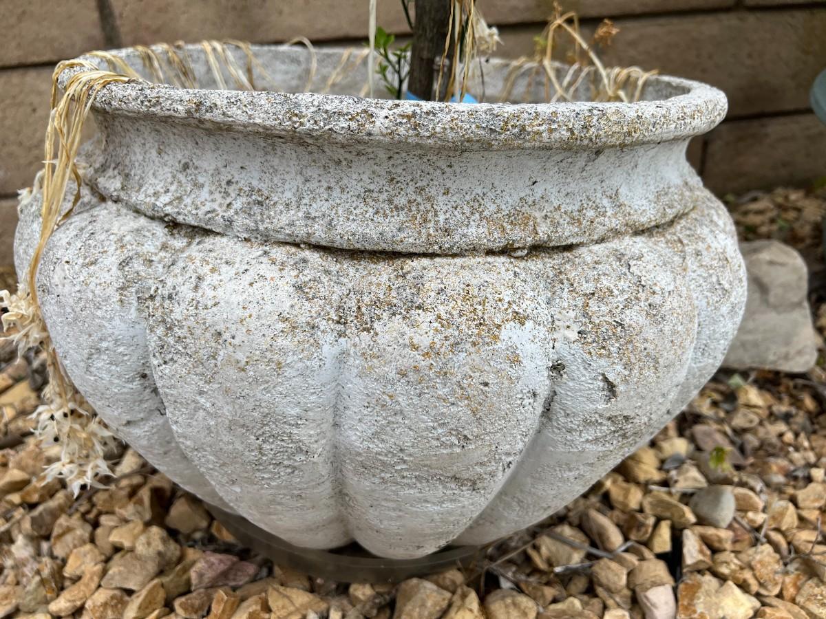 There is no damage to the planter or the plant and is in good displayable condition. Around 30 inches tall.