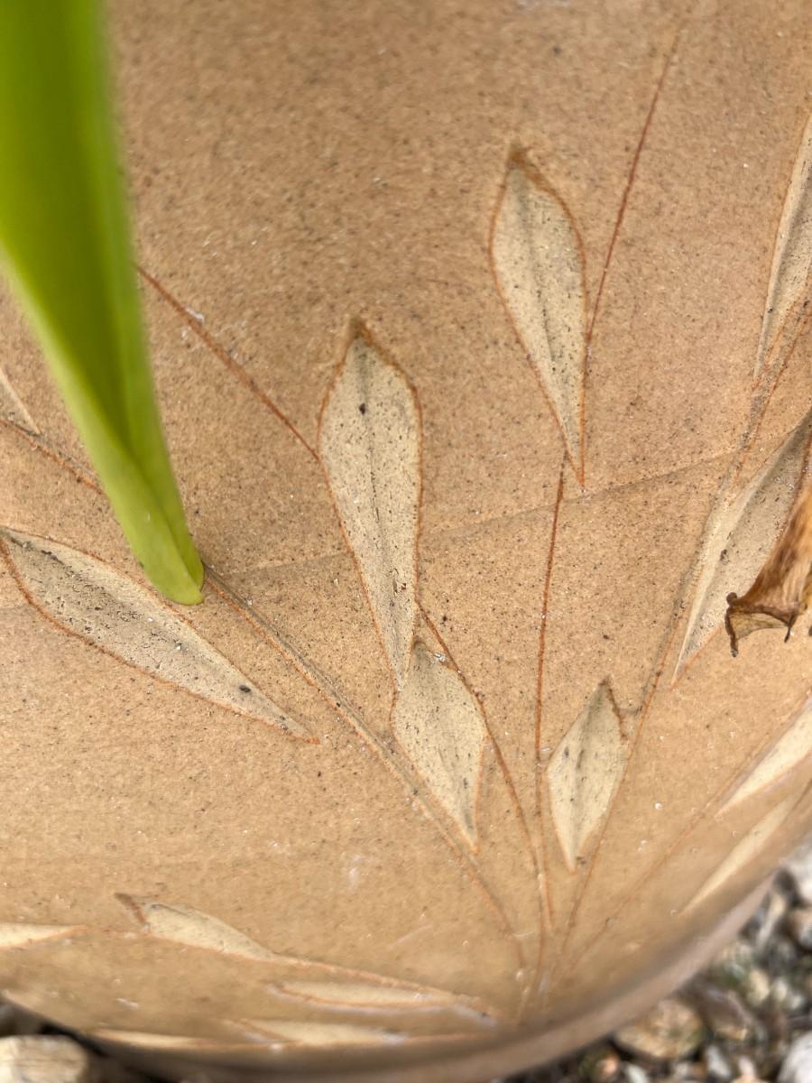 The planter is around a foot and a half tall and is in overall good displayable condition. The designs are made from an etched/scooped out pottery tool.