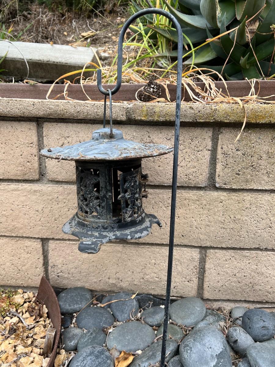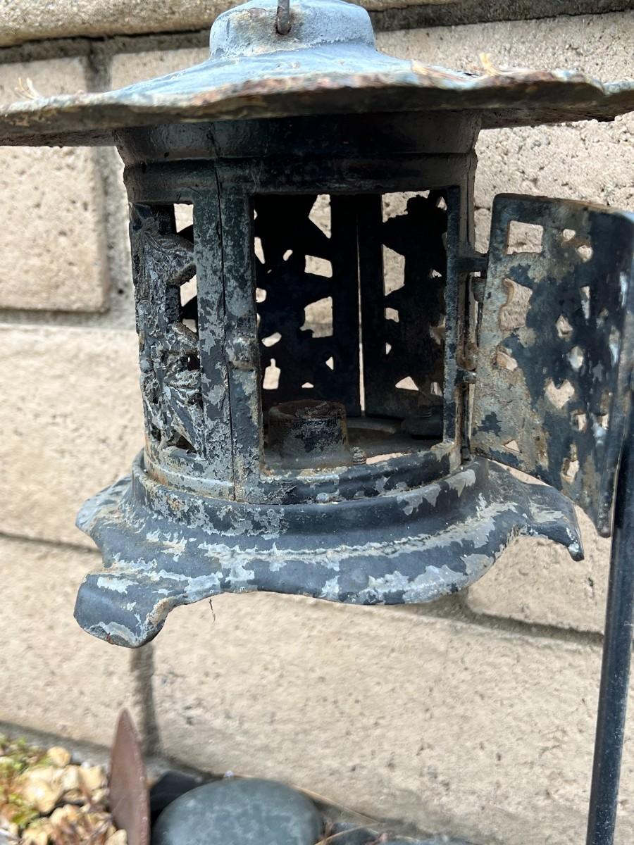 There is wear to the cast metal pagoda from being outside, but there is no significant damage and is in good displayable condition.
