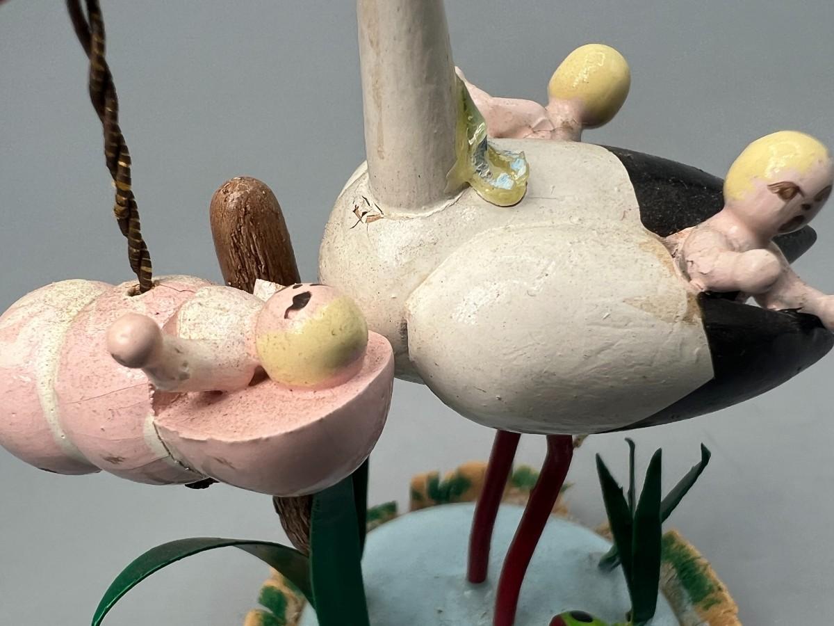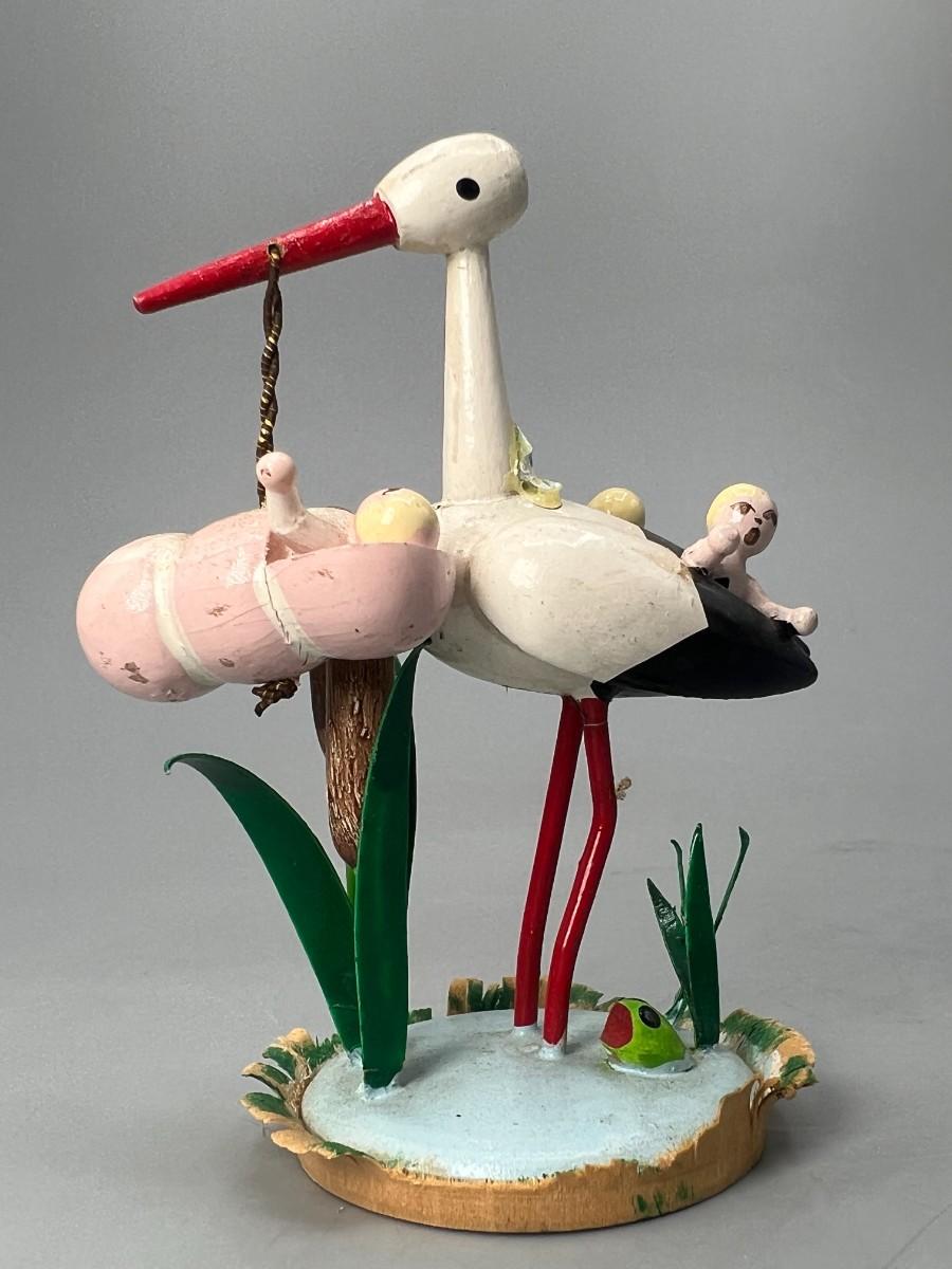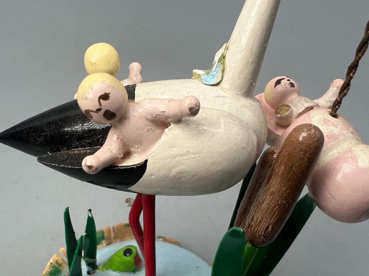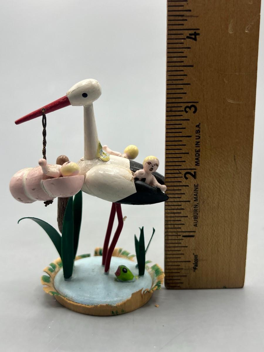 Vintage Figurine Stork Delivering Babies with Cute Frog Wood Figurine