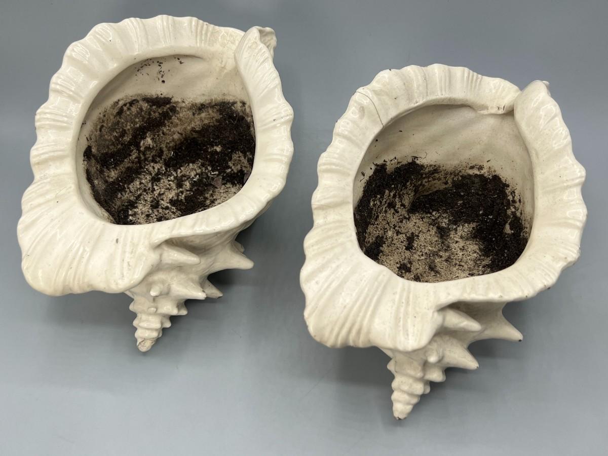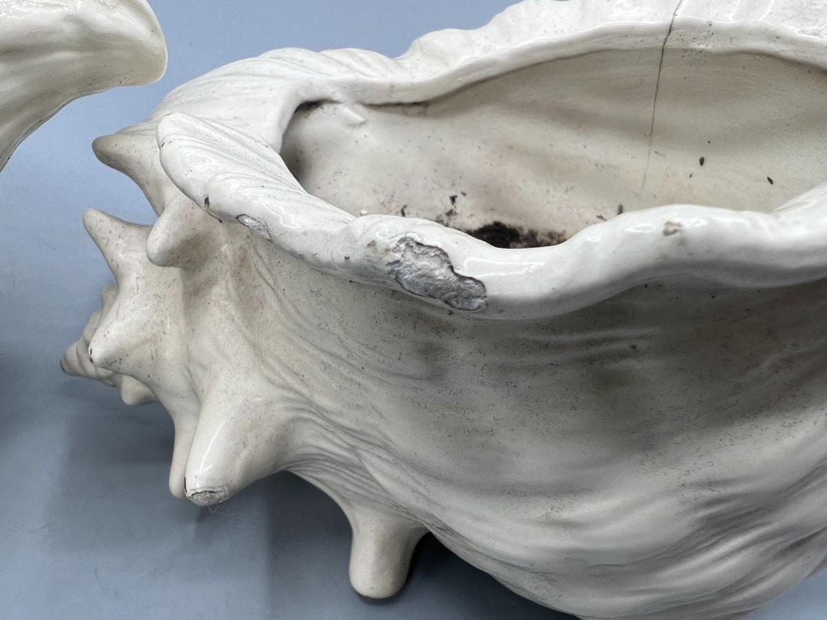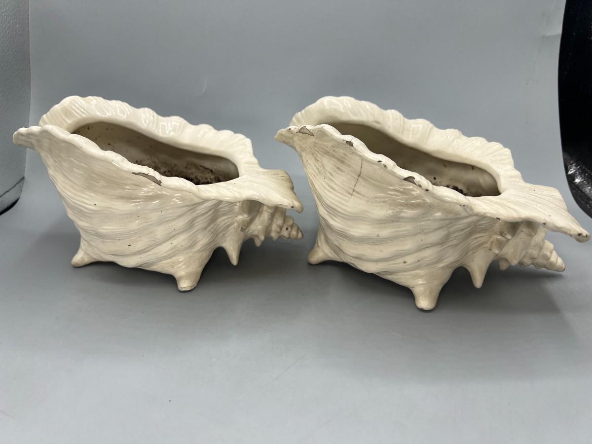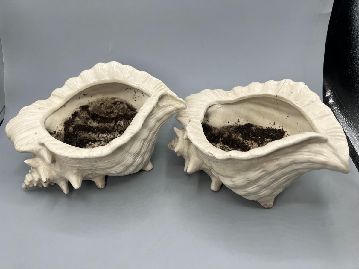 Pair of Ceramic MCM Conch Shell Beach Nautical Flower Pot Planters