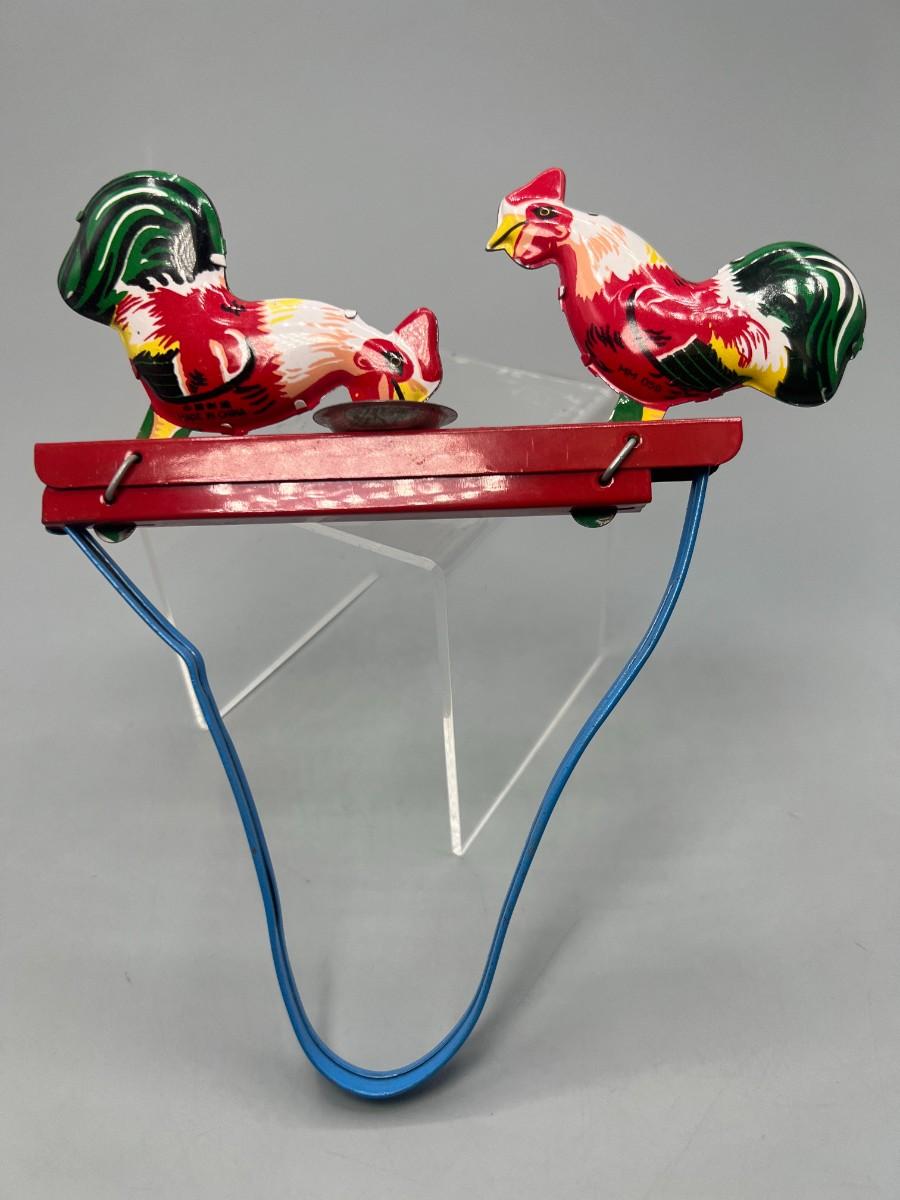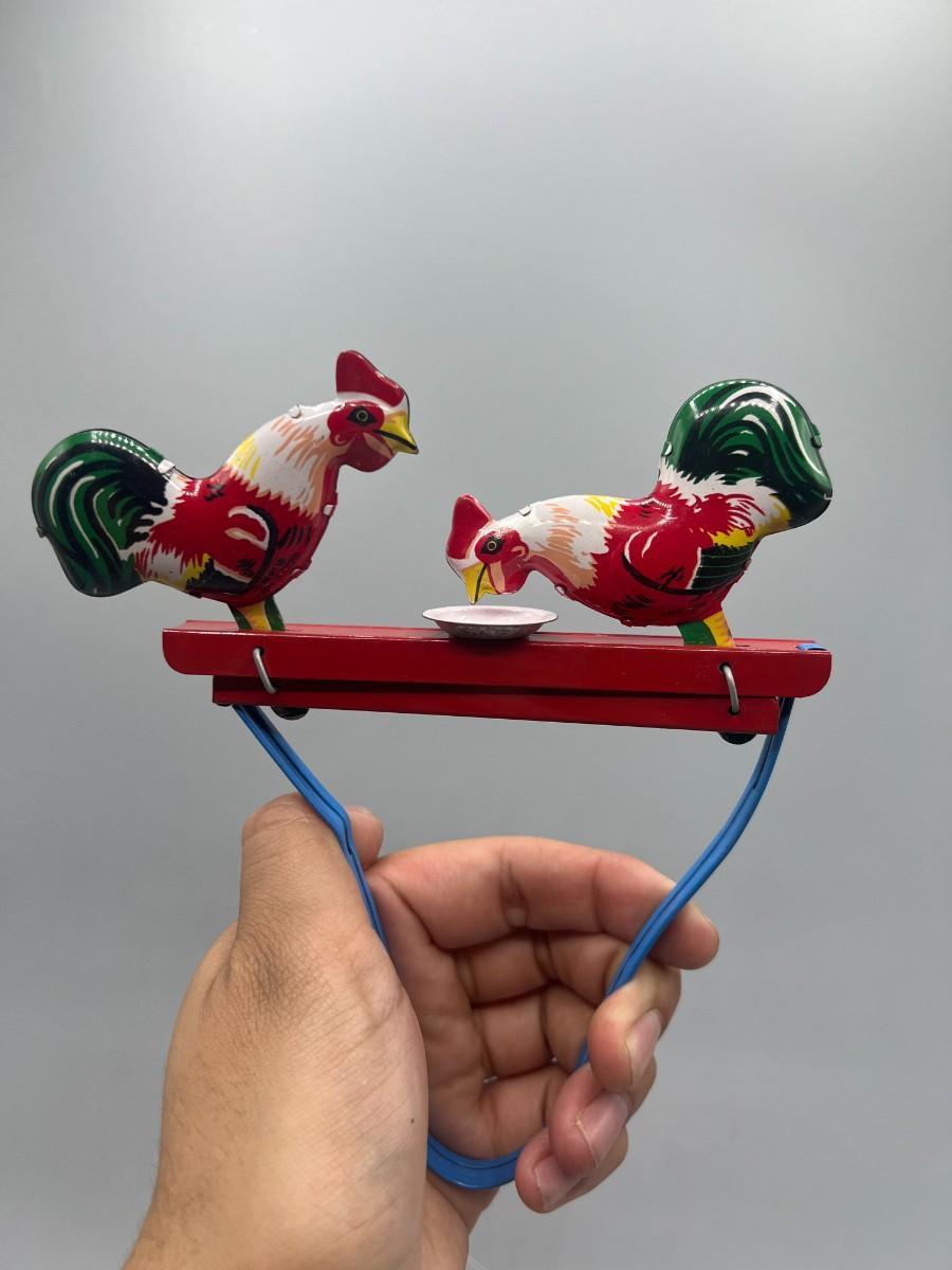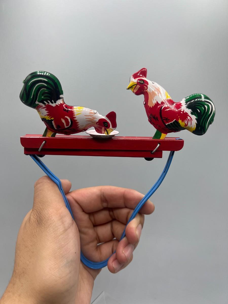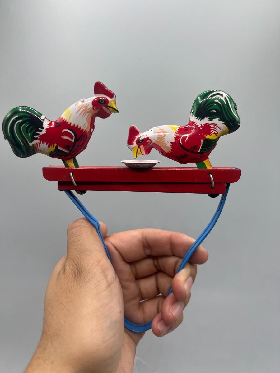 Pecking Roosters Collectible Litho Tin Toys Squeezing Action Toy