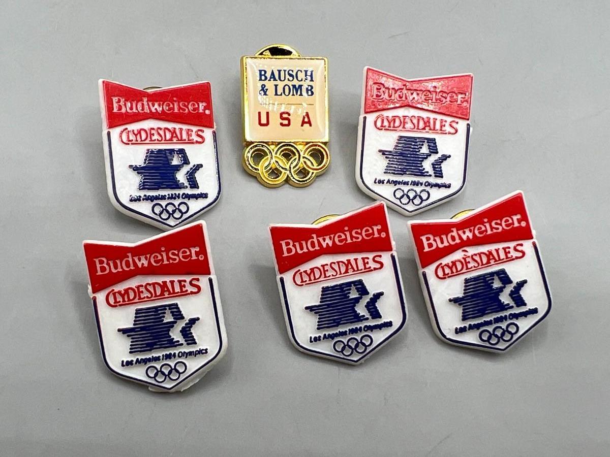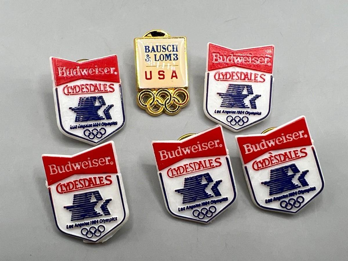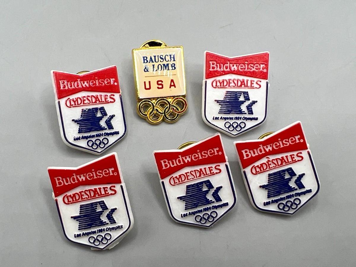 Budweiser Clydesdales Los Angeles 1984 Olympics Plastic Pins & Bausch Lomb USA Pin