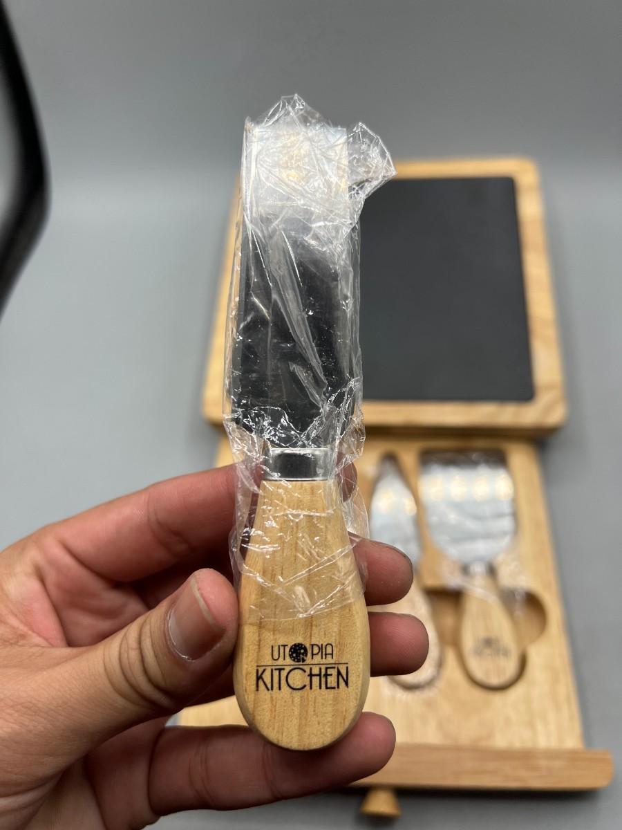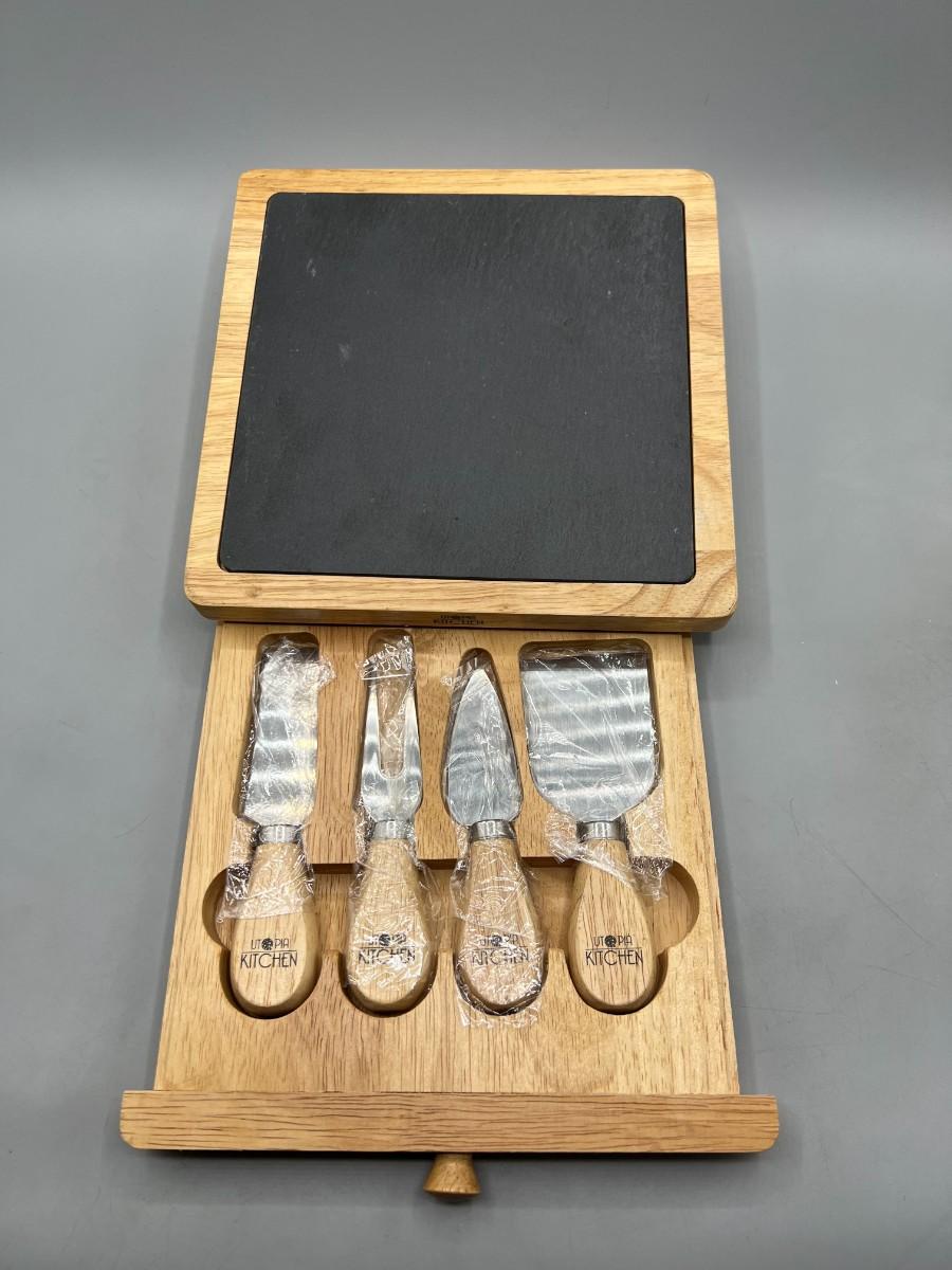 Small Wood Cheese Board with Knives Unused. Knives still in plastic, but no box.